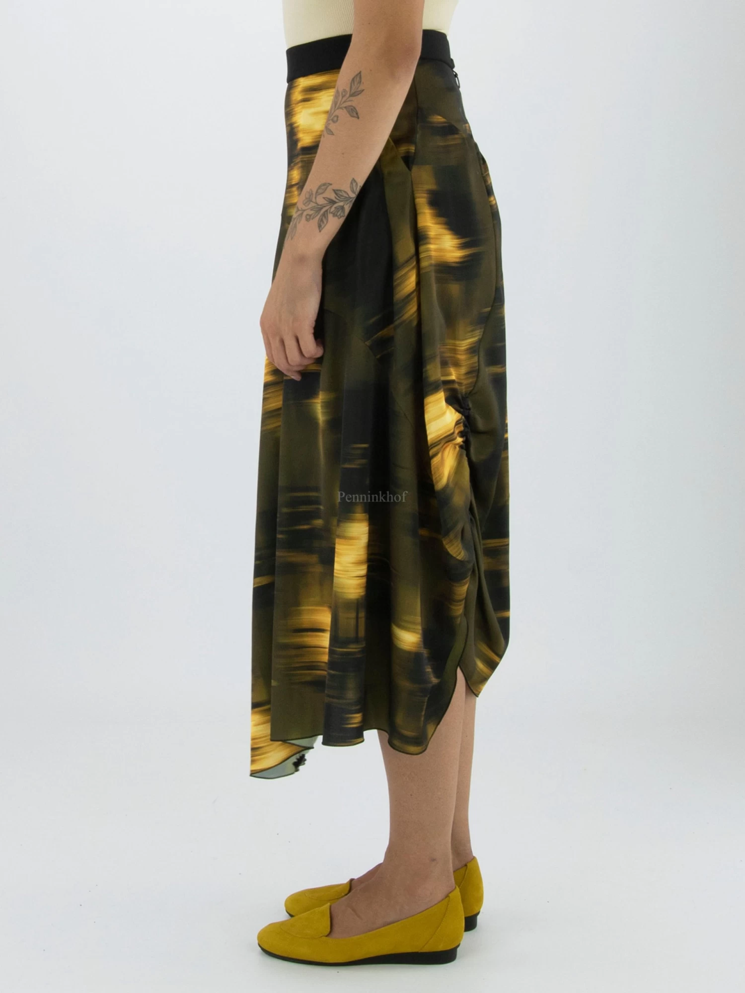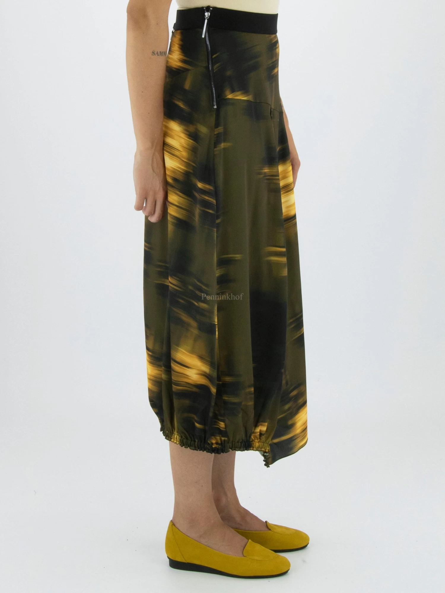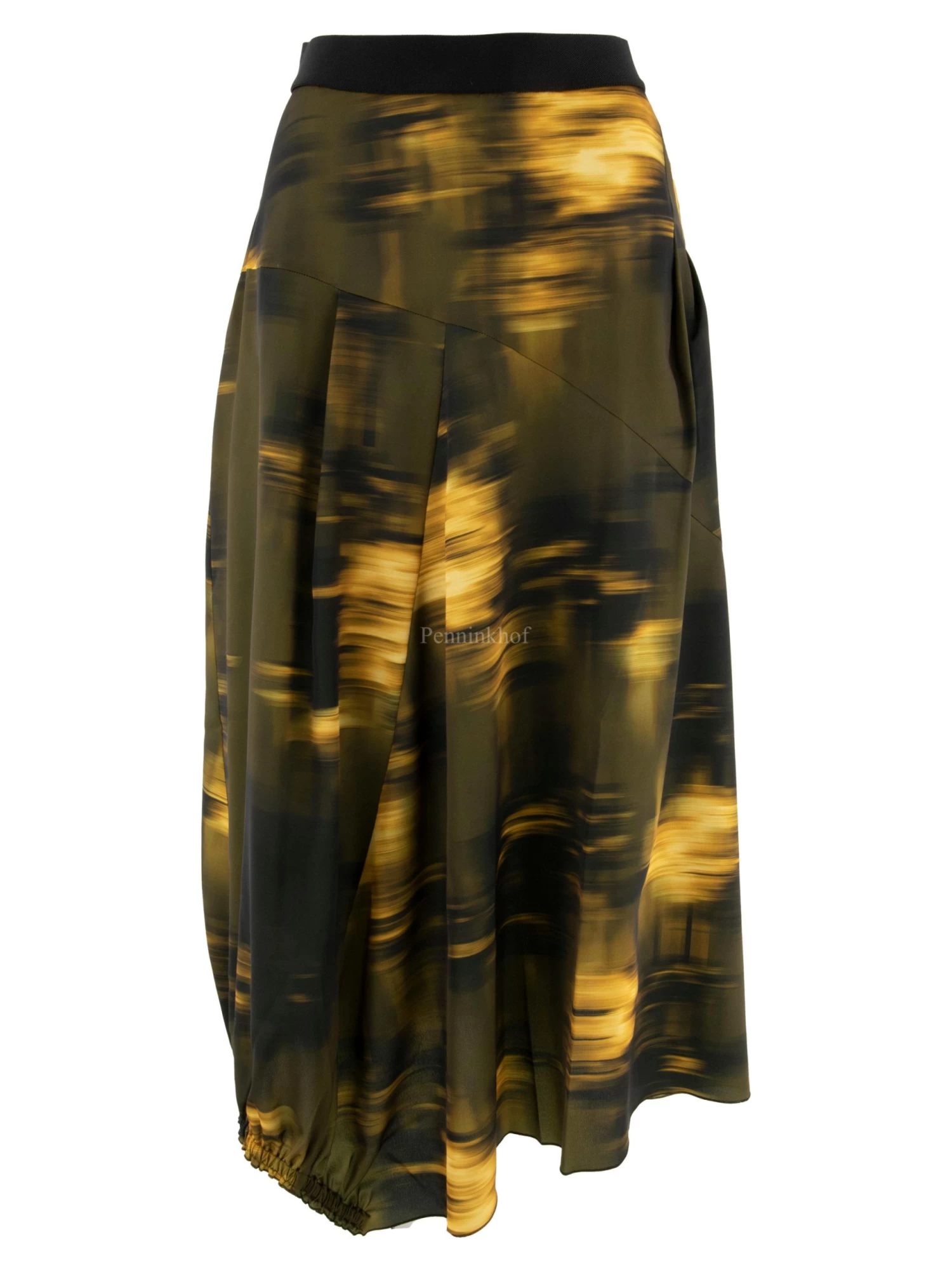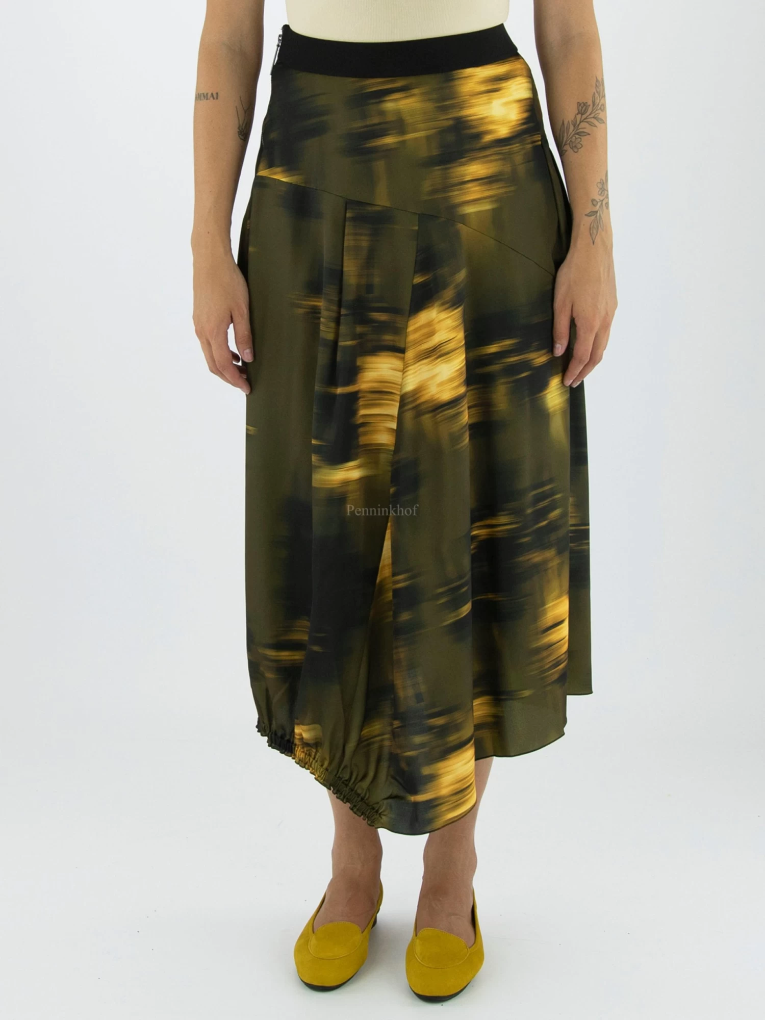 Een rok van High in een grafische print met de kleuren olijfgroen, okergeel en zwart. In de taille is een elastieken band. Aan de achterkant is aan de linker zijde een verticale fijn geplooide stiknaad vanaf kniehoogte naar beneden. Aan de rachter zijkant is vanuit de taille een rits en aan de linker zijde een steekzak. Deze rok mag op de hand worden gewassen.