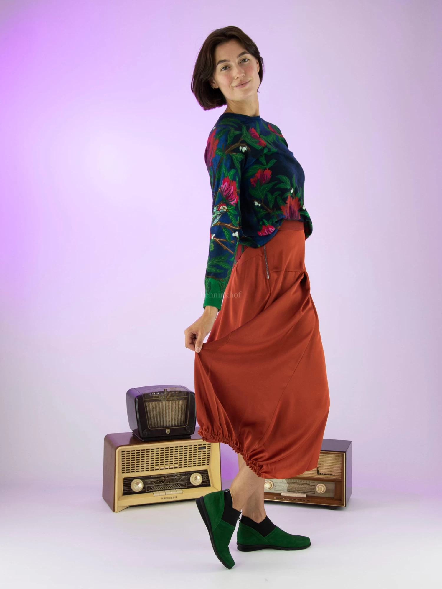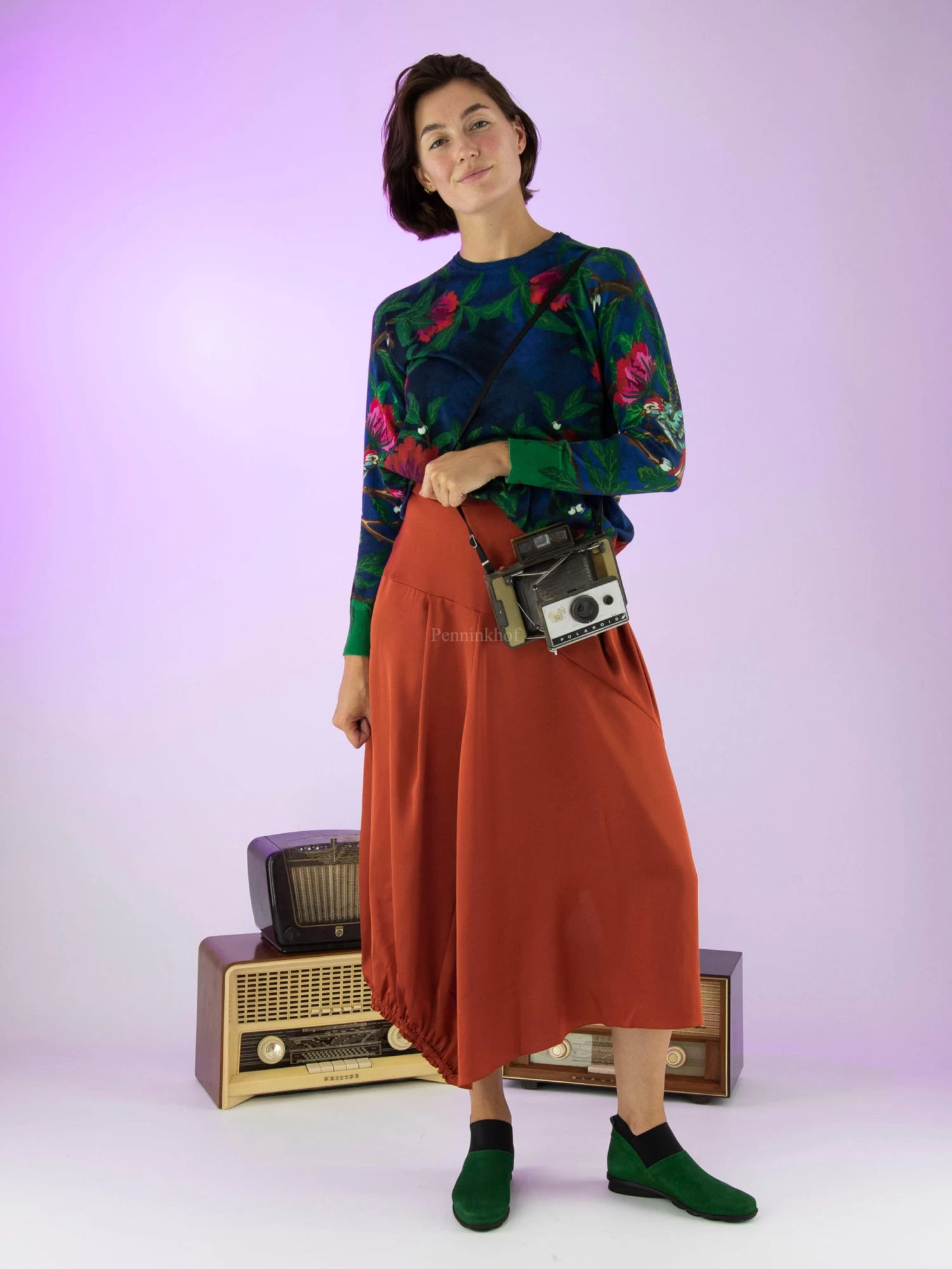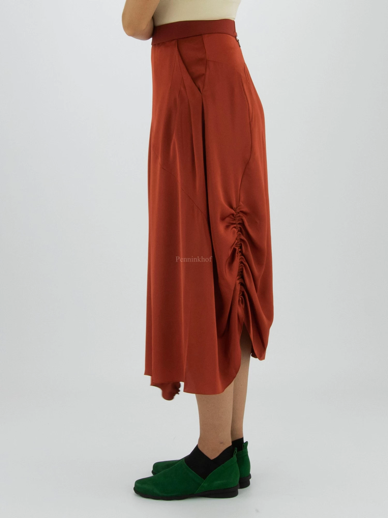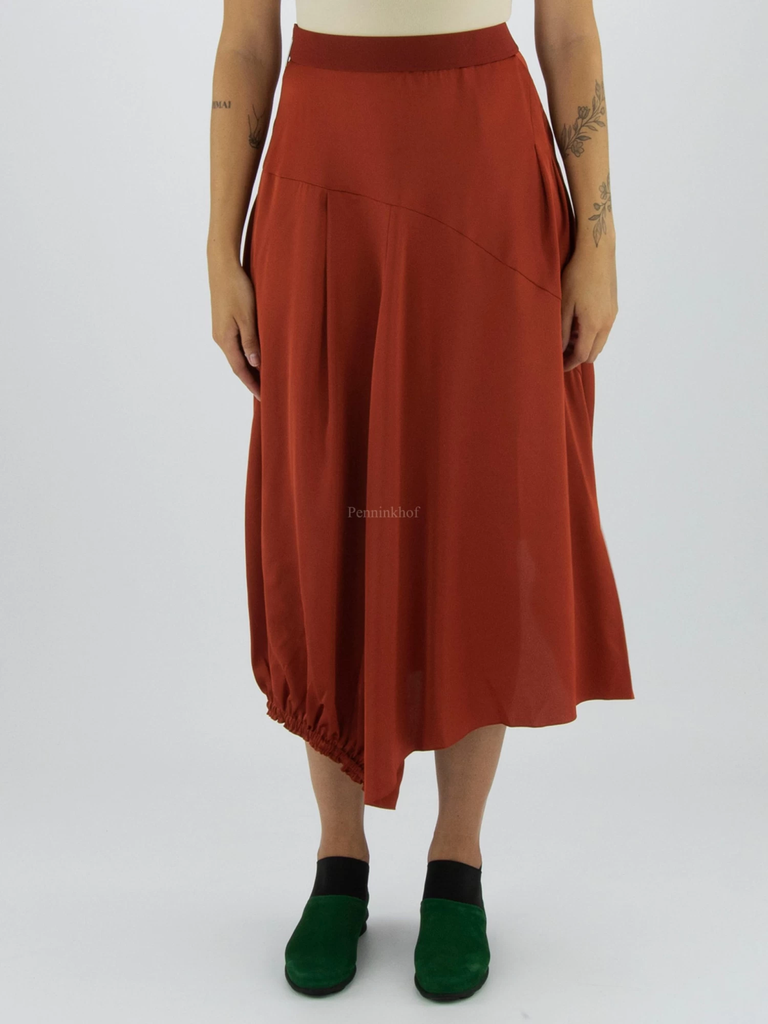 Een rok van High in een roest kleur. In de taille is een elastieken band. Aan de achterkant is aan de linker zijde een verticale fijn geplooide stiknaad vanaf kniehoogte naar beneden. Aan de rachter zijkant is vanuit de taille een rits en aan de linker zijde een steekzak. Deze rok mag op de hand worden gewassen.
