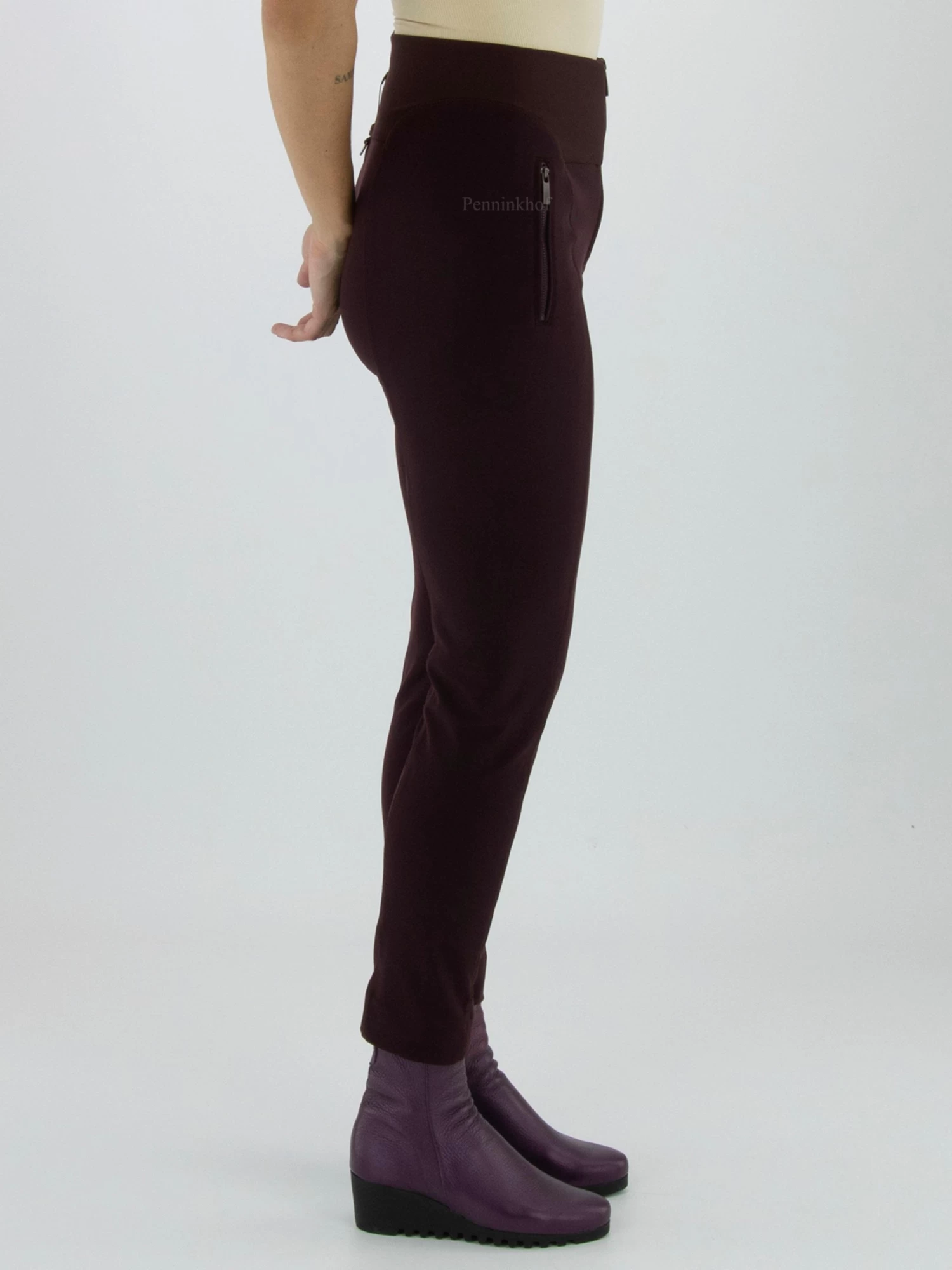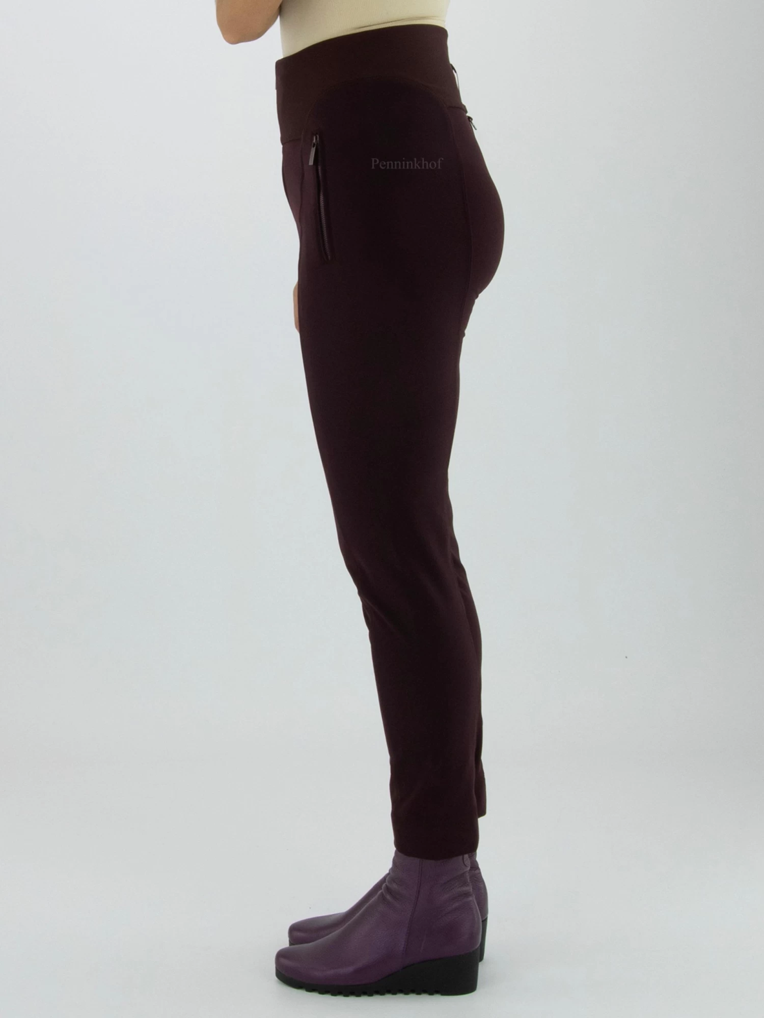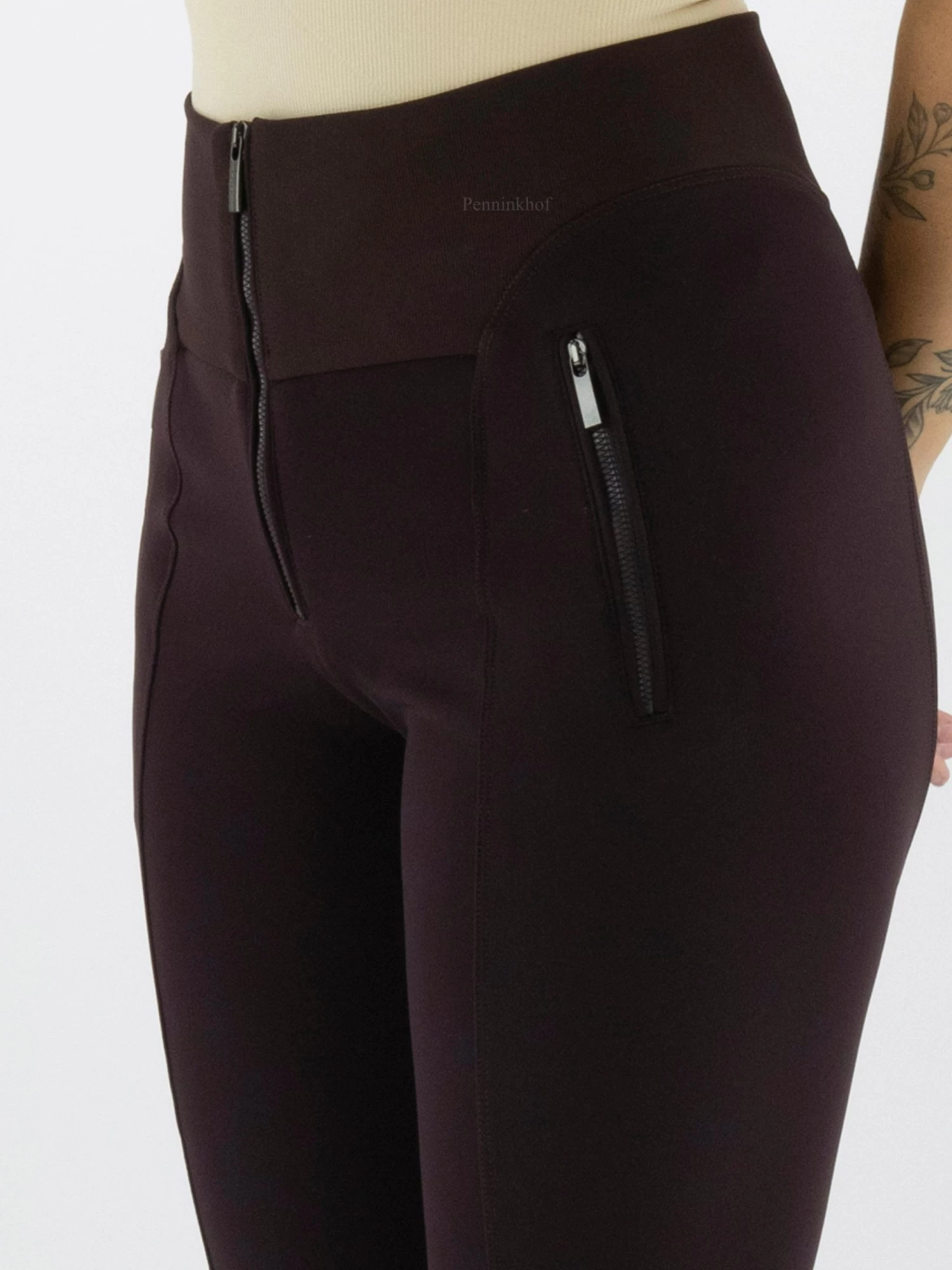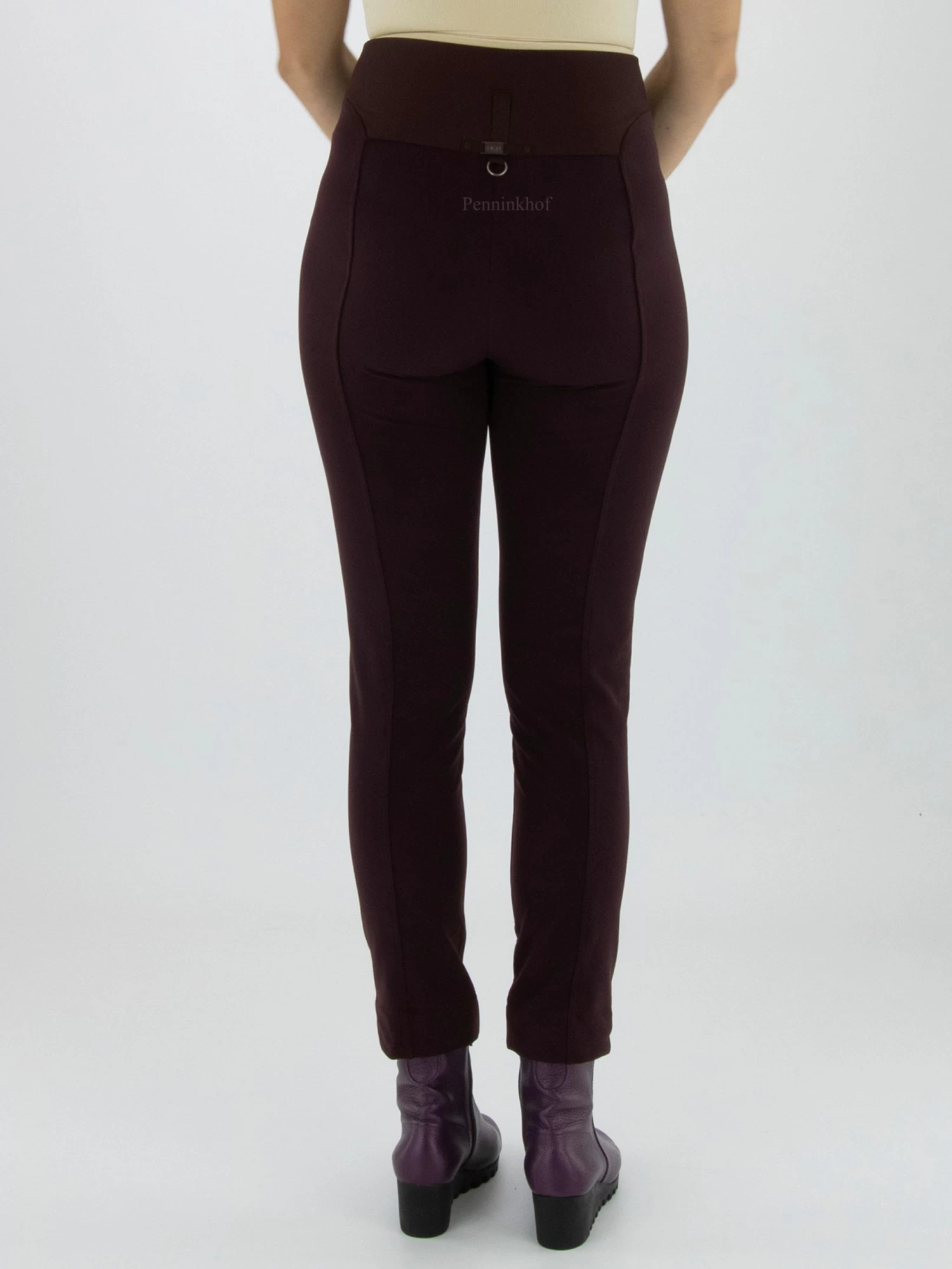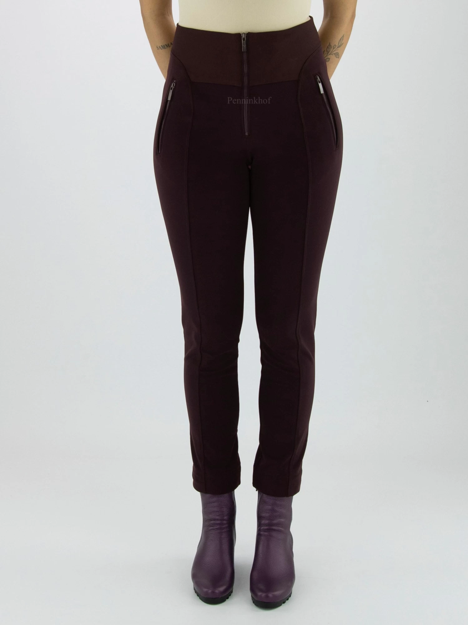 Een gewatteerde broek van High in de kleur aubergine. In het midden van de hoge brede tailleband is een ton sur ton rits. De steekzakken hebben tevens een ton sur ton rits. Deze broek mag op de hand worden gewassen.