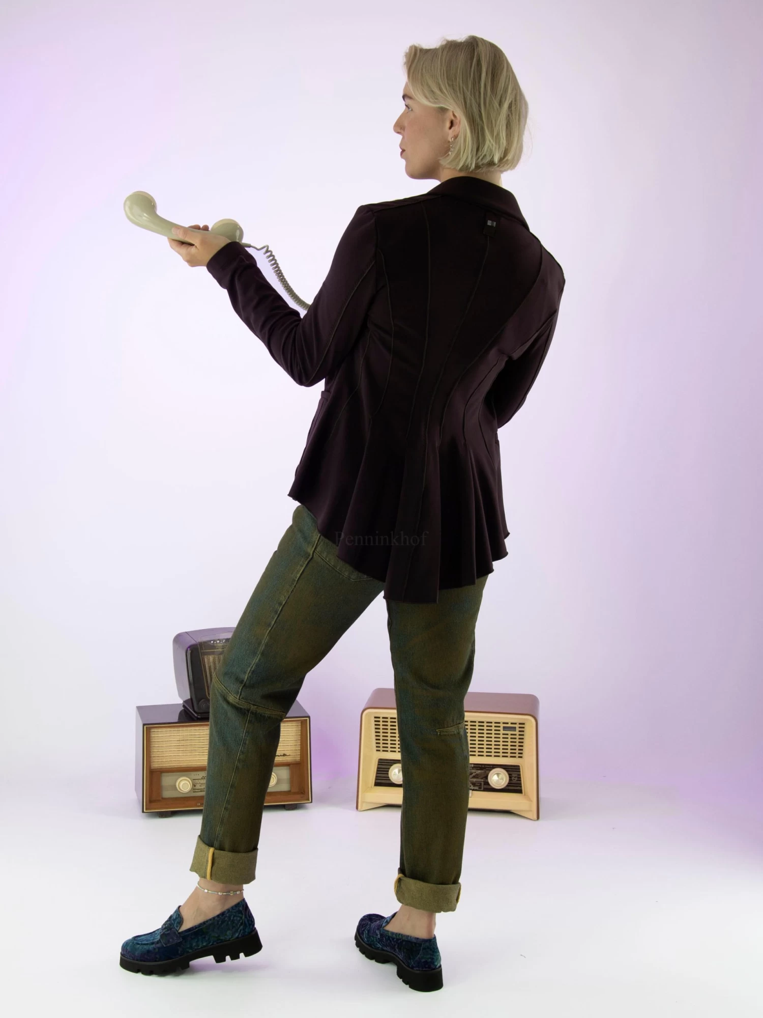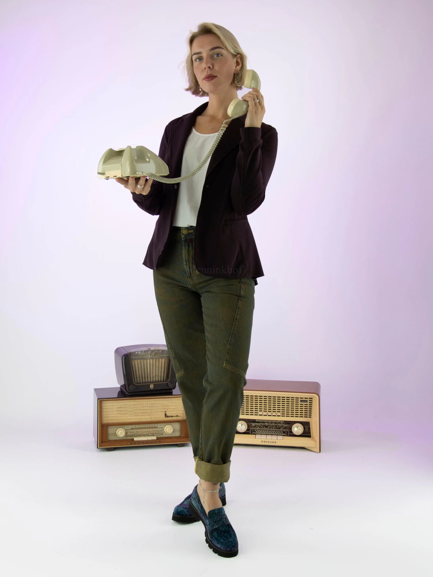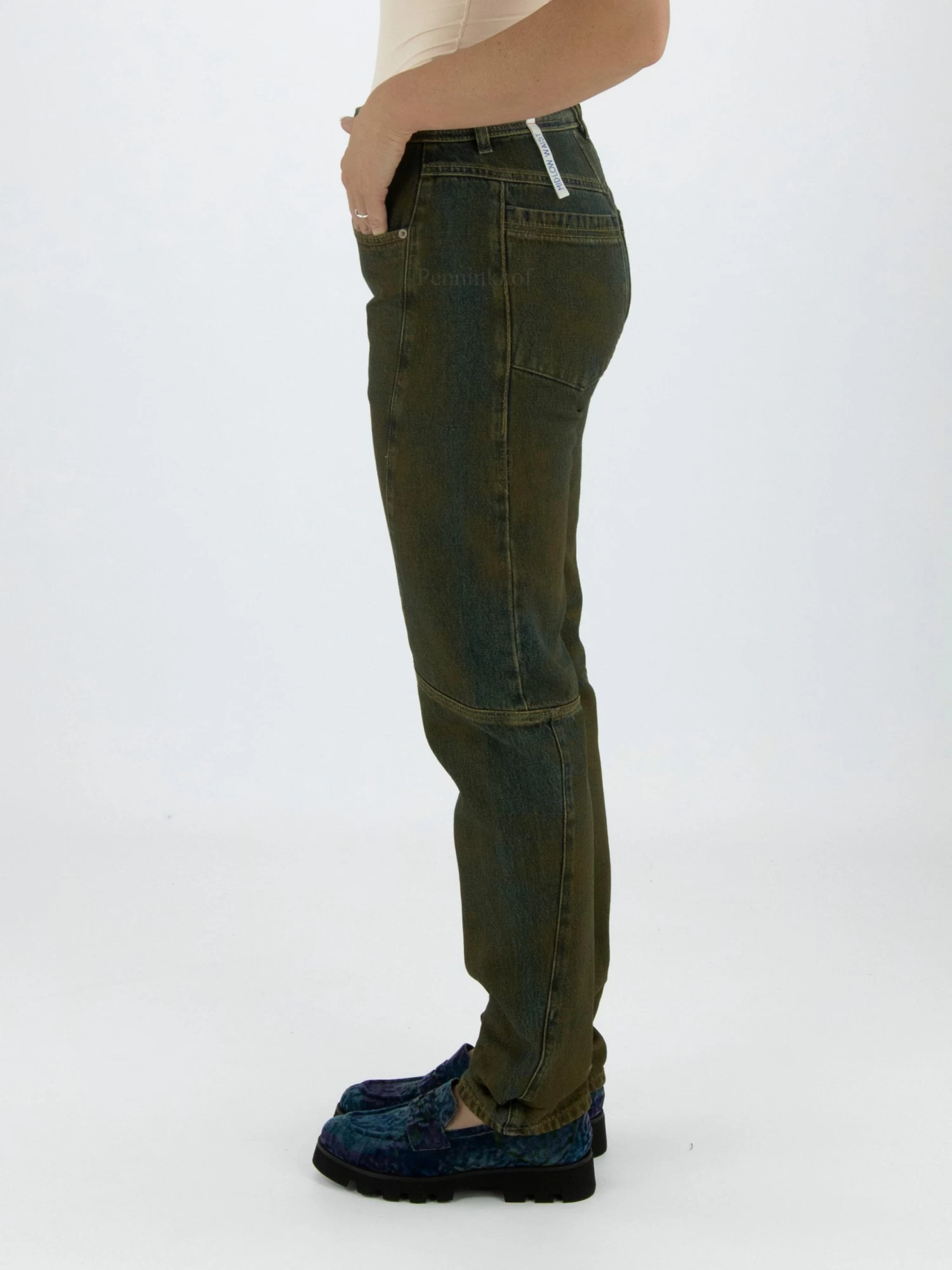 Een jeans van High in een gemêleerde groene kleur met als ondergrond jeansblauw.Vanuit de zijkant van de taille is een stiknaad neer het midden ter hoogte van de knie. Deze jeans mag op de hand worden gewassen.