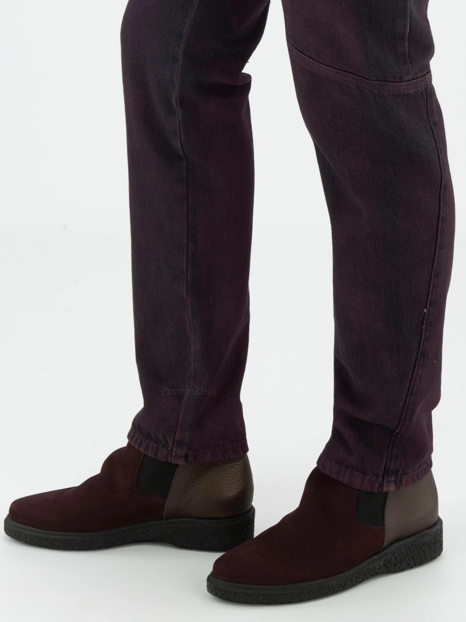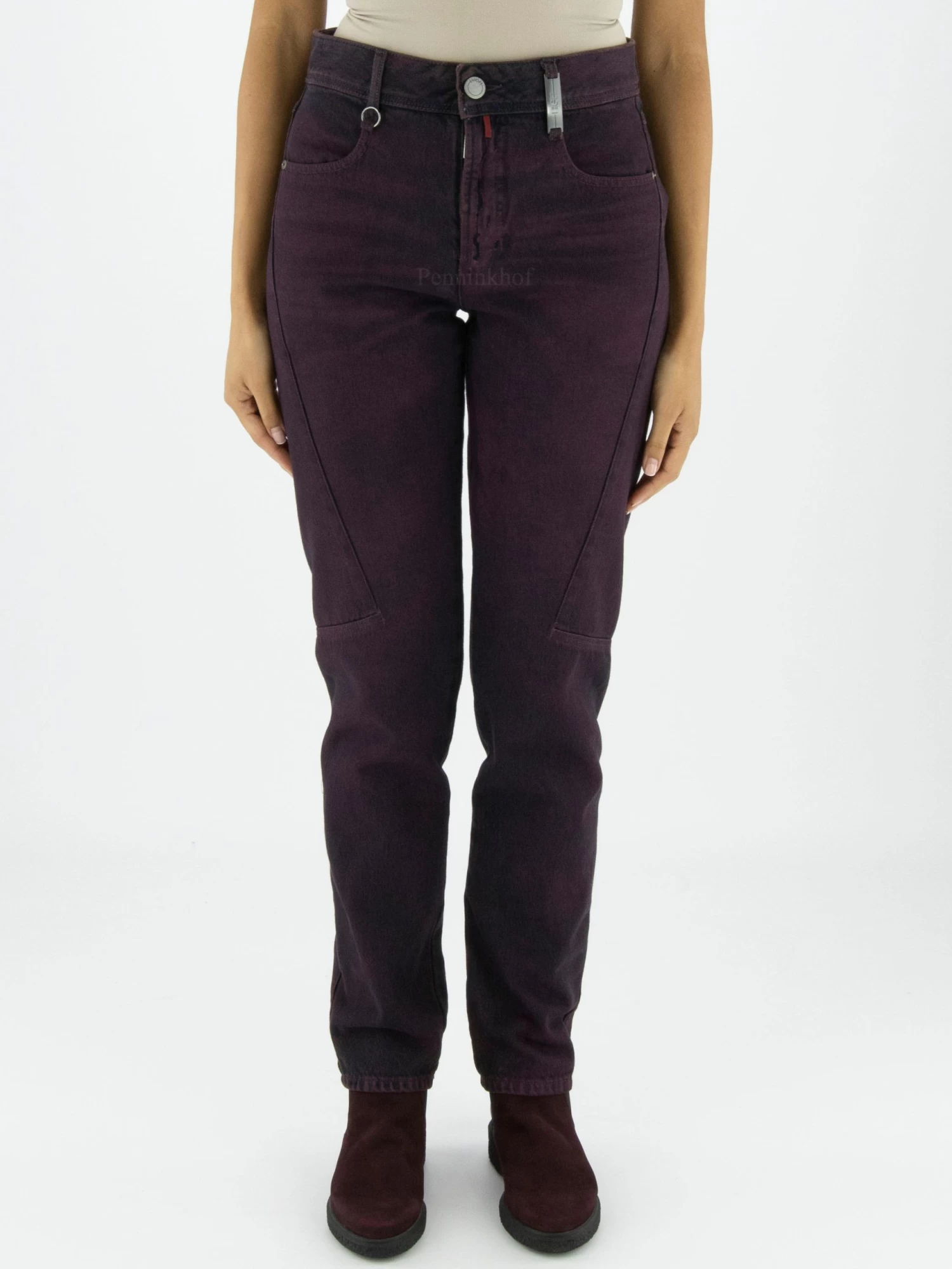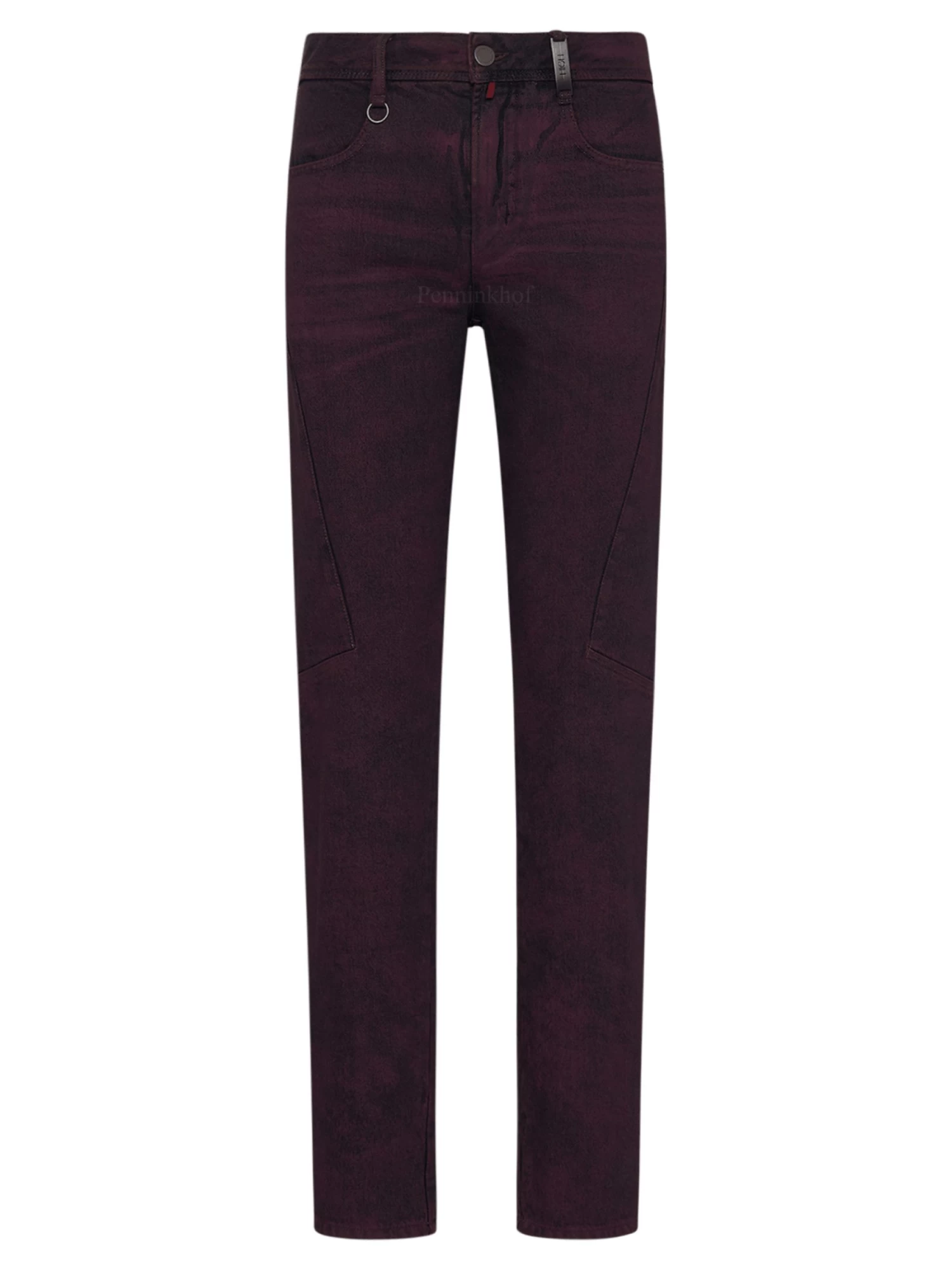Een jeans van High in een gemêleerde bordeauxrode kleur met als ondergrond dark denim. Vanuit de zijkant van de taille is een stiknaad neer het midden ter hoogte van de knie. Deze jeans mag op de hand worden gewassen.
