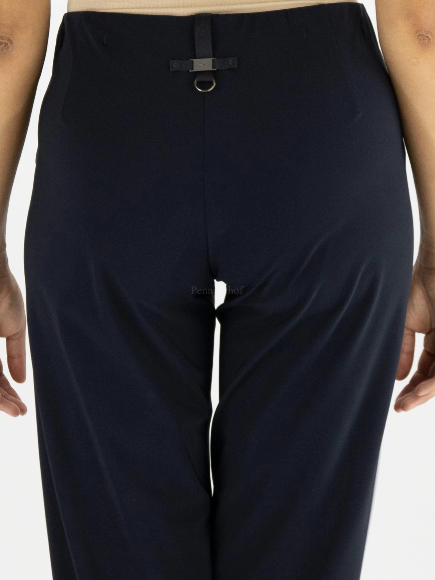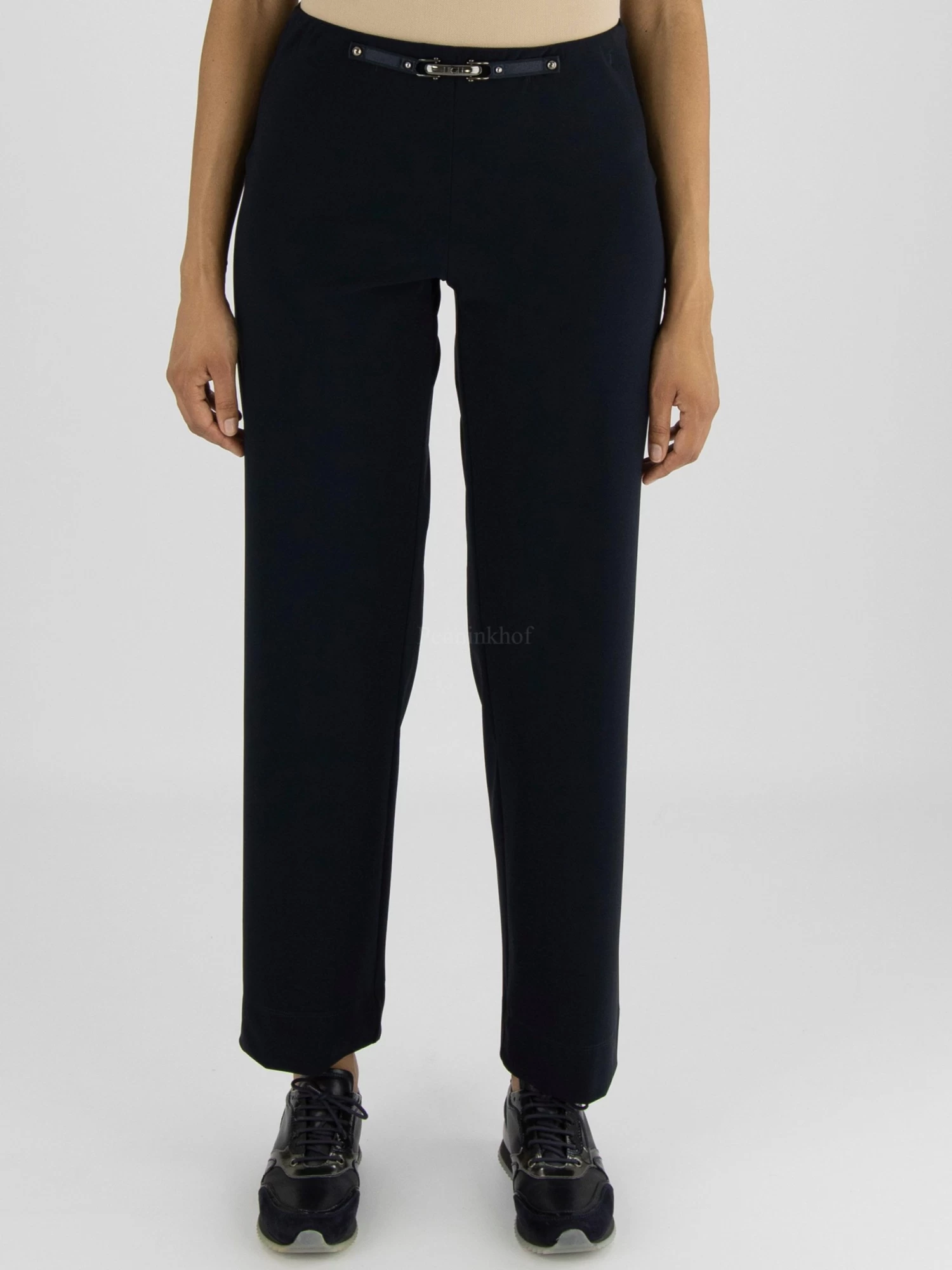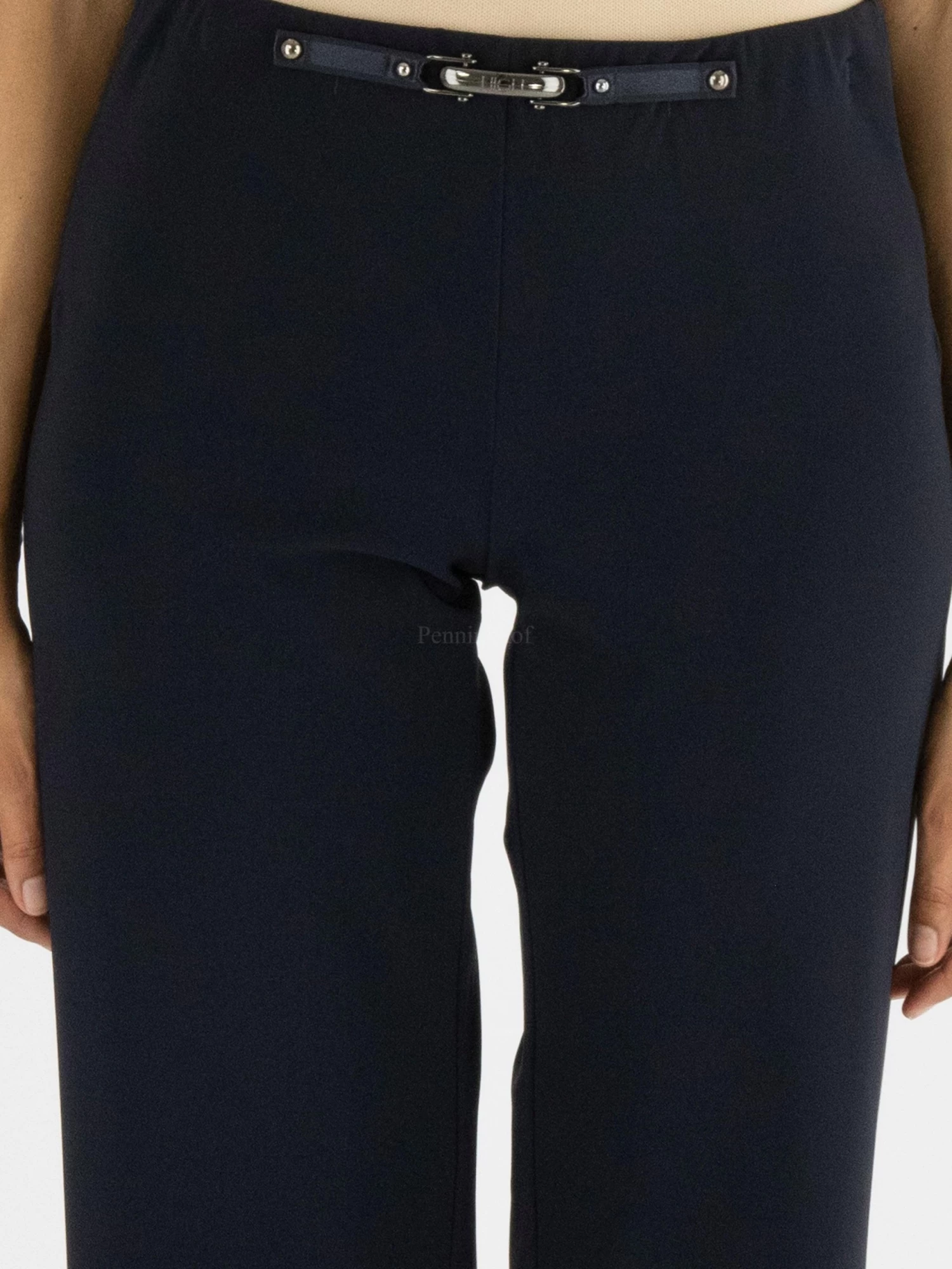 Een broek van High in de kleur marineblauw. In de taille is een elastieken band. Aan de voorzijde is ter hoogte van de taille een decoratieve nikkel kleurige gesp met 2 studs. Deze broek mag op 30 graden worden gewassen.