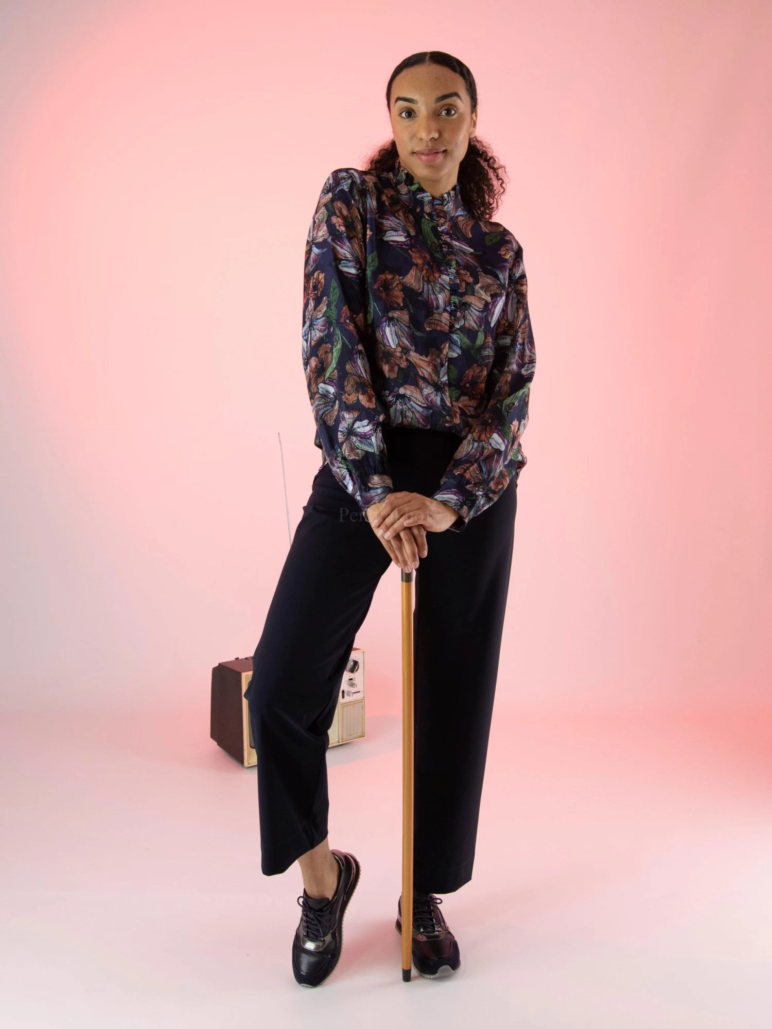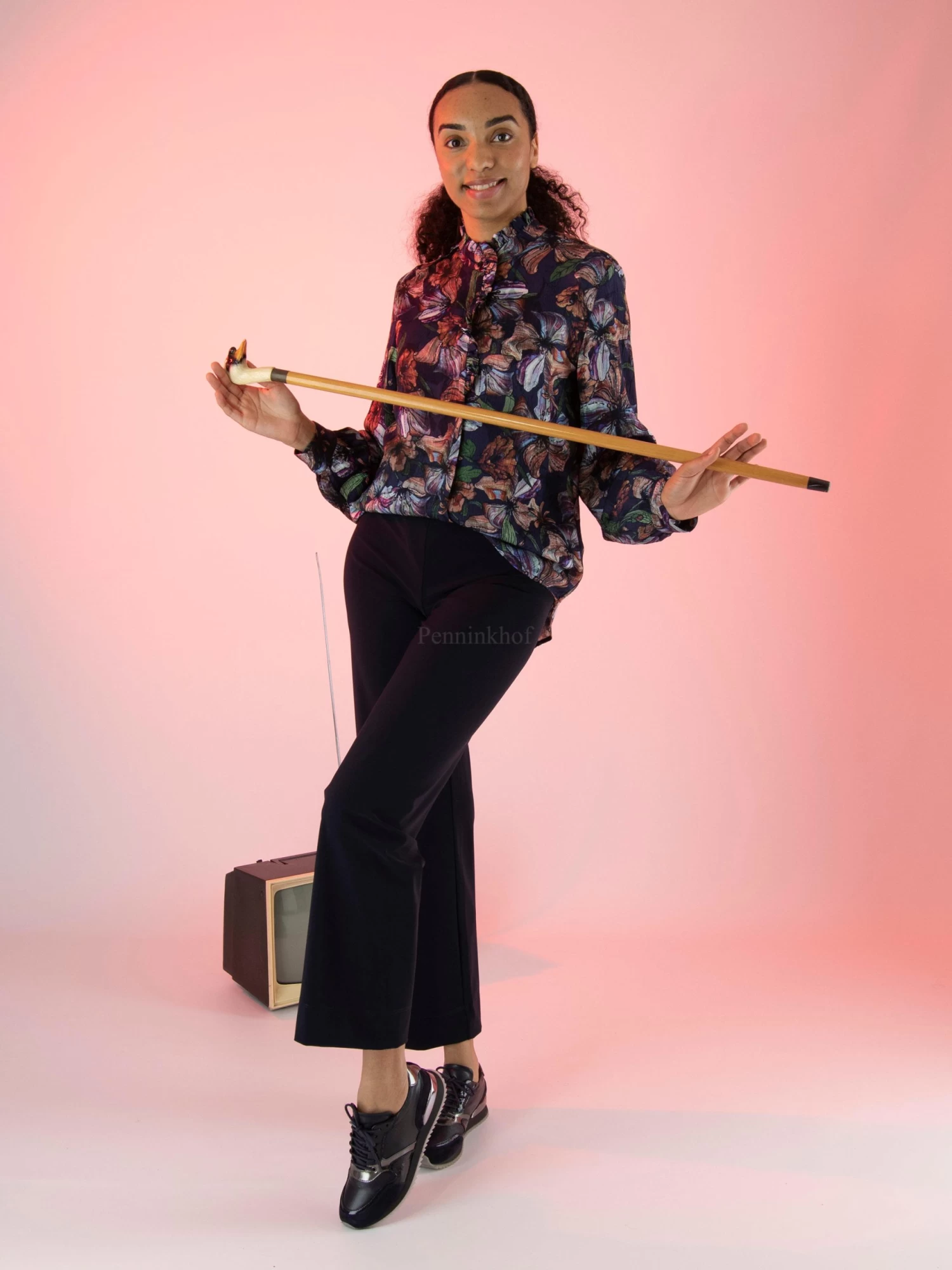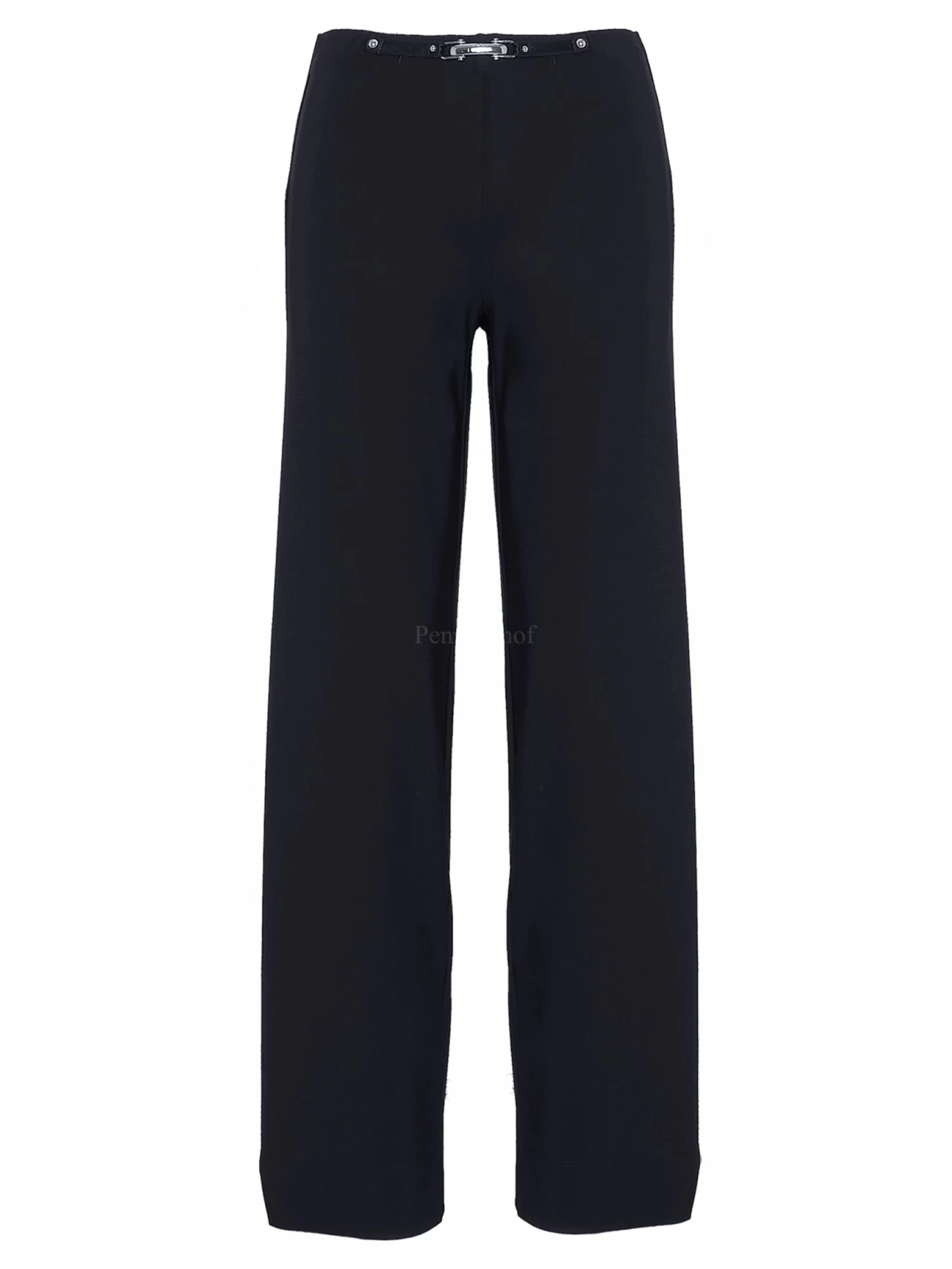 Een broek van High in de kleur marineblauw. In de taille is een elastieken band. Aan de voorzijde is ter hoogte van de taille een decoratieve nikkel kleurige gesp met 2 studs. Deze broek mag op 30 graden worden gewassen.