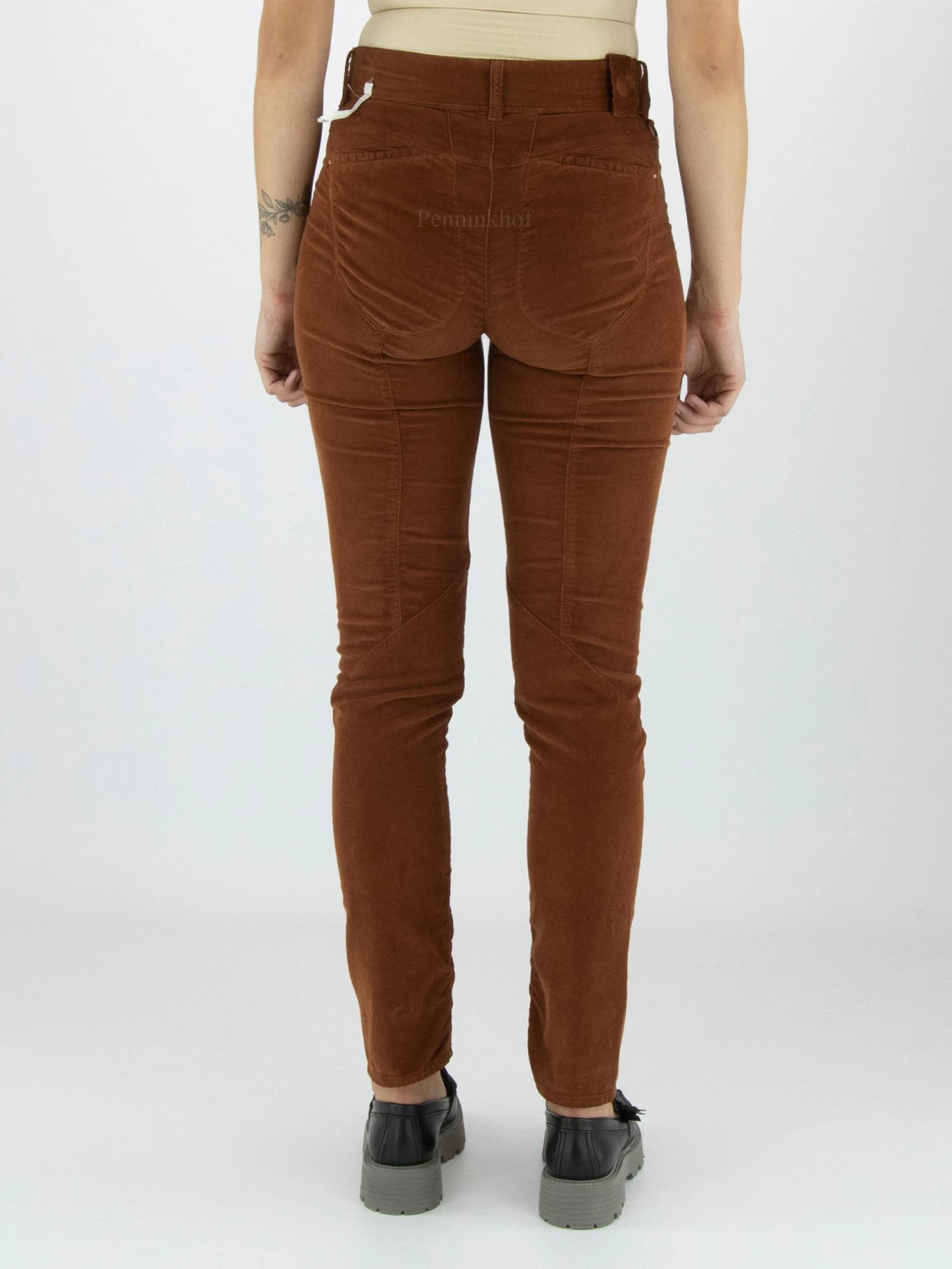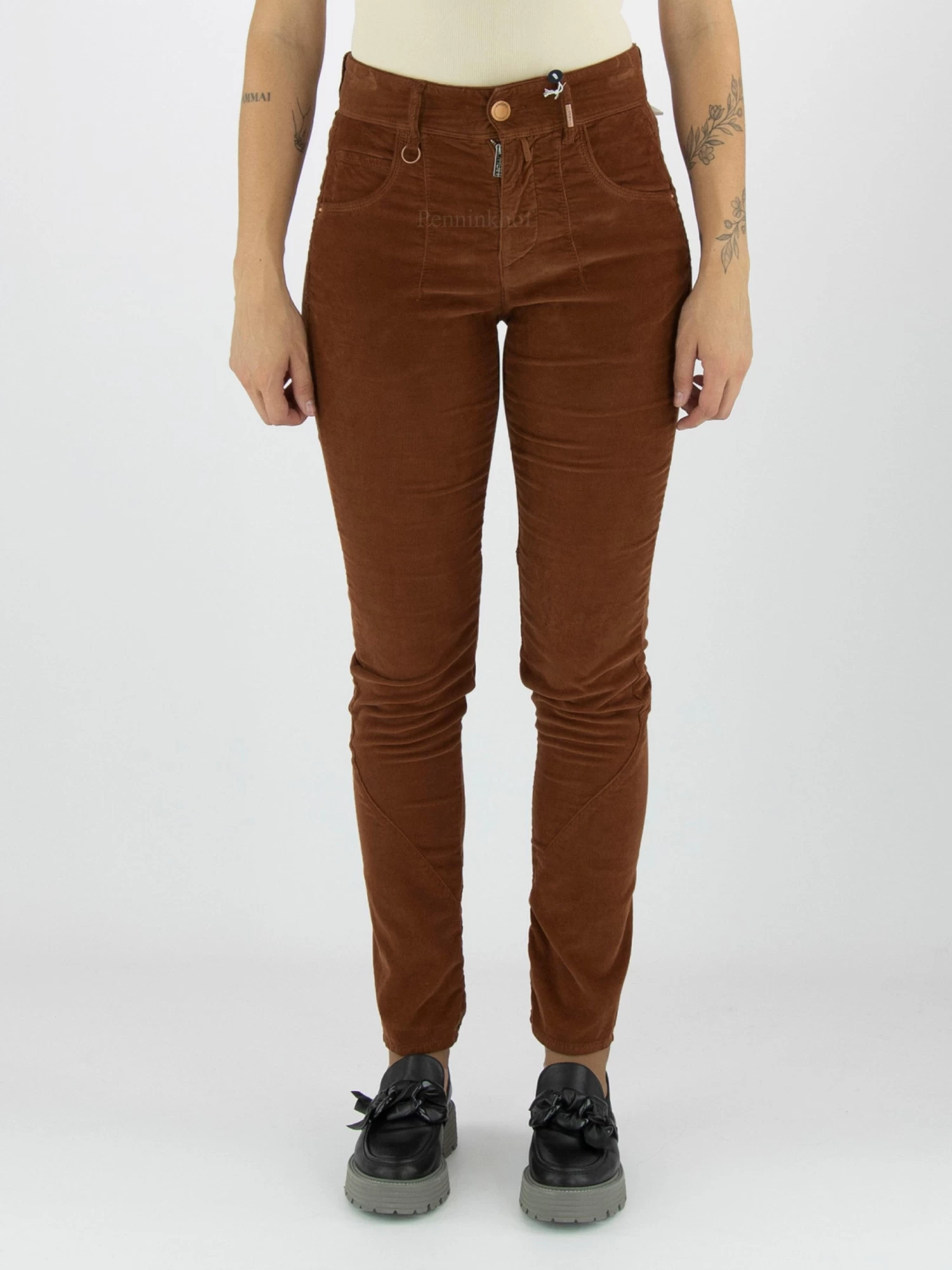 Een rib cord broek van High in een cognac kleur. De broek is in een 5 pocket model en heeft enkele decoratieve stiknaden. Deze broek mag op 30 graden worden gewassen.