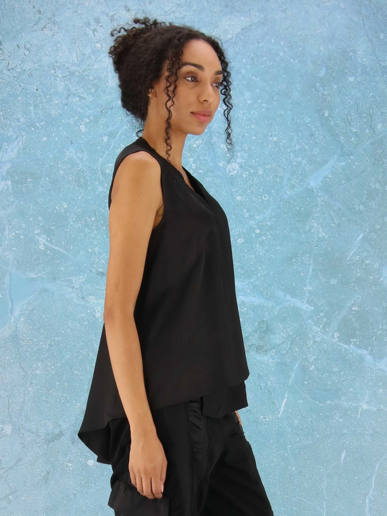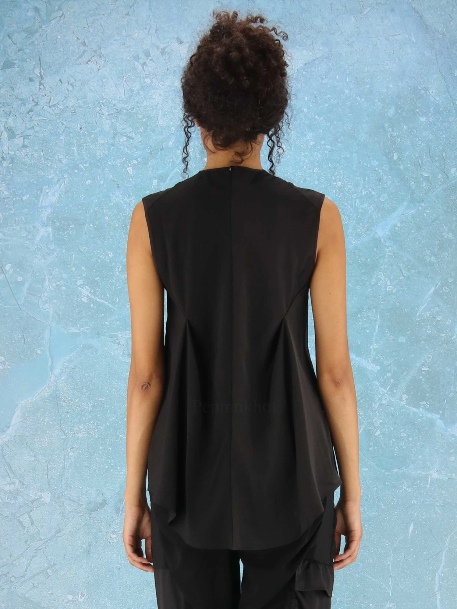 Een overslag top van High in de kleur zwart. Boven de buste is een broderie structuur in de vorm van bloemen. Deze top mag op de hand worden gewassen.