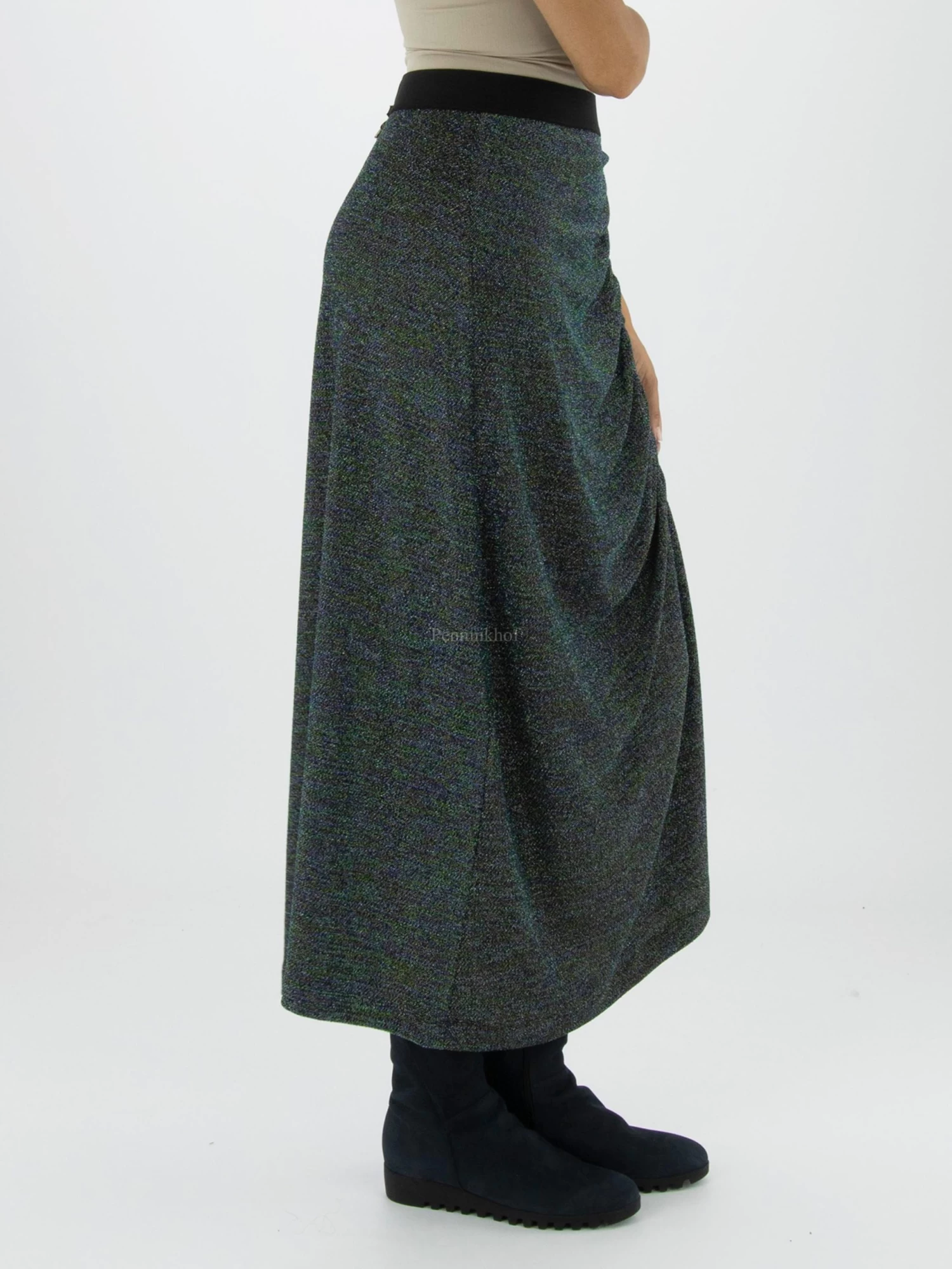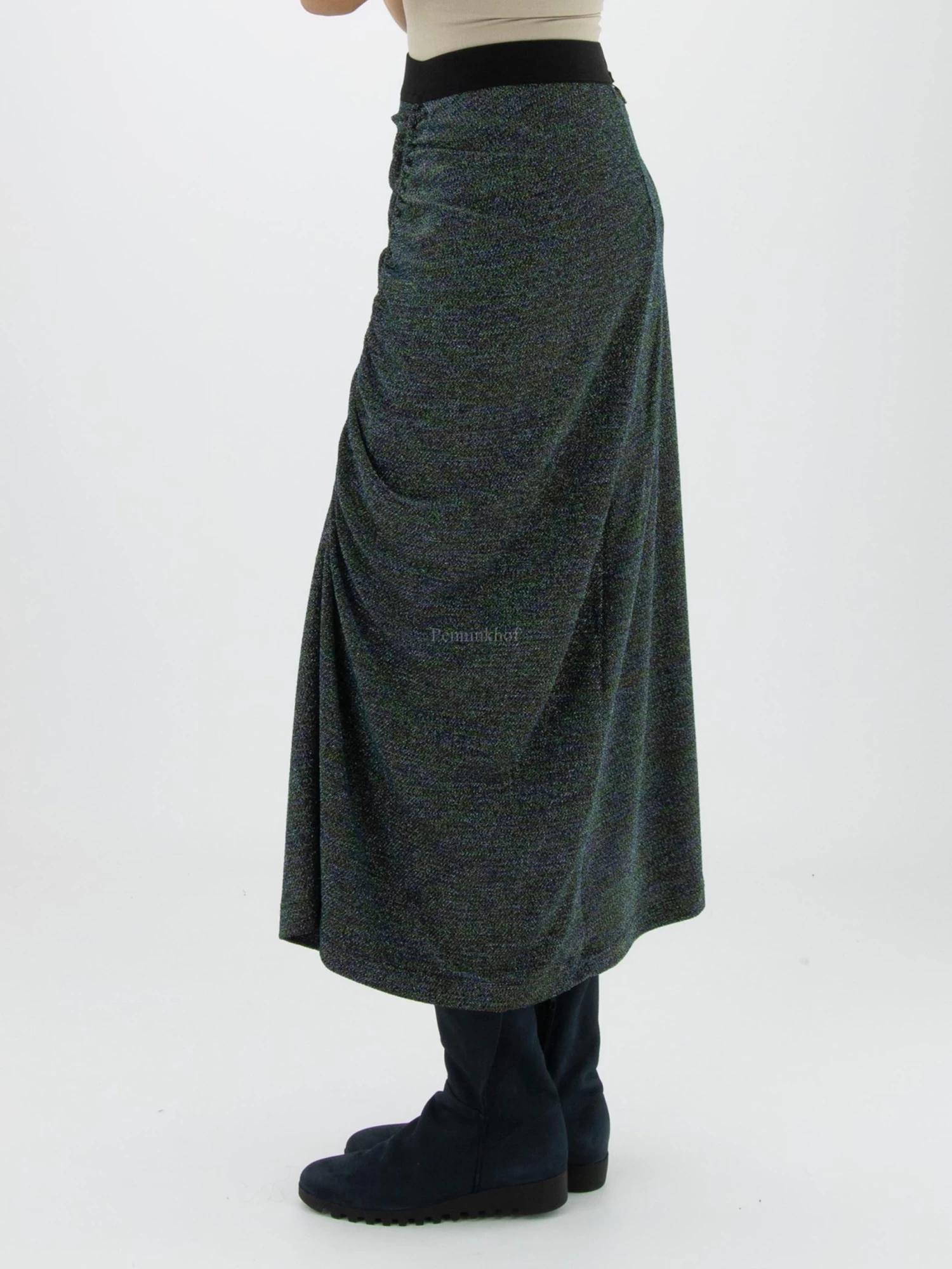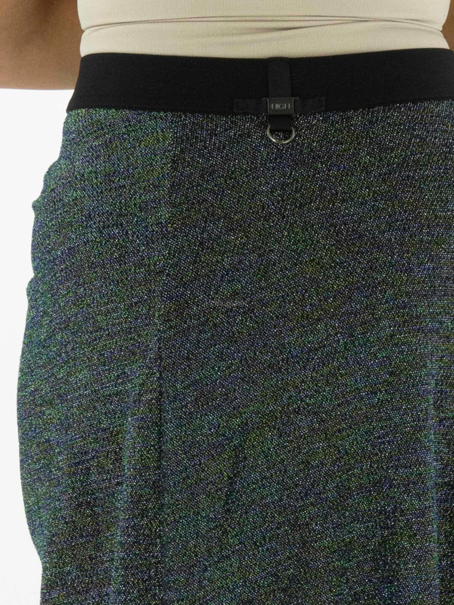 Een lurex rok van High met meerdere kleuren in de stof zoals blauw, zilver, groen, goud en zwart. In de taille is een elastieken band. Aan de voorkant is in het midden een verticale stiknaad waarlangs de stof geplooid is wat een drapeer effect geeft. Deze rok mag op de hand worden gewassen.