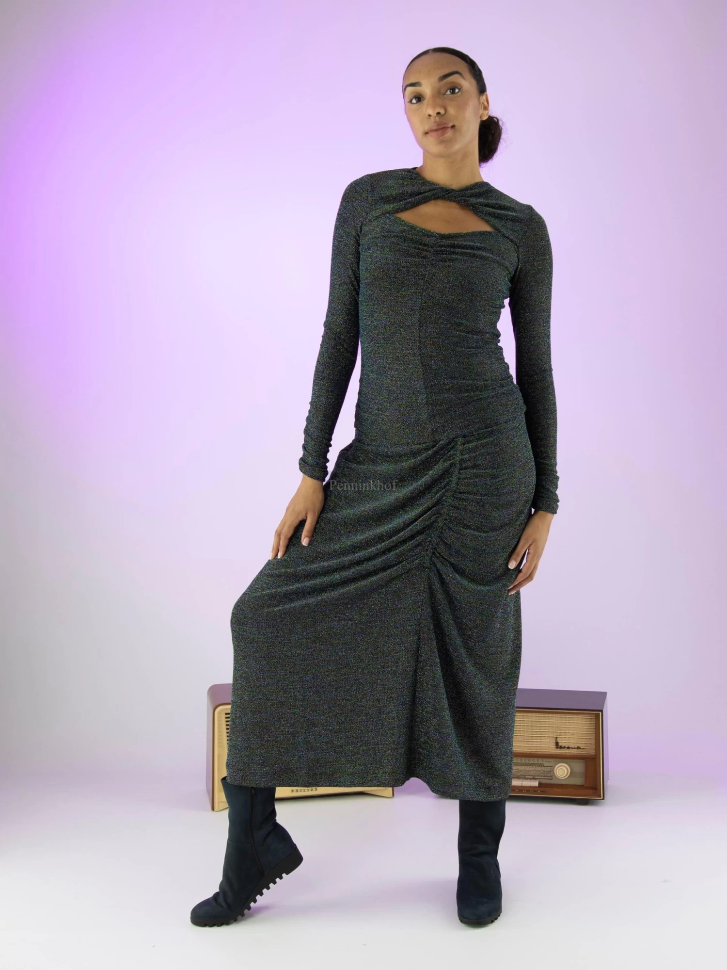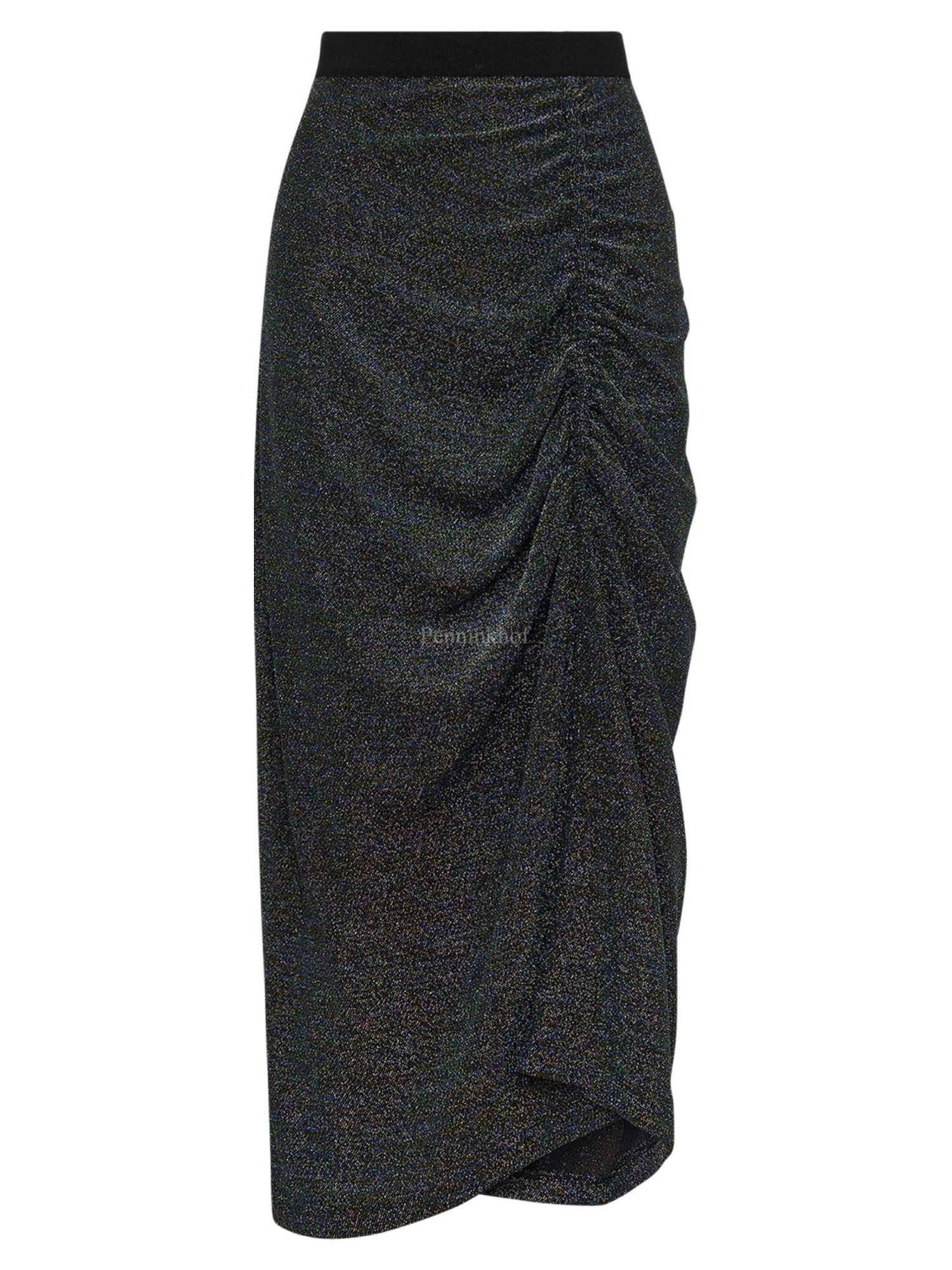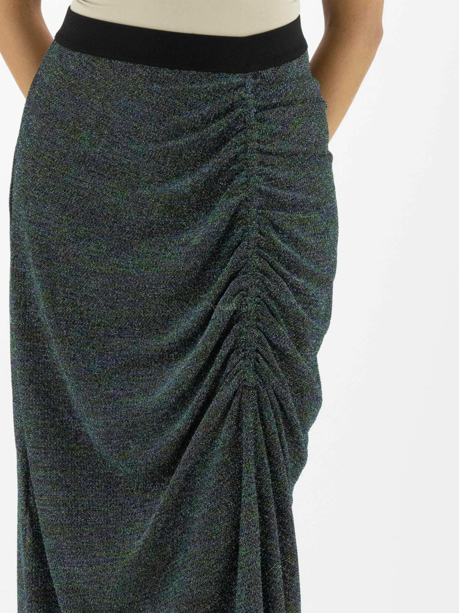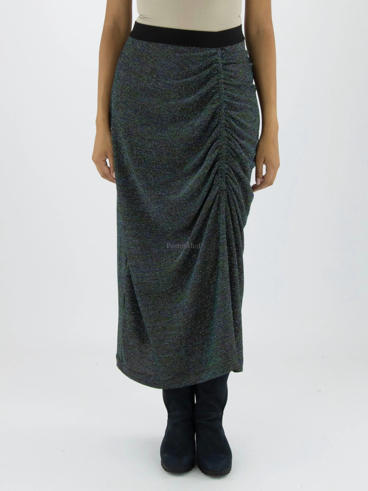 Een lurex rok van High met meerdere kleuren in de stof zoals blauw, zilver, groen, goud en zwart. In de taille is een elastieken band. Aan de voorkant is in het midden een verticale stiknaad waarlangs de stof geplooid is wat een drapeer effect geeft. Deze rok mag op de hand worden gewassen.