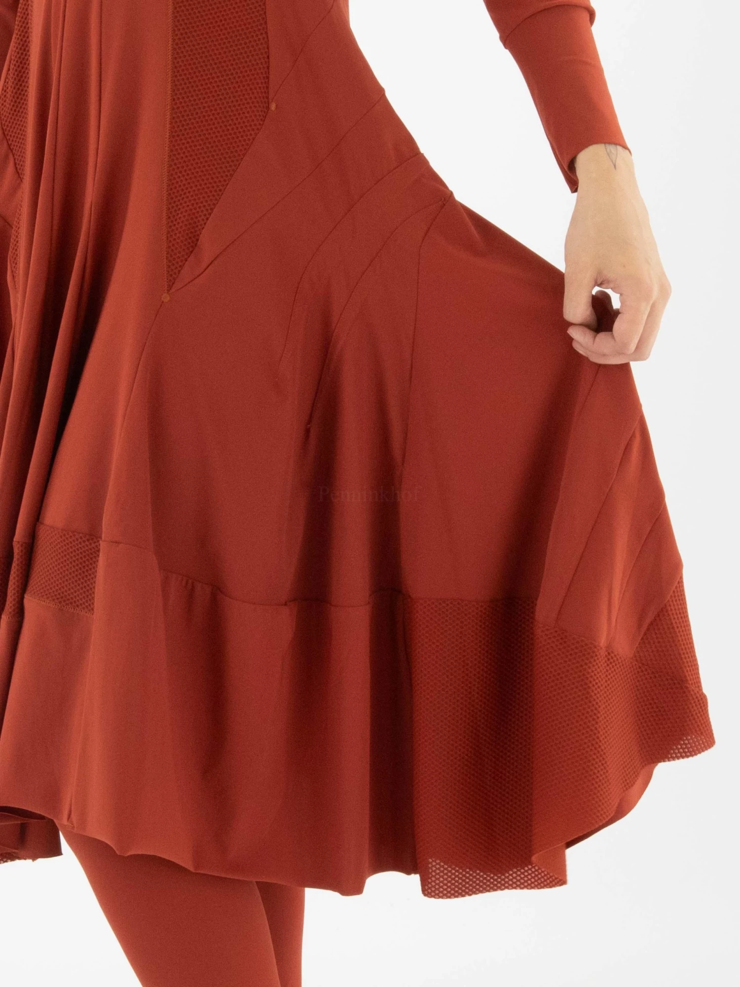 Een jurk van High in de kleur roest. Op de schouders en vanuit de oksels tot onder de taille is de stof in een netstructuur. Dit detail komt terug aan de onderkant van de jurk. Vanuit de taille heeft de jurk aan A – Lijn. De jurk heeft een ronde hals en mag op de hand worden gewassen.