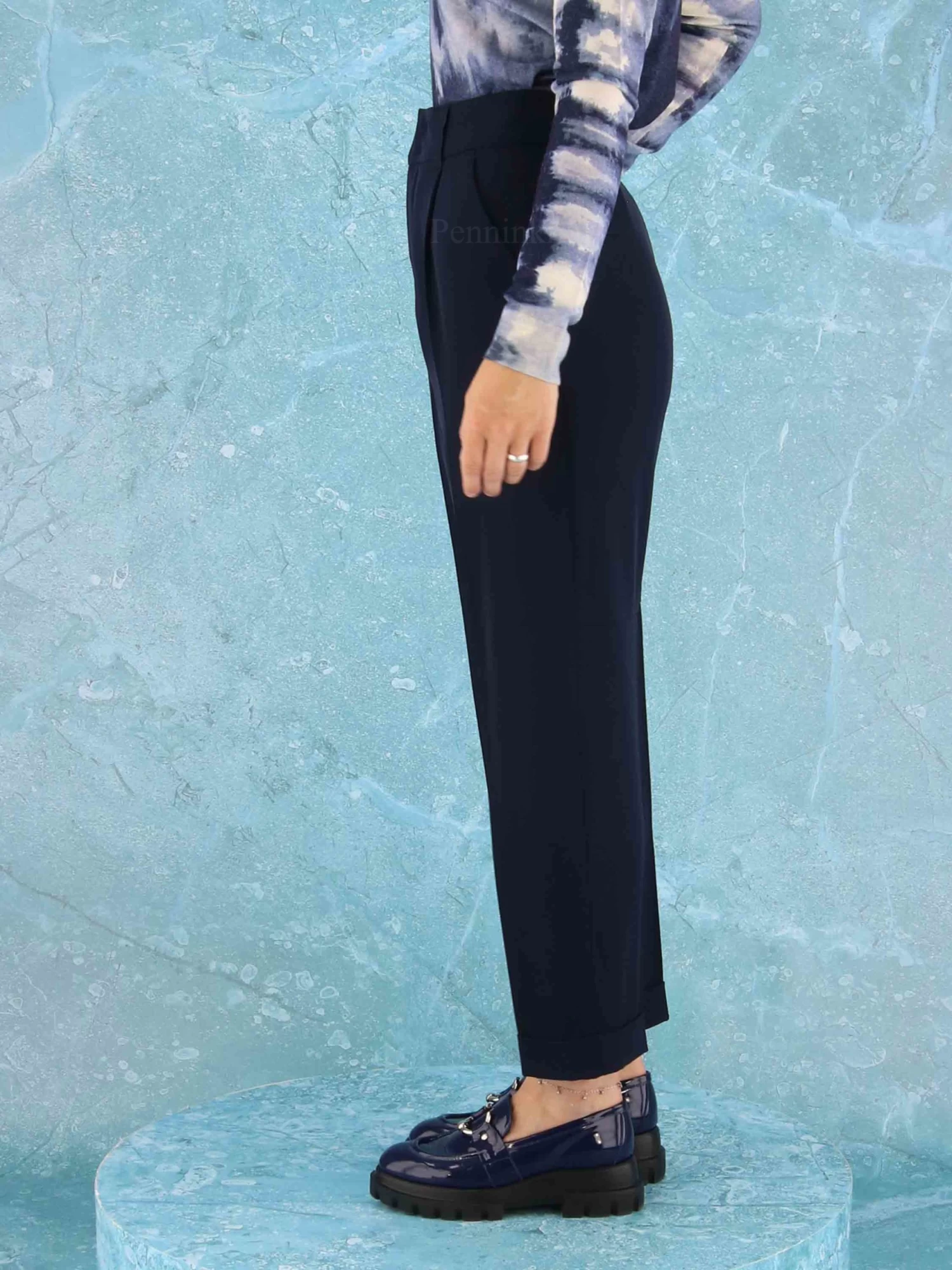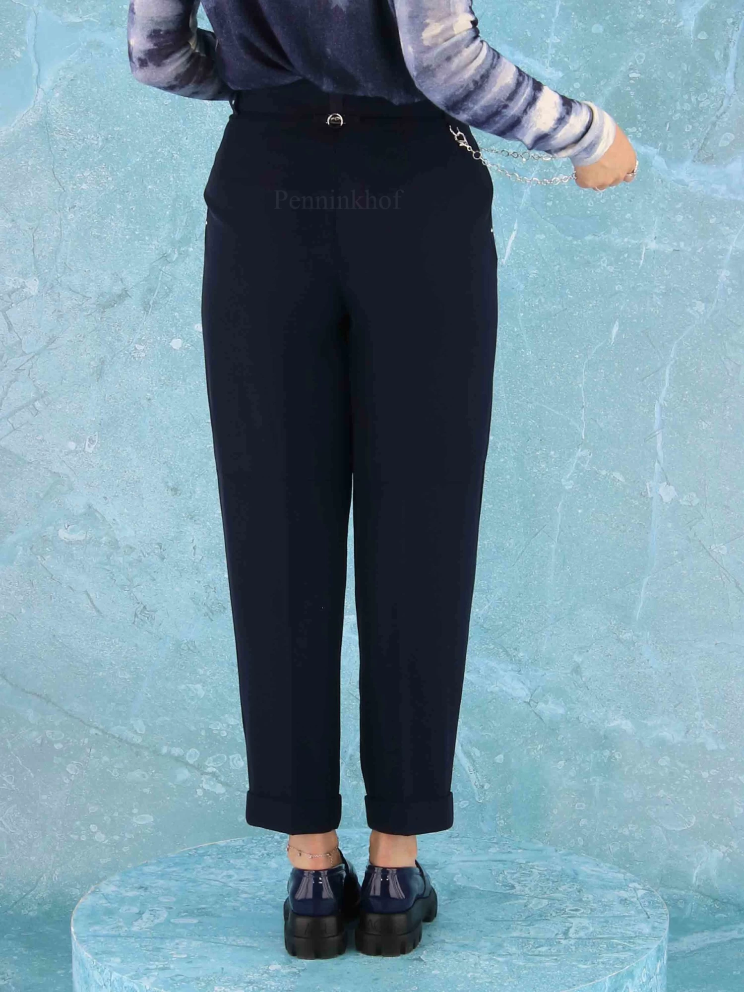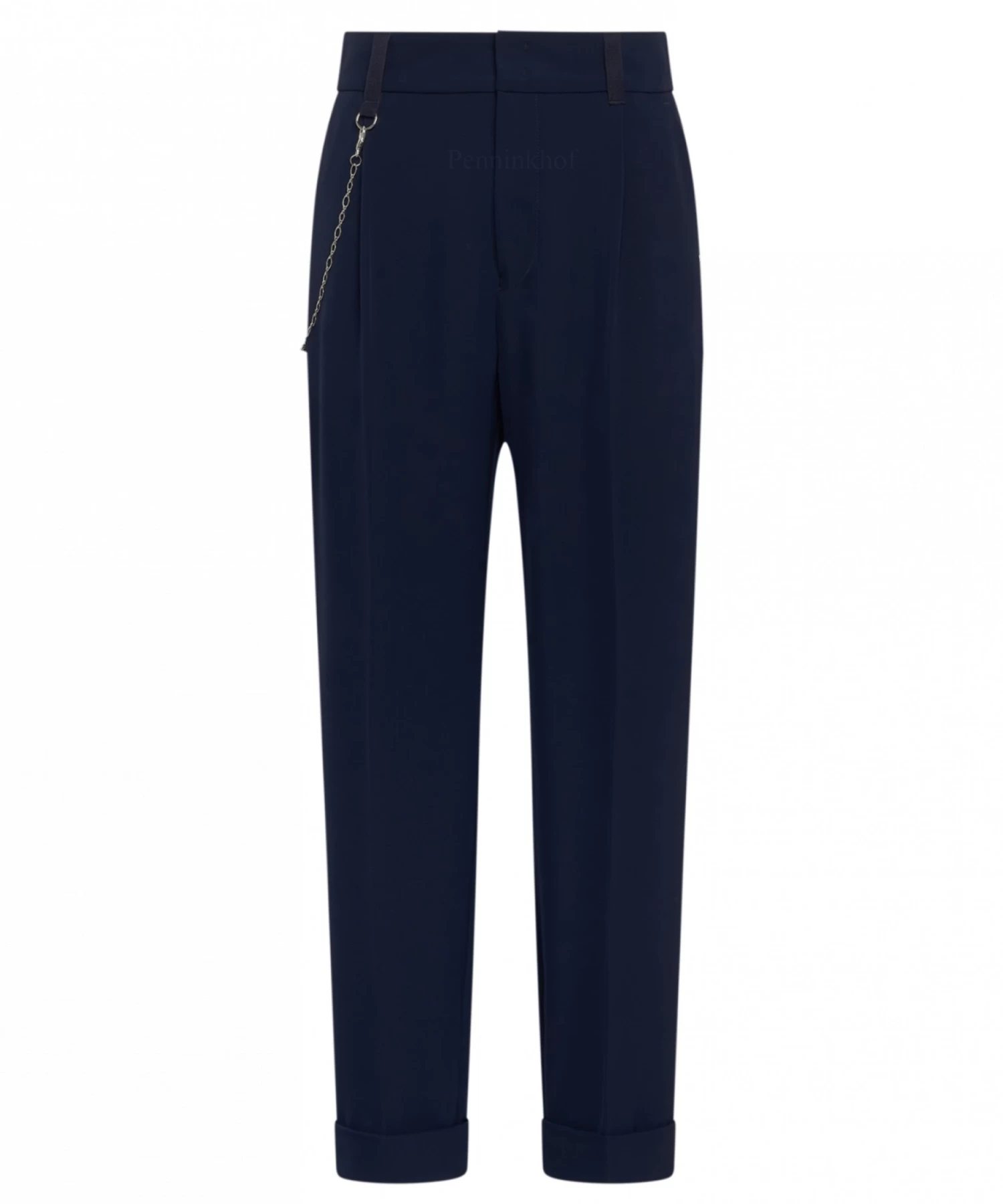 Een broek van High in de kleur marineblauw. Vanuit de taille heeft de broek enkele bandplooien. Aan de onderkant van de pijpen is een korte omslag. De broek heeft steekzakken en mag op 30 graden worden gewassen.