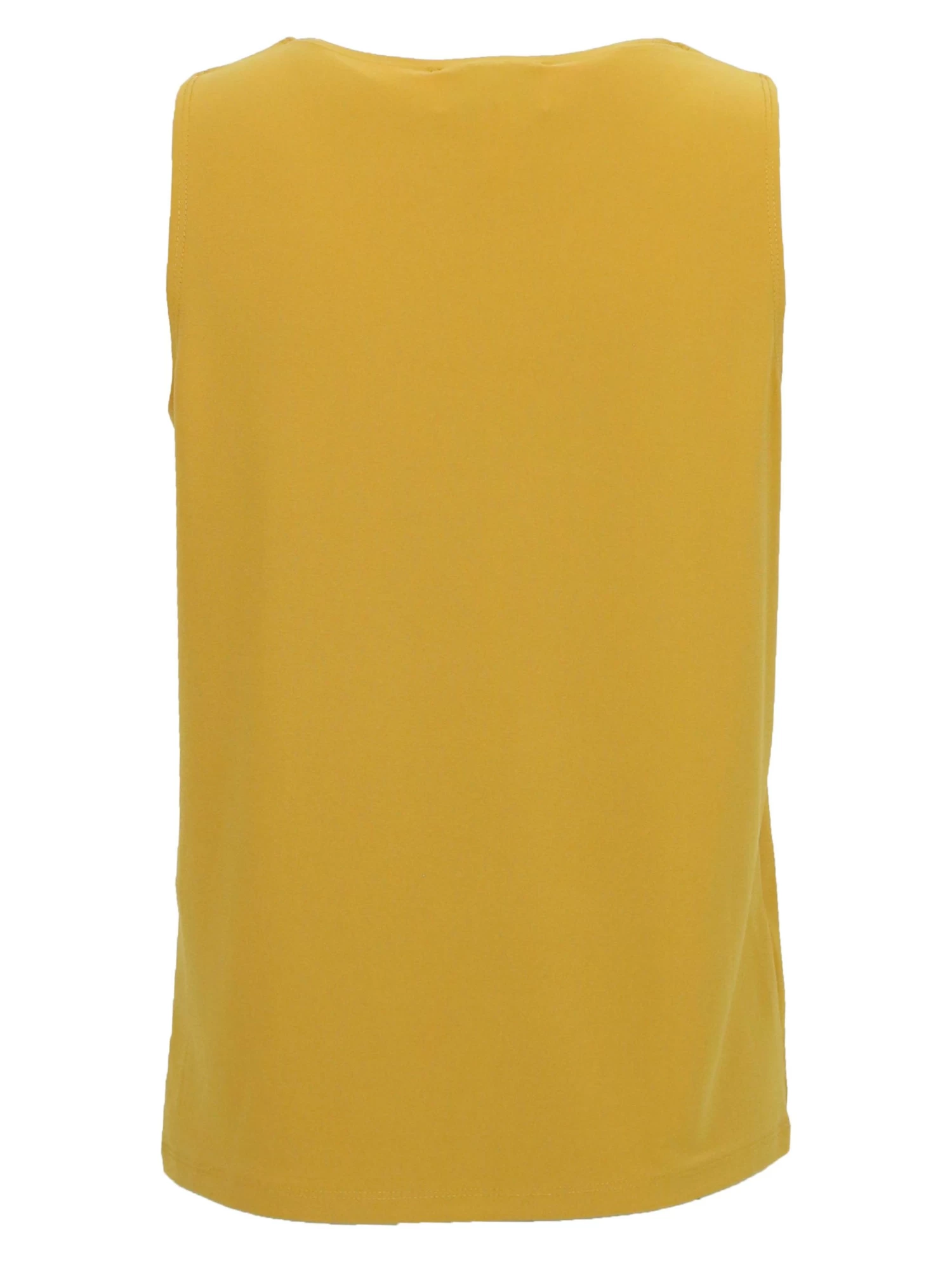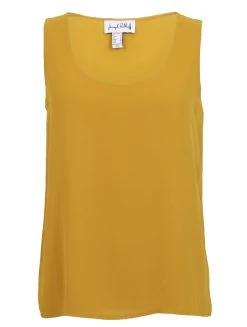 Een top van Joseph Ribkoff in de kleur okergeel. De top heeft een diepe ronde hals en de voorkant heeft een dubbele stof. Deze top mag op de hand worden gewassen.