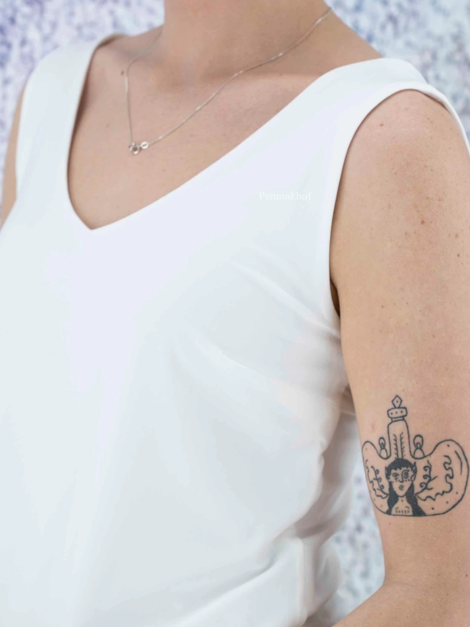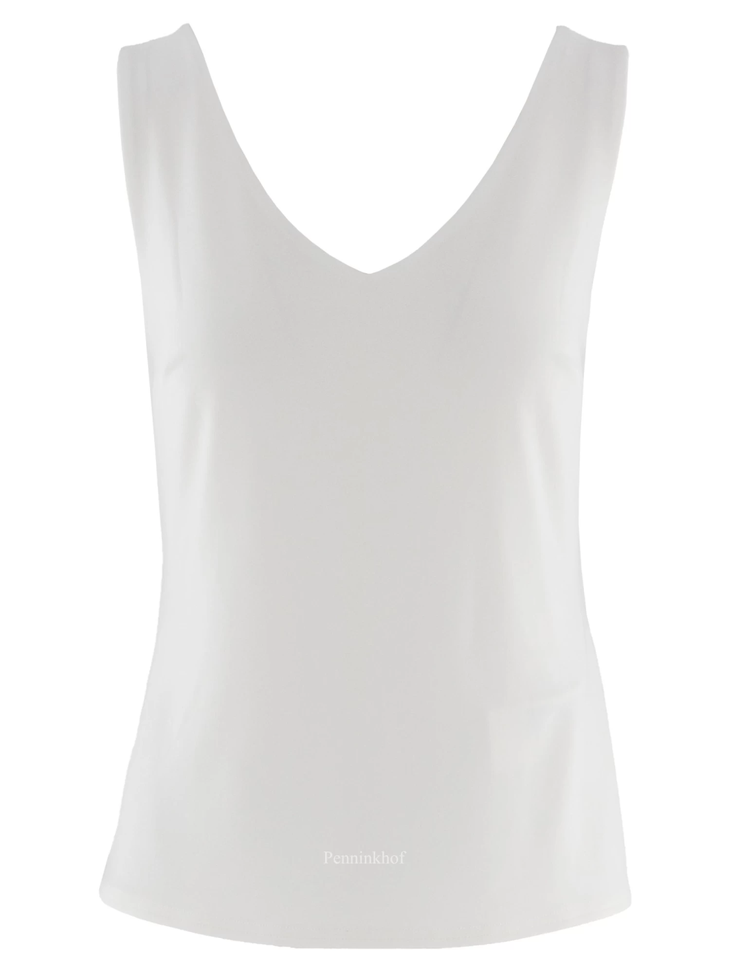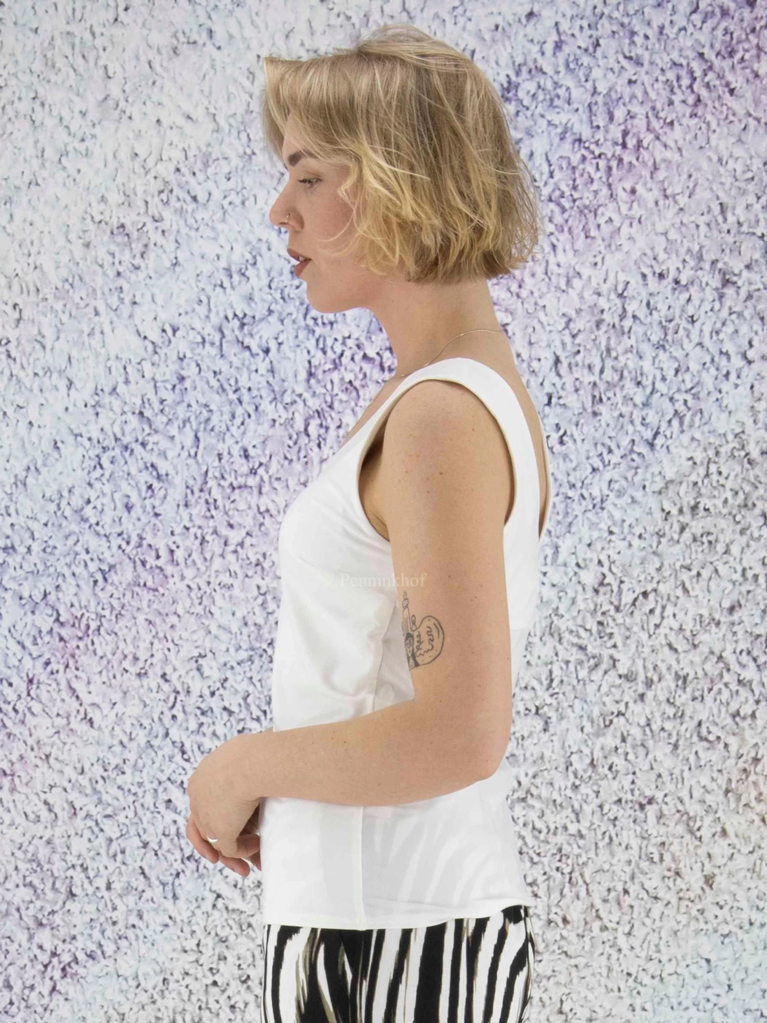 Een basis top van Joseph Ribkoff in de kleur wit. De top heeft aan de voor – en achterkant een V – Hals. De schouderbandjes zijn 5 cm breed. Deze top mag op de hand worden gewassen.
