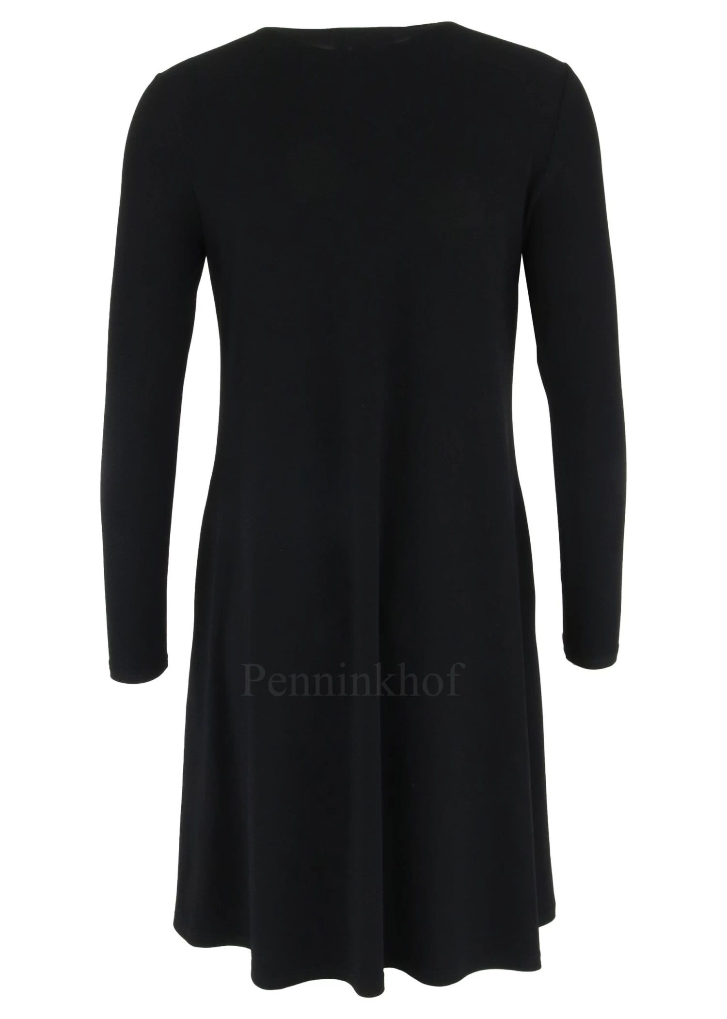 Een jurk van Joseph Ribkoff in de kleur zwart. In het midden van de ronde hals is een rits tot onder de buste. De jurk heeft een lichte A – Lijn. deze jurk mag op de hand worden gewassen.
