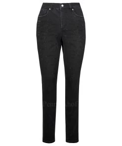 Een jeans van Joseph Ribkoff in de kleur antraciet. Vanaf de taille tot aan de knieën zijn aan de voorzijde zwarte strassteentjes in gestreepte vleugen. De jeans is in een 5 pocket model en mag op de hand worden gewassen.
