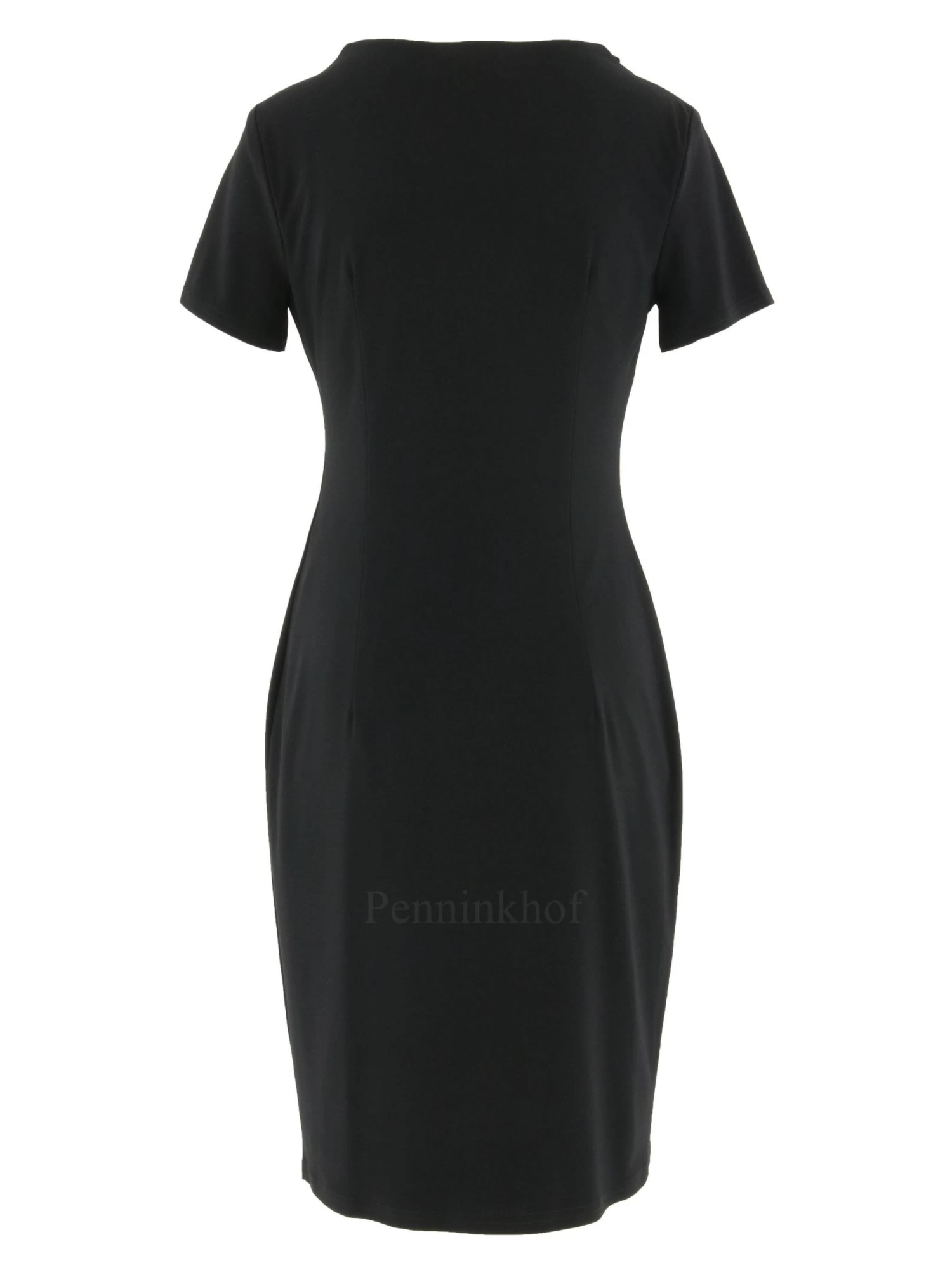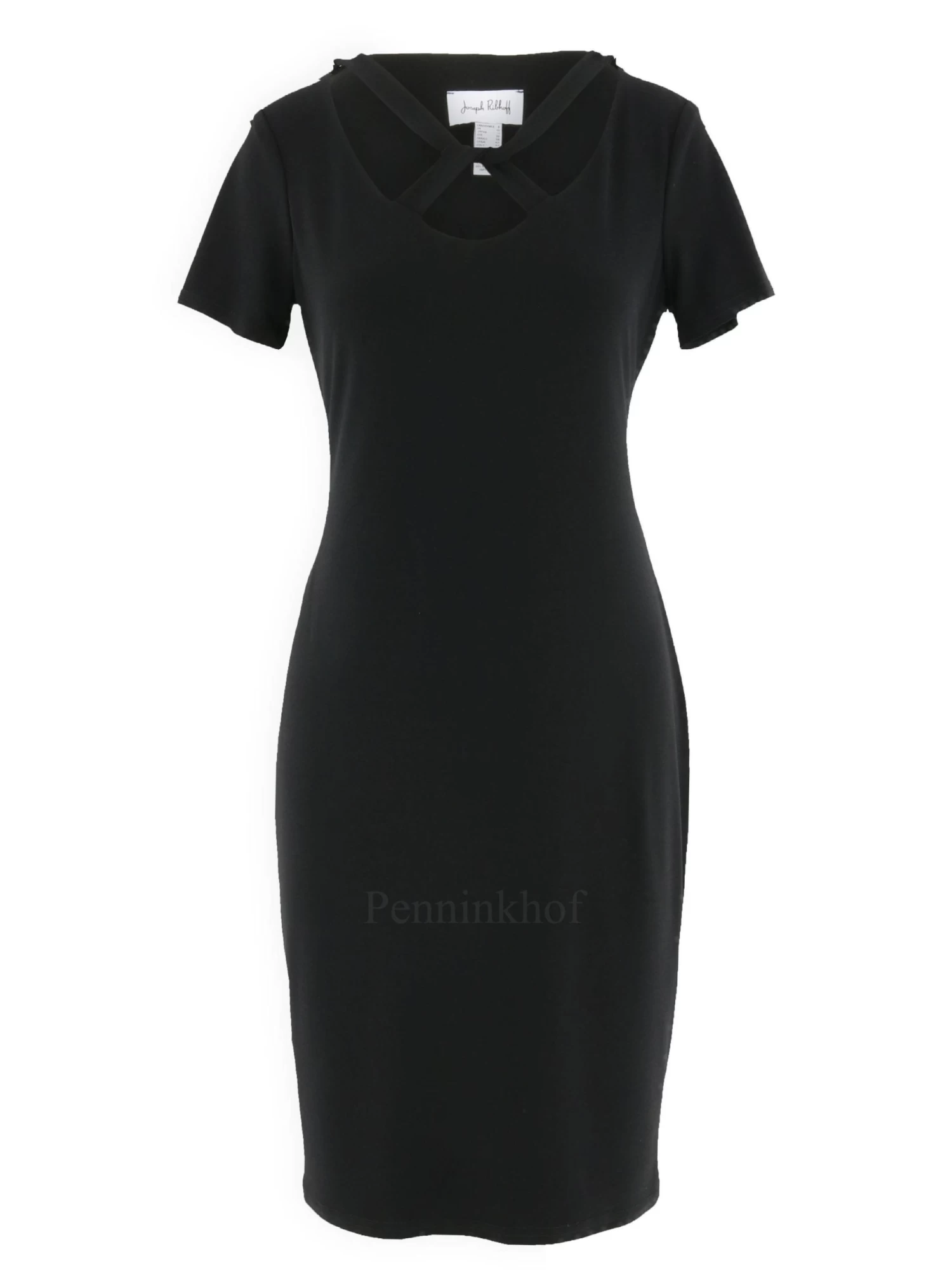 Een jurk van Joseph Ribkoff in de kleur zwart. In de hals zijn 2 linten die gekruist in de hals lopen. Deze jurk mag op de hand worden gewassen.
