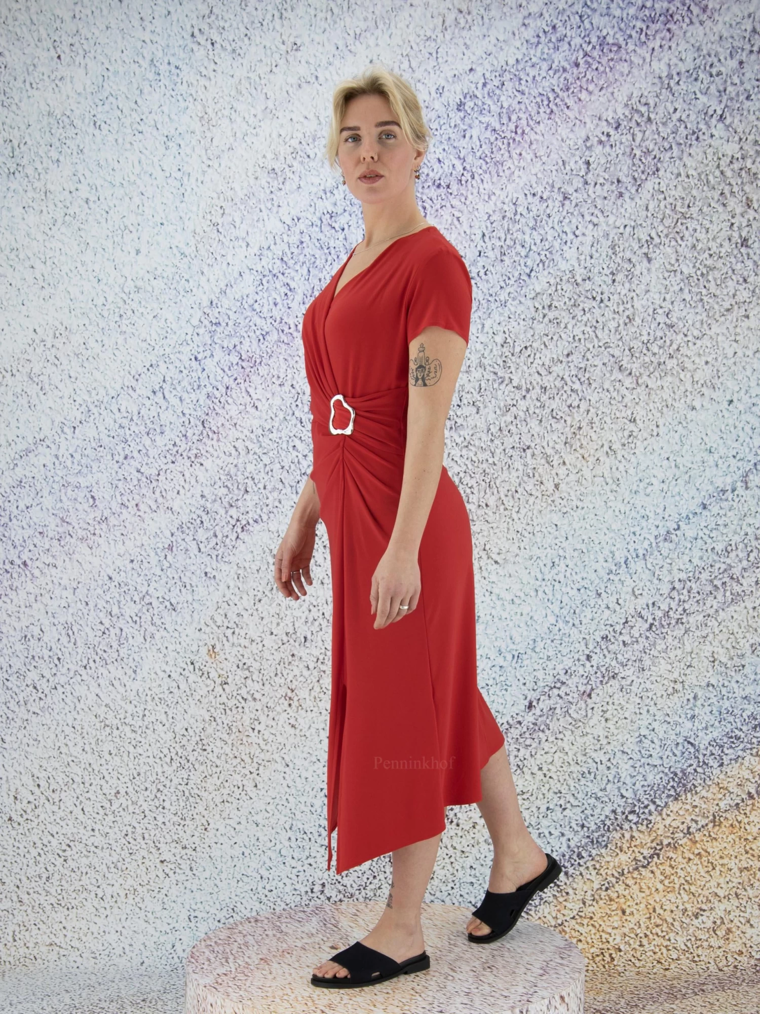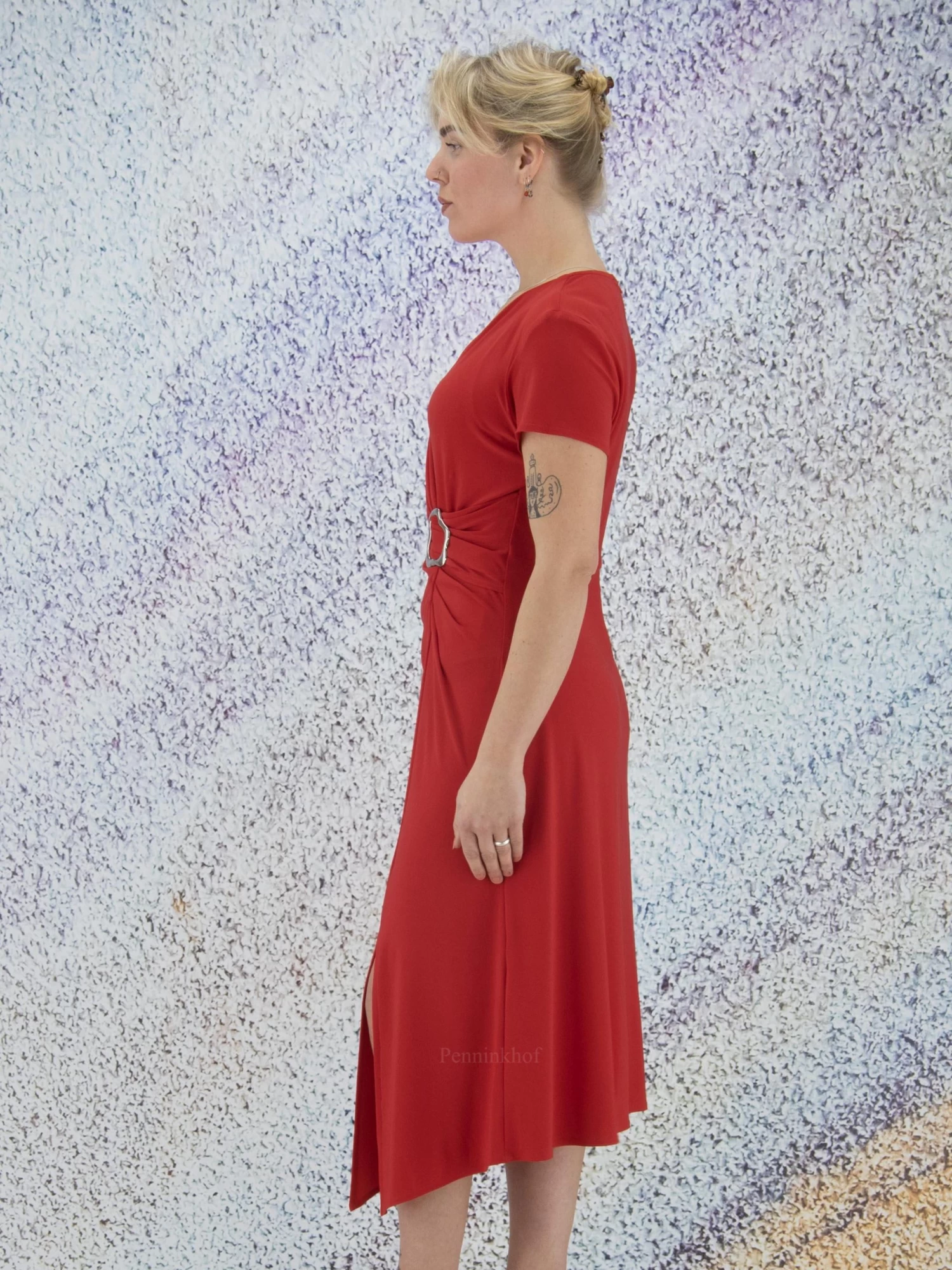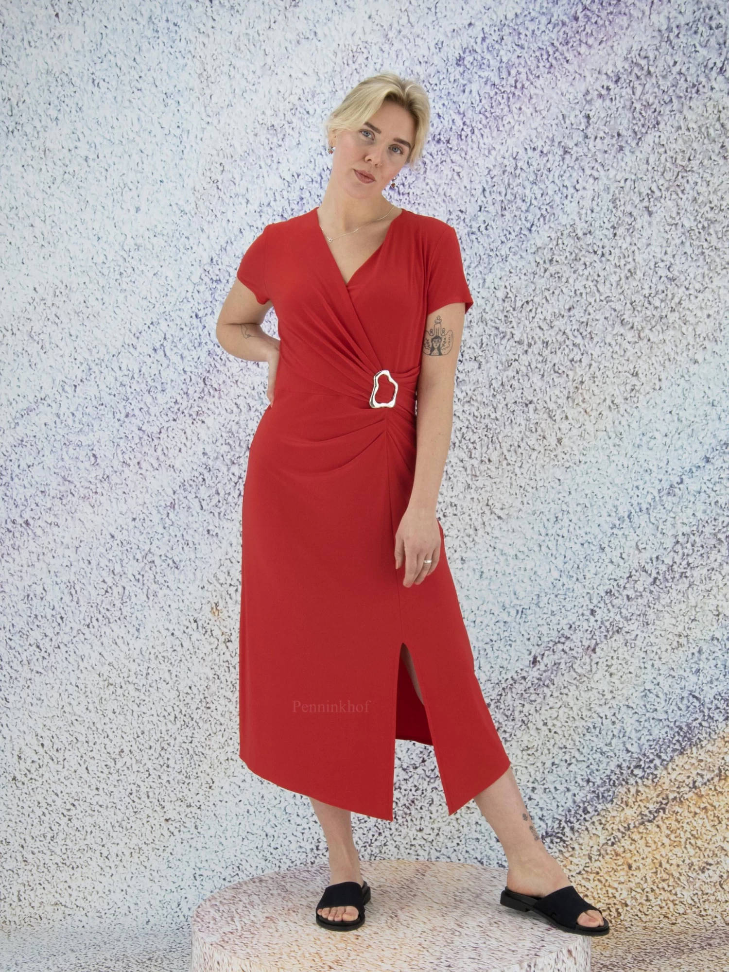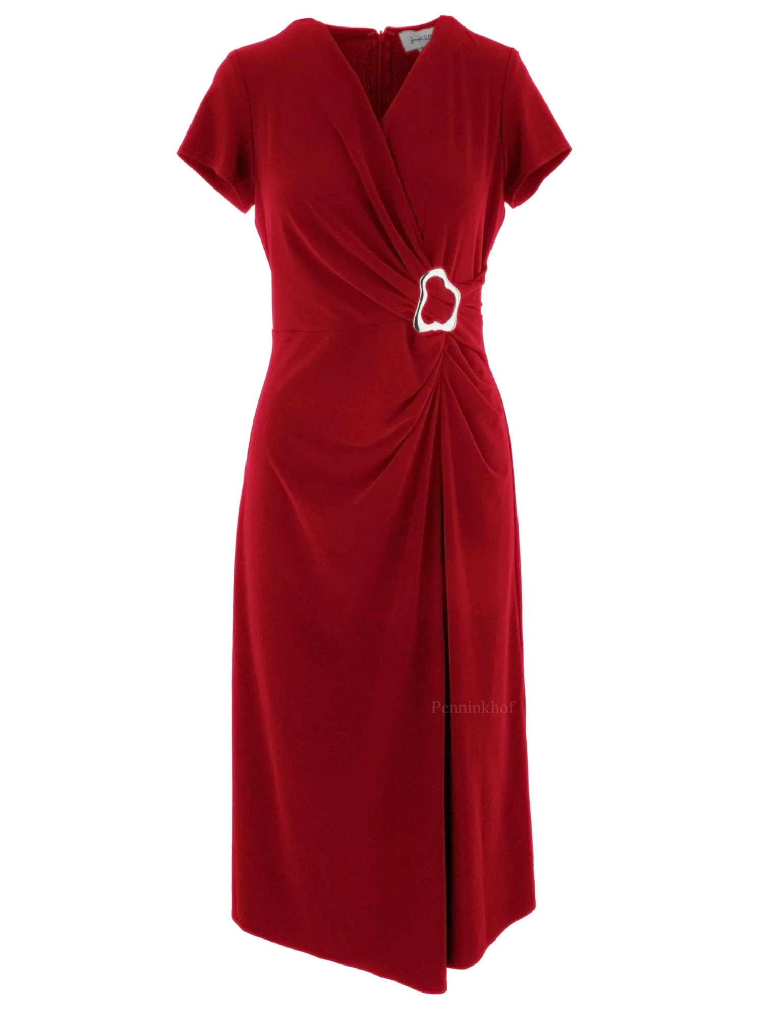 Een jurk van Joseph Ribkoff in de kleur rood. Vanuit de V – Hals heeft de jurk een drapeer effect naar de decoratieve goudkleurige gesp ter hoogte van de taille. Deze jurk mag op de hand worden gewassen.