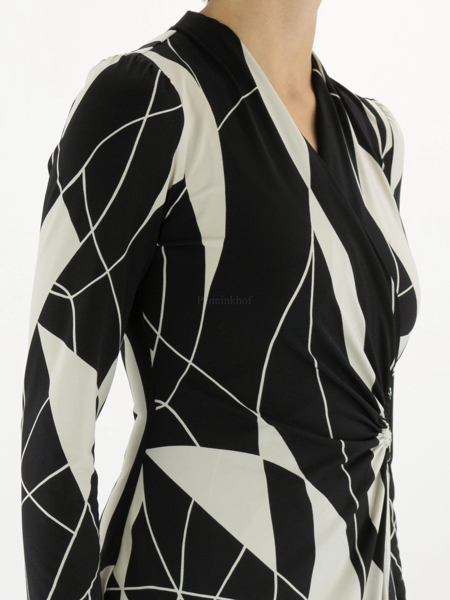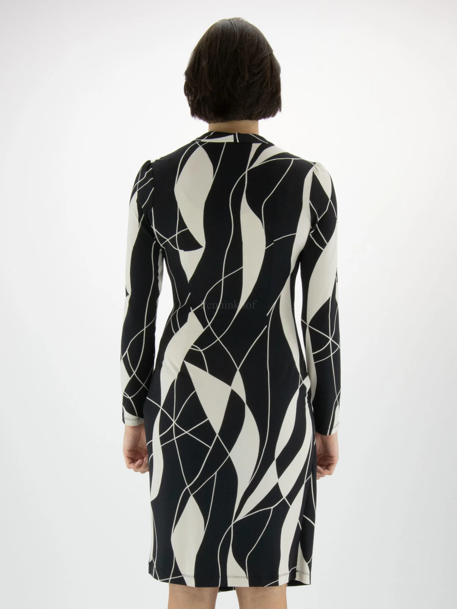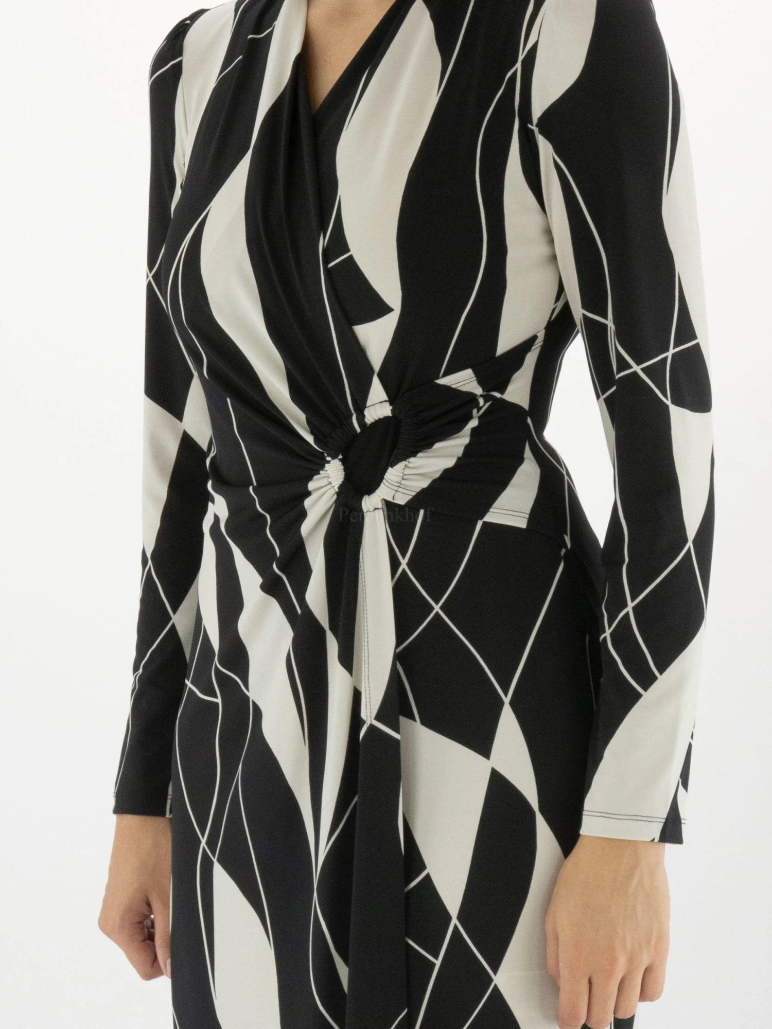 Een overslagjurk van Joseph Ribkoff in een grafische print met de kleuren zwart en kit of lichtgrijs. ter hoogte van de taille is in het midden een metalen gesp waar de sof geplooid aan is bevestigd. De jurk heeft een V – Hals en mag op de hand worden gewassen.