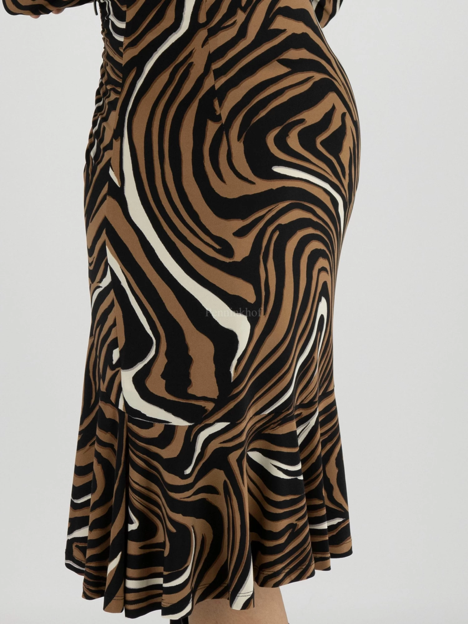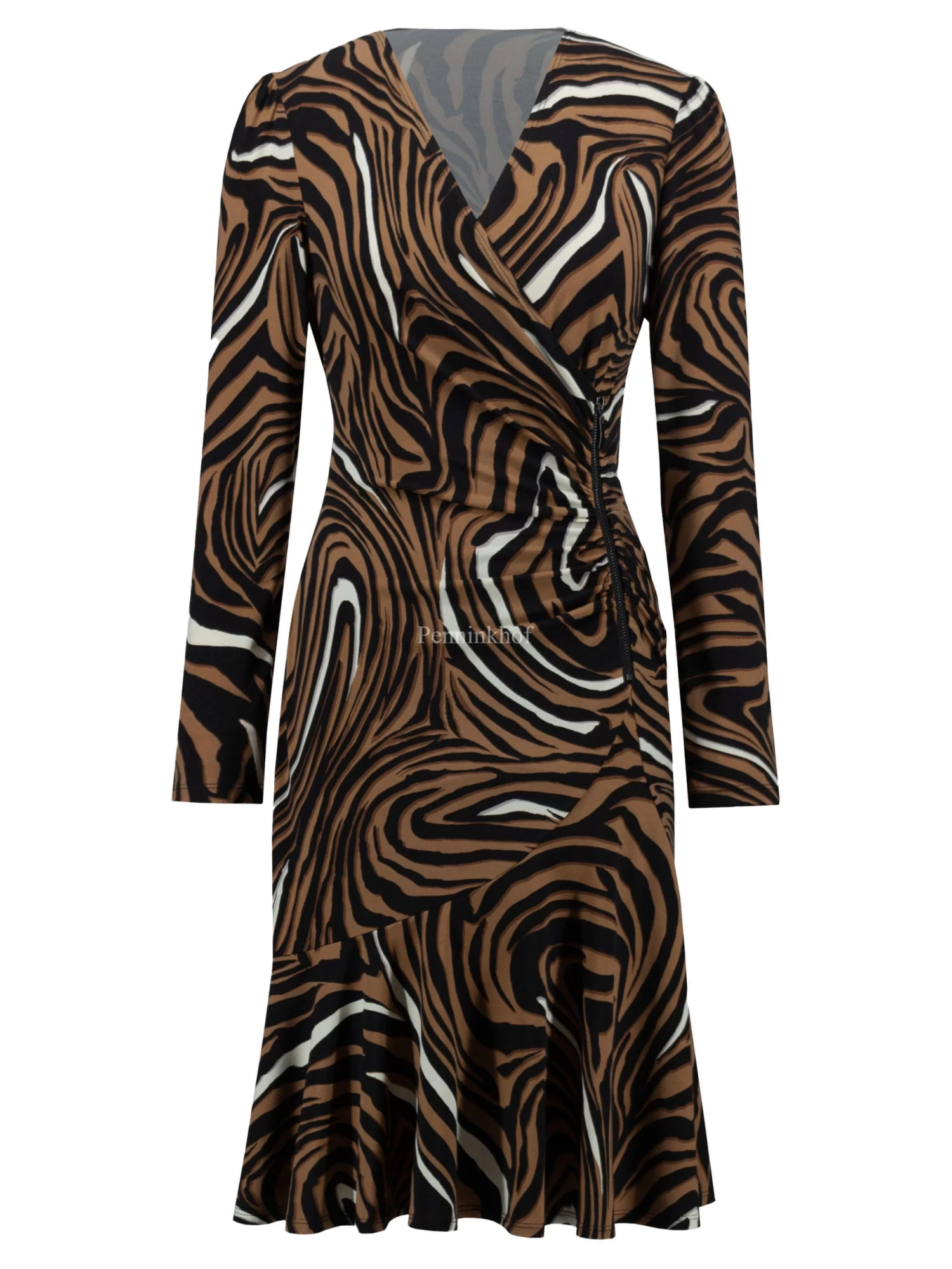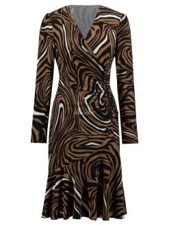 Een jurk van Joseph Ribkoff in een zebra print met meerdere tinten bruin, wit en zwart. De jurk heeft een V – Hals met een valse overslag. Vanuit de V – Hals is een korte rits waar aan beide kanten de stof fijn geplooid is wat een drapeer effect geeft. De jurk heeft een lichte A – Lijn vanuit de taille. Deze jurk mag op de hand worden gewassen.