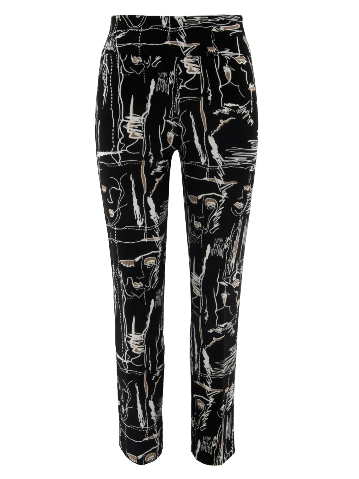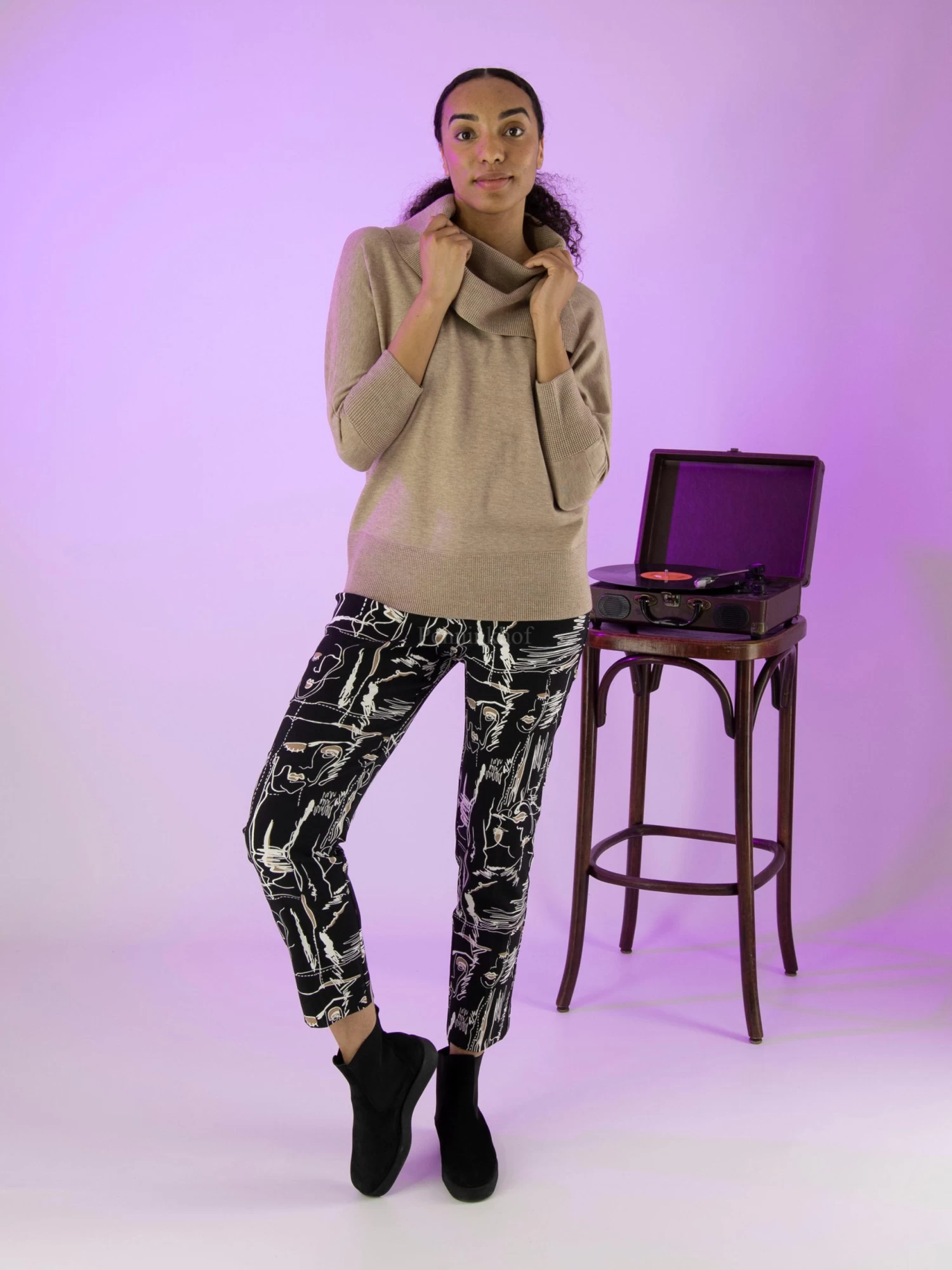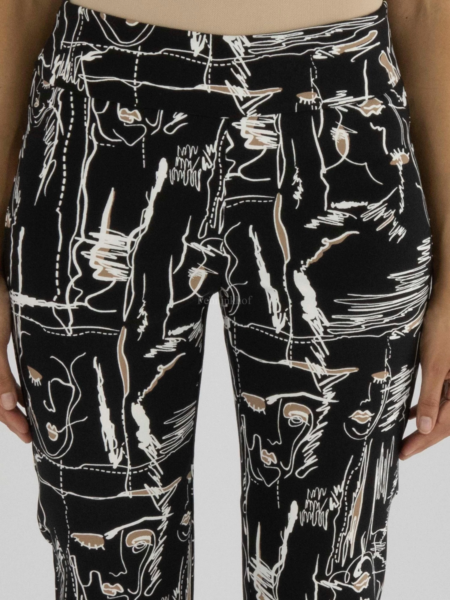 Een broek van Joseph Ribkoff in een grafische print met de kleuren taupe en wit op een zwarte achtergrond. In de taille is een elastieken band. Deze broek mag op de hand worden gewassen.
