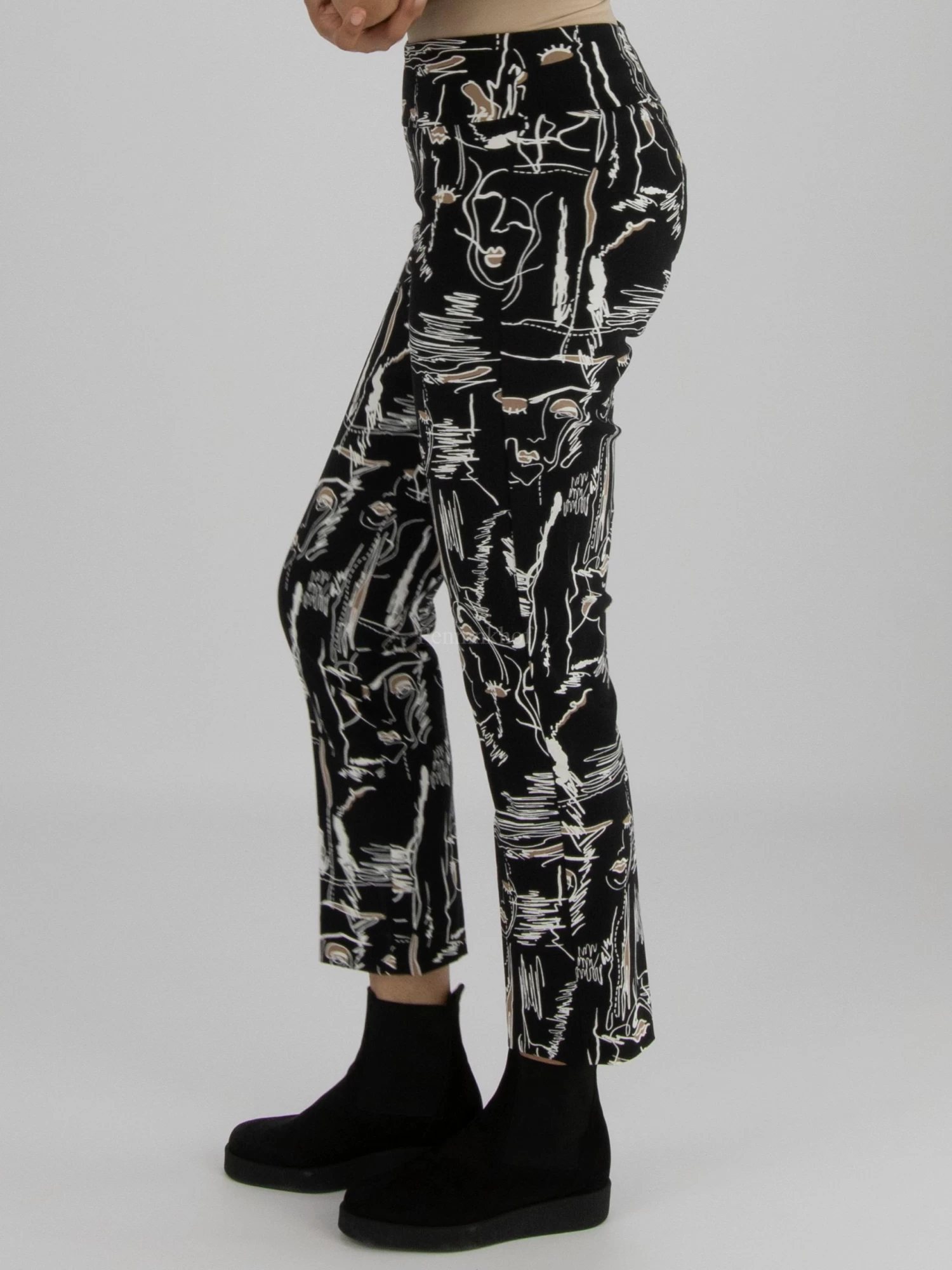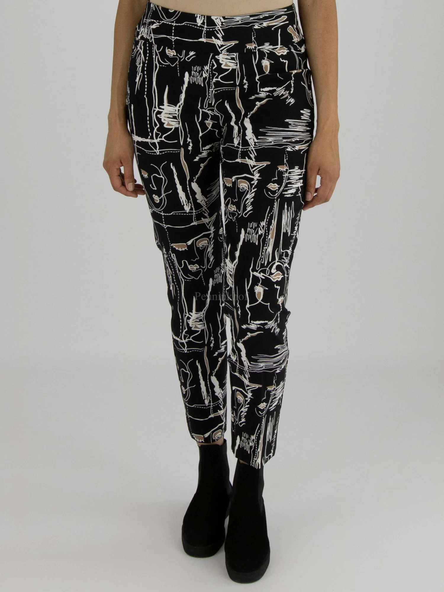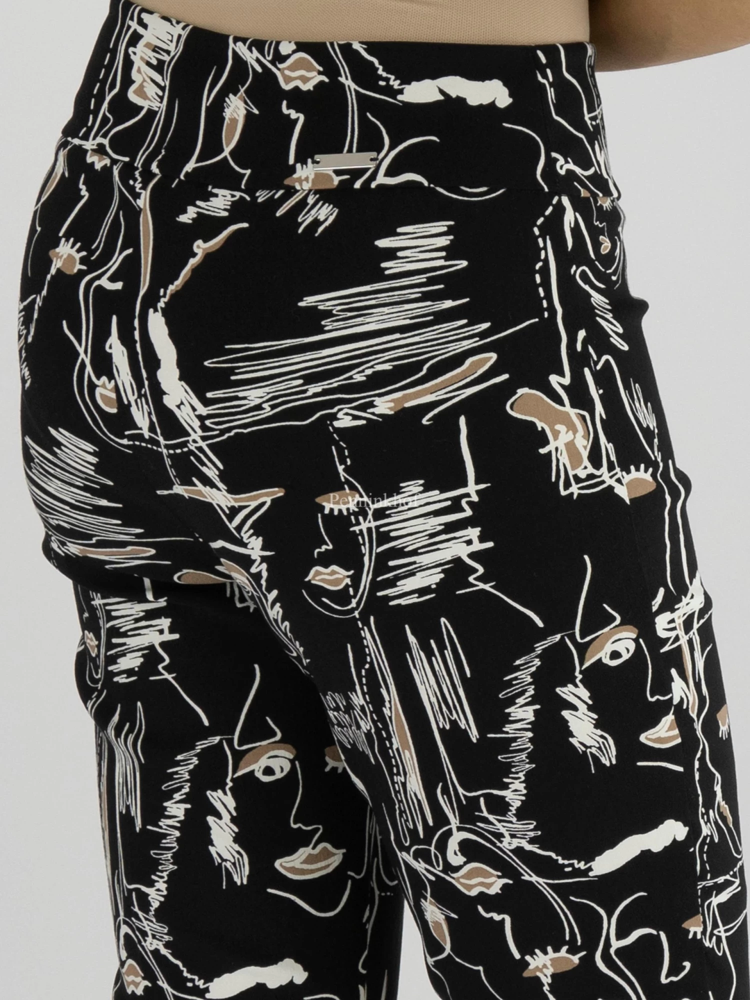 Een broek van Joseph Ribkoff in een grafische print met de kleuren taupe en wit op een zwarte achtergrond. In de taille is een elastieken band. Deze broek mag op de hand worden gewassen.