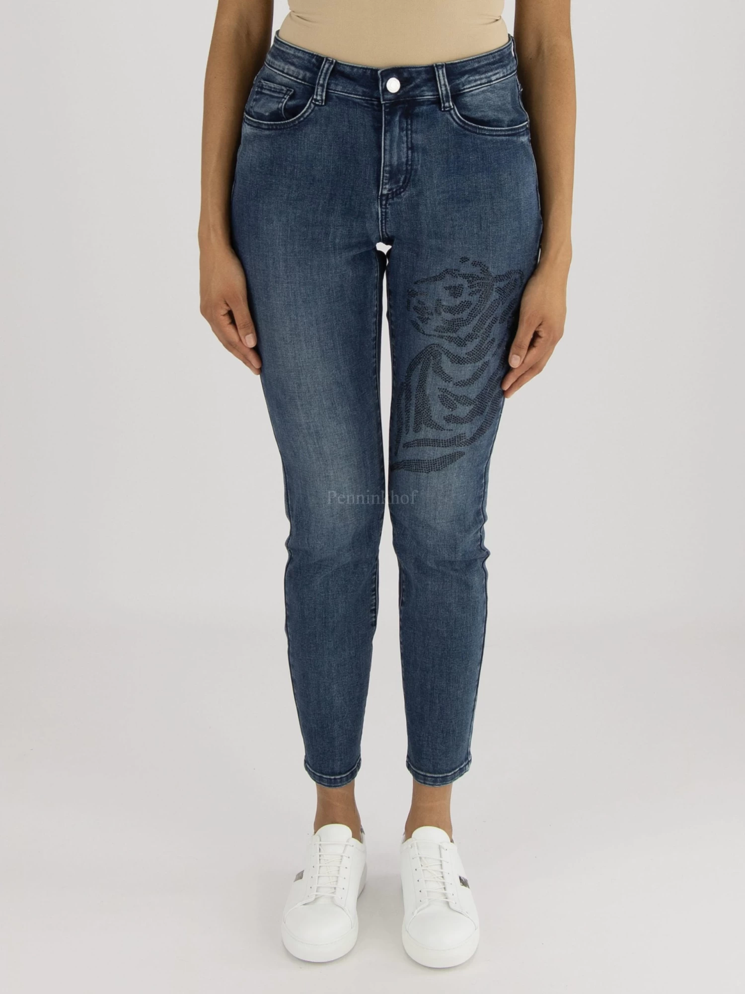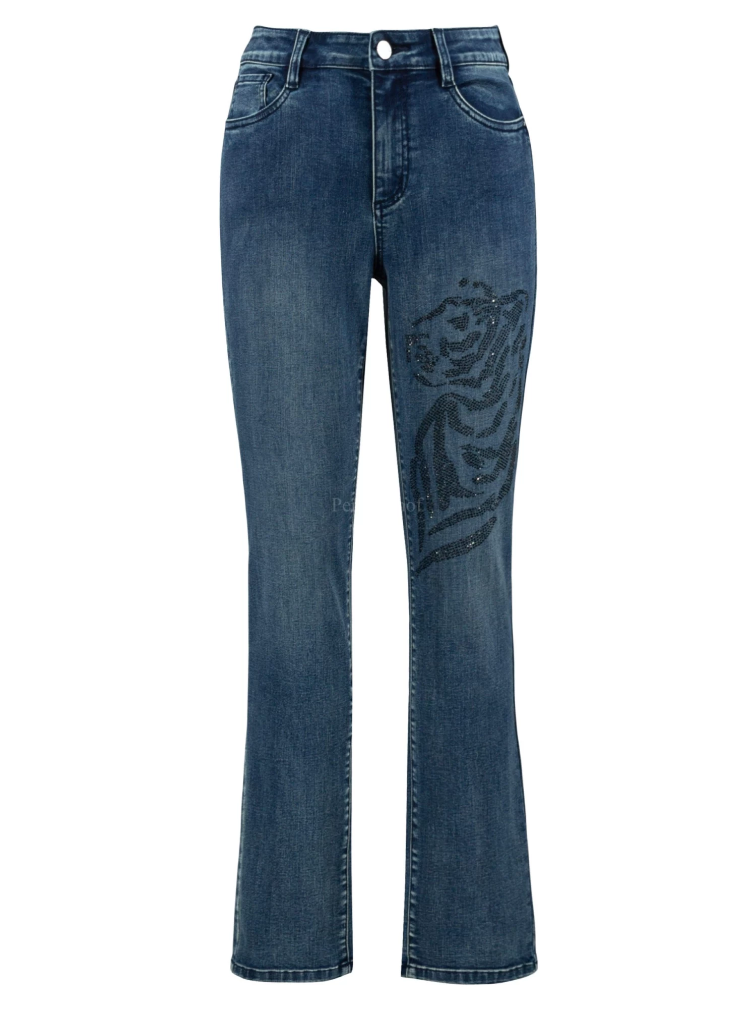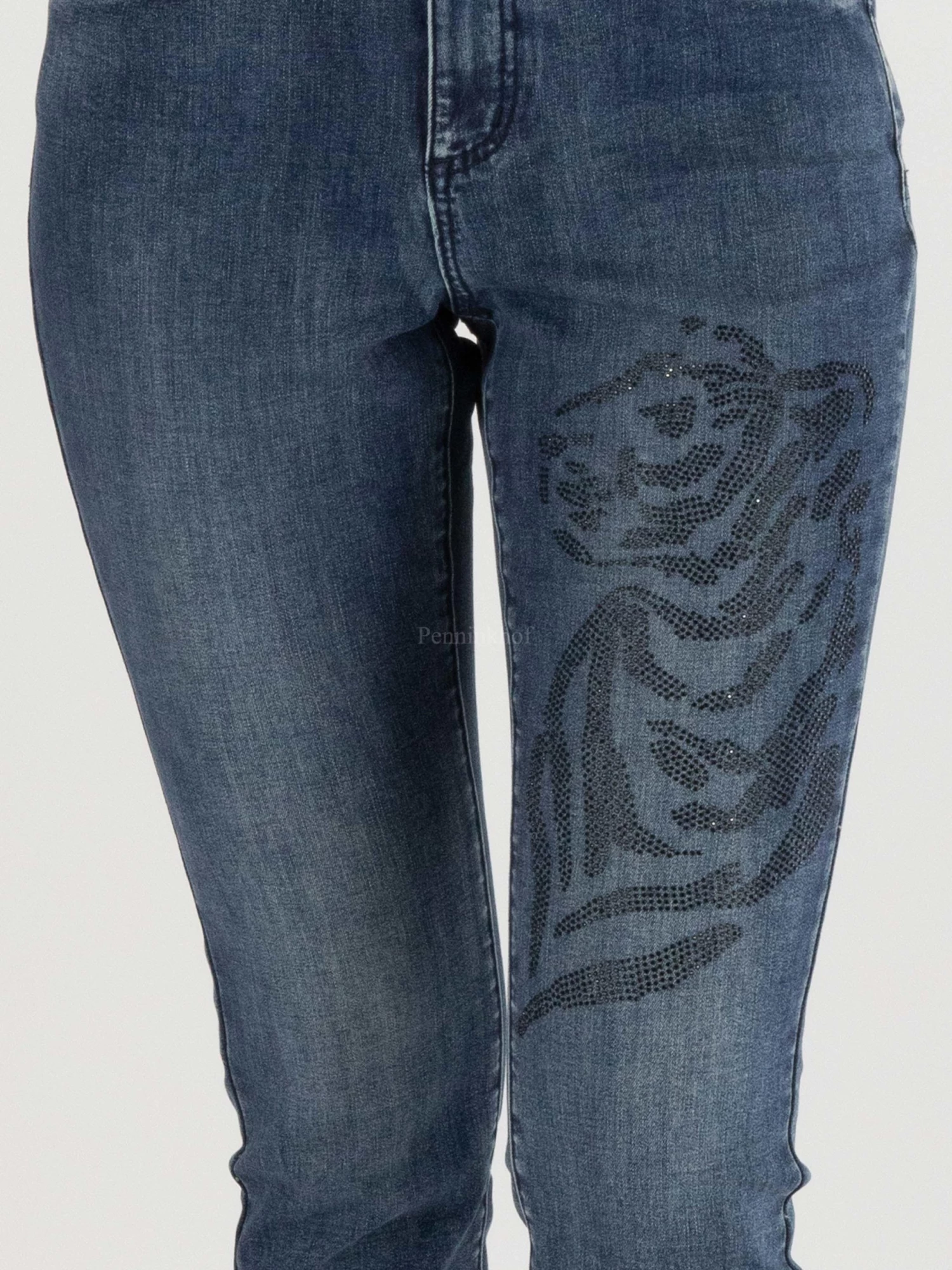 Een jeans van Joseph Ribkoff in een basis jeansblauwe kleur. Op de linker pijp is ter hoogte van het bovenbeen een dessin van een panter in zwarte strassteentjes. Deze jeans mag op de hand worden gewassen.