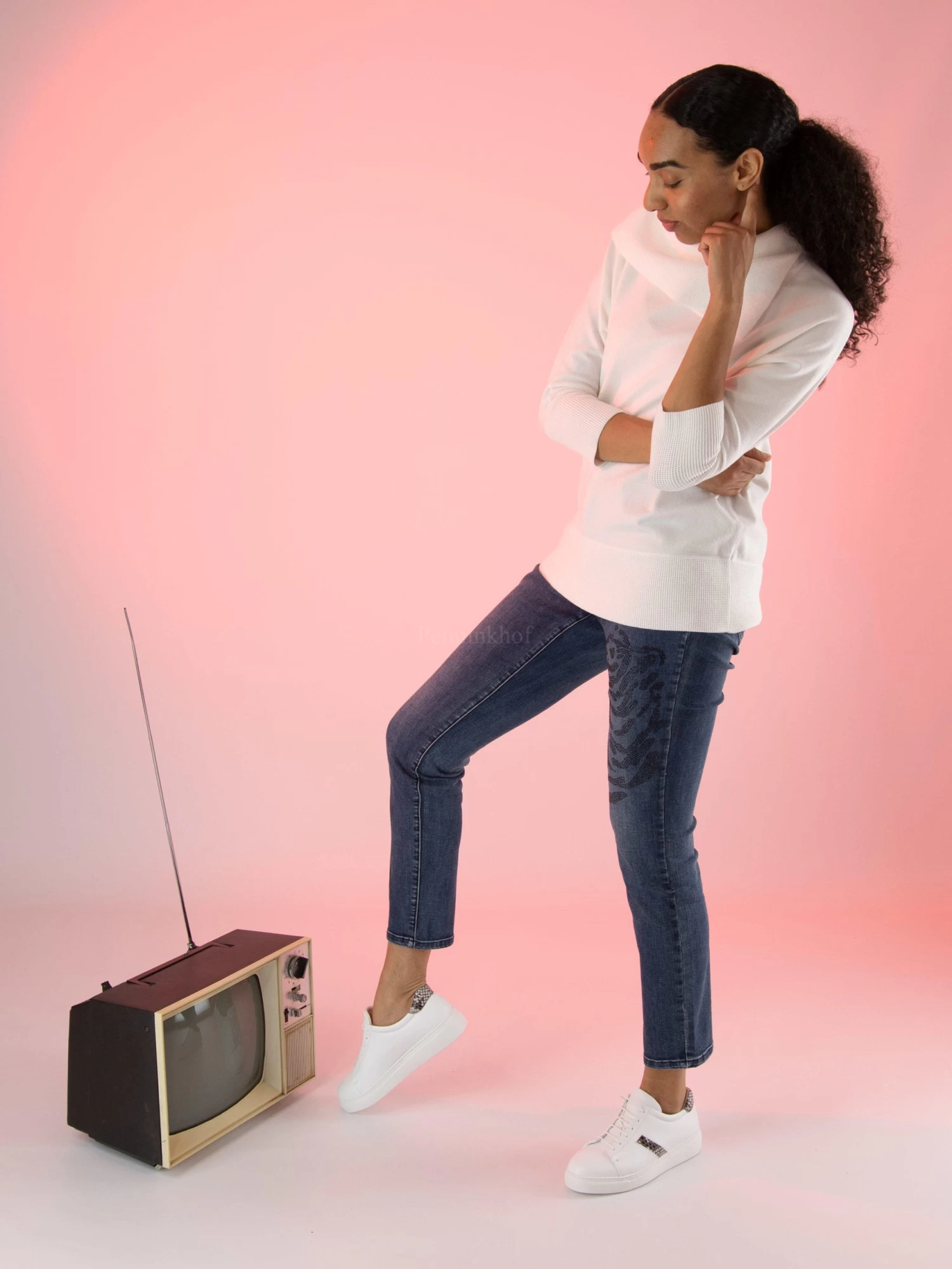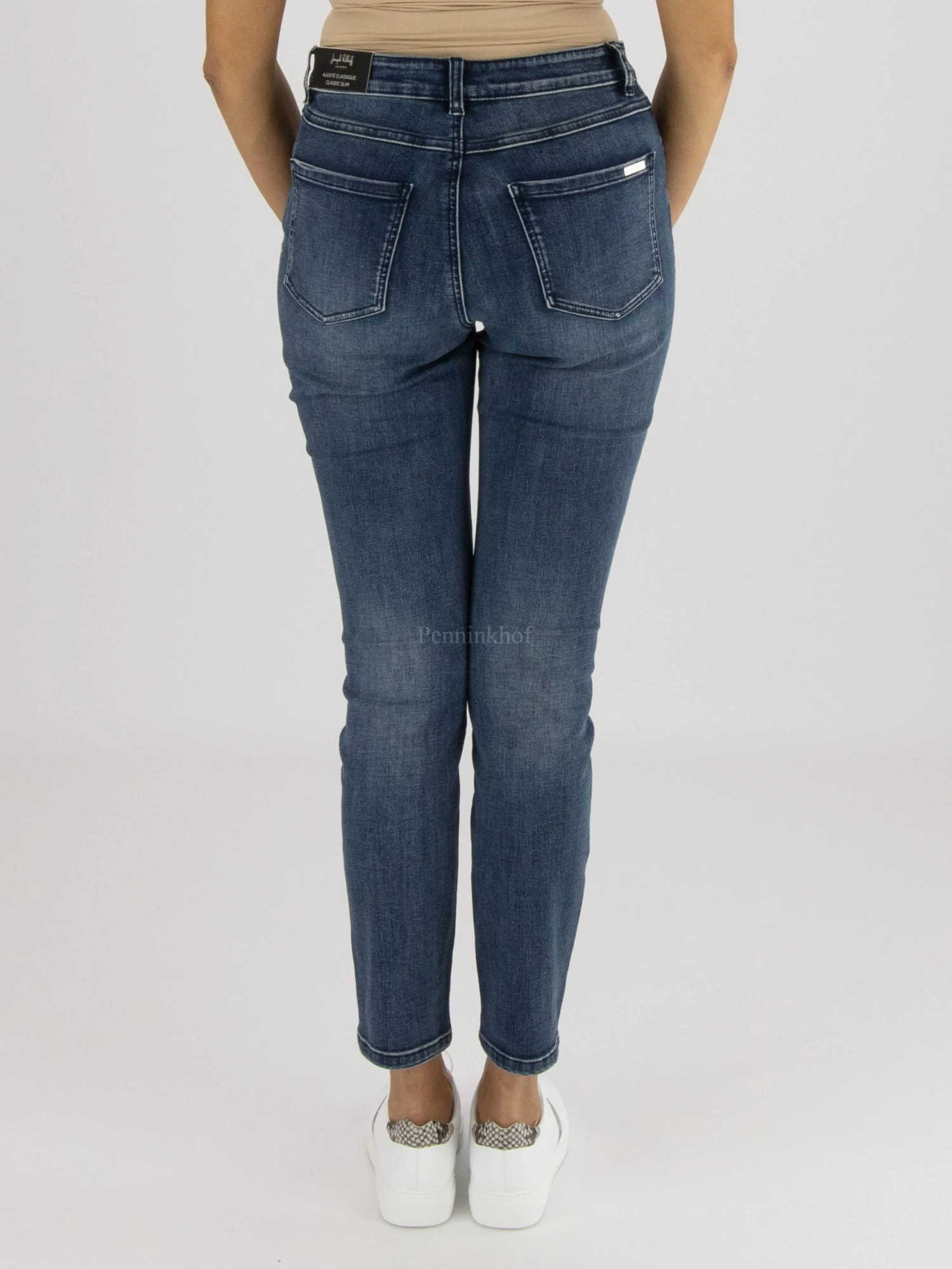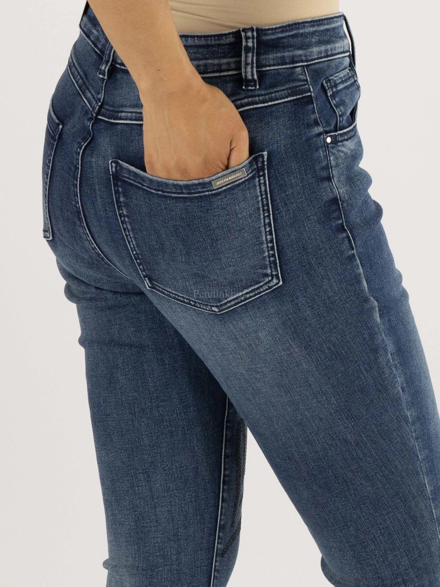 Een jeans van Joseph Ribkoff in een basis jeansblauwe kleur. Op de linker pijp is ter hoogte van het bovenbeen een dessin van een panter in zwarte strassteentjes. Deze jeans mag op de hand worden gewassen.