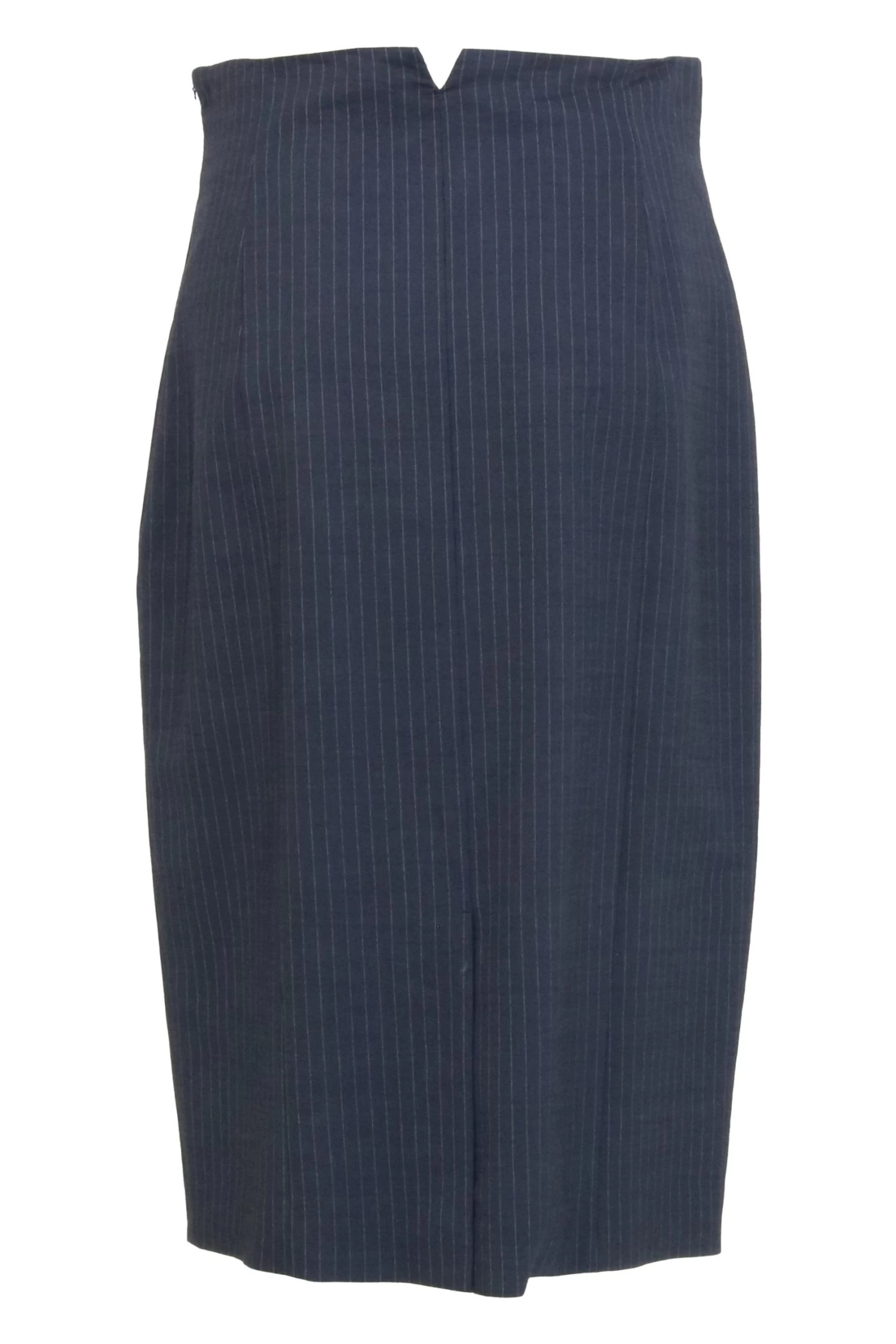 Een rok van René Lezard in een krijtstreep met de keuren marineblauw en camel. De rok is gevoerd en mag niet worden gewassen.