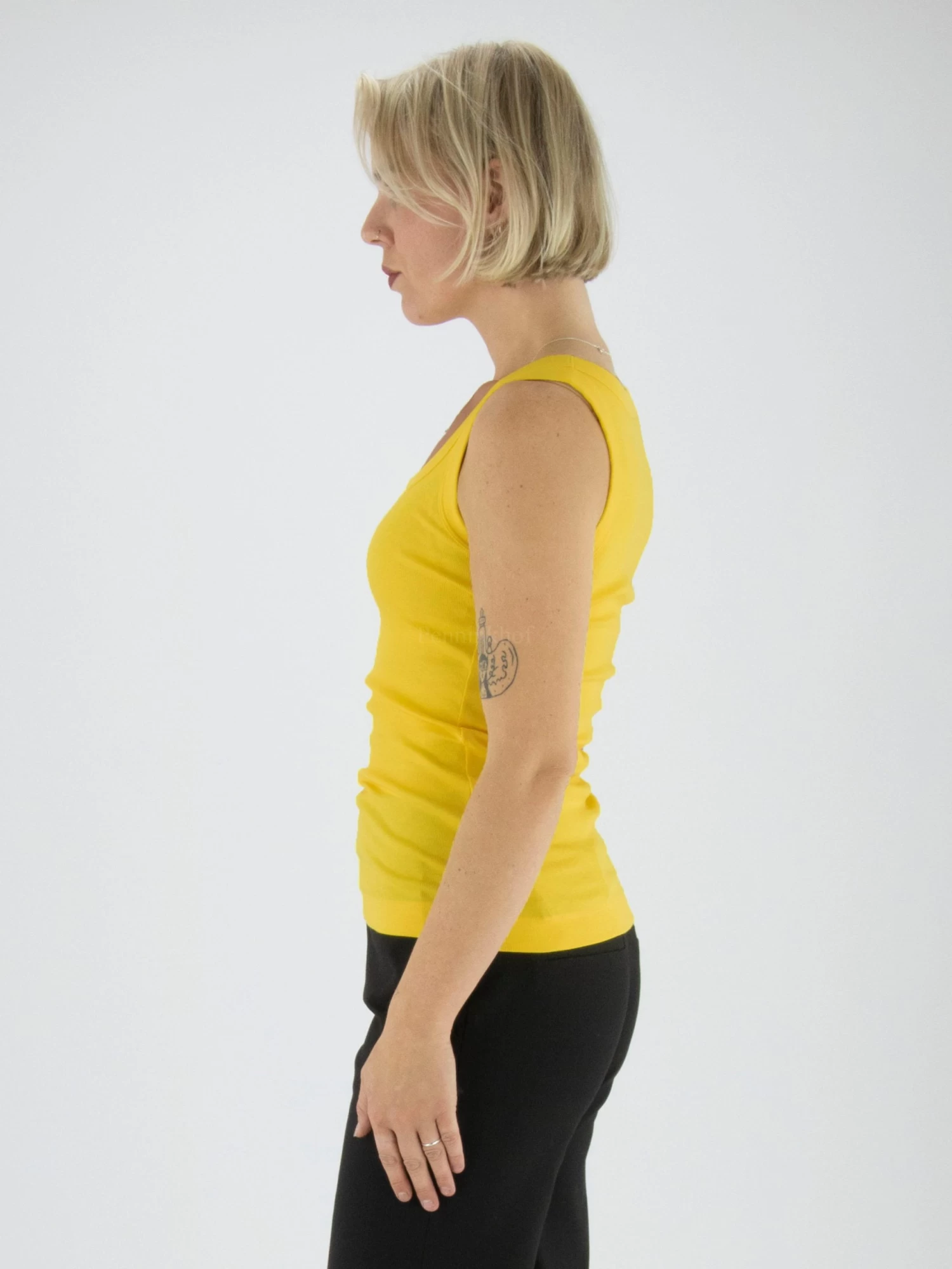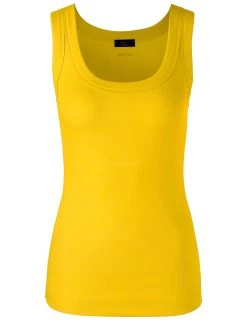 Een top van Marc Cain in de kleur geel. De top heeft een ronde hals en de stof is fijn geribbeld. Deze top mag op 30 graden worden gewassen.