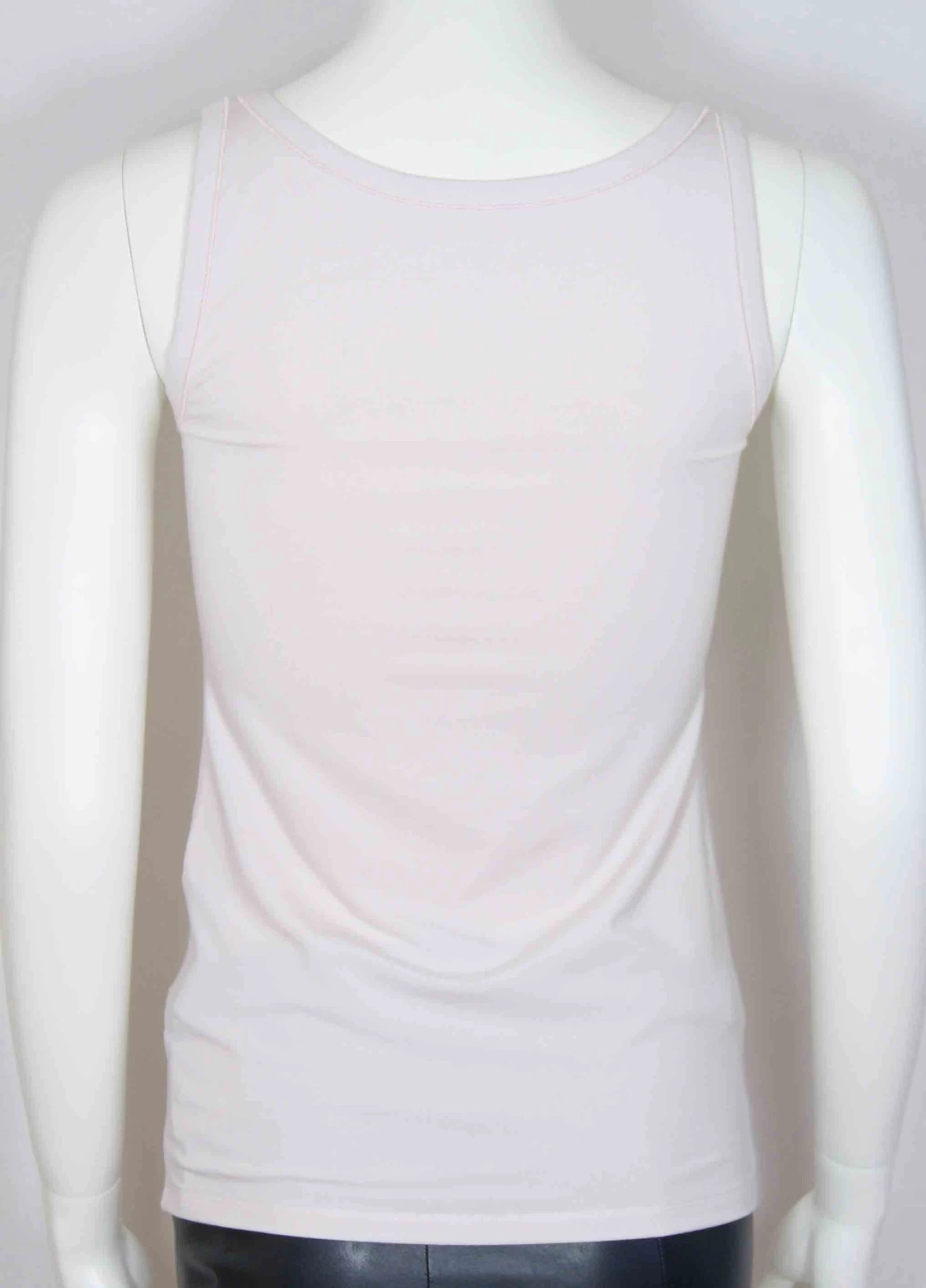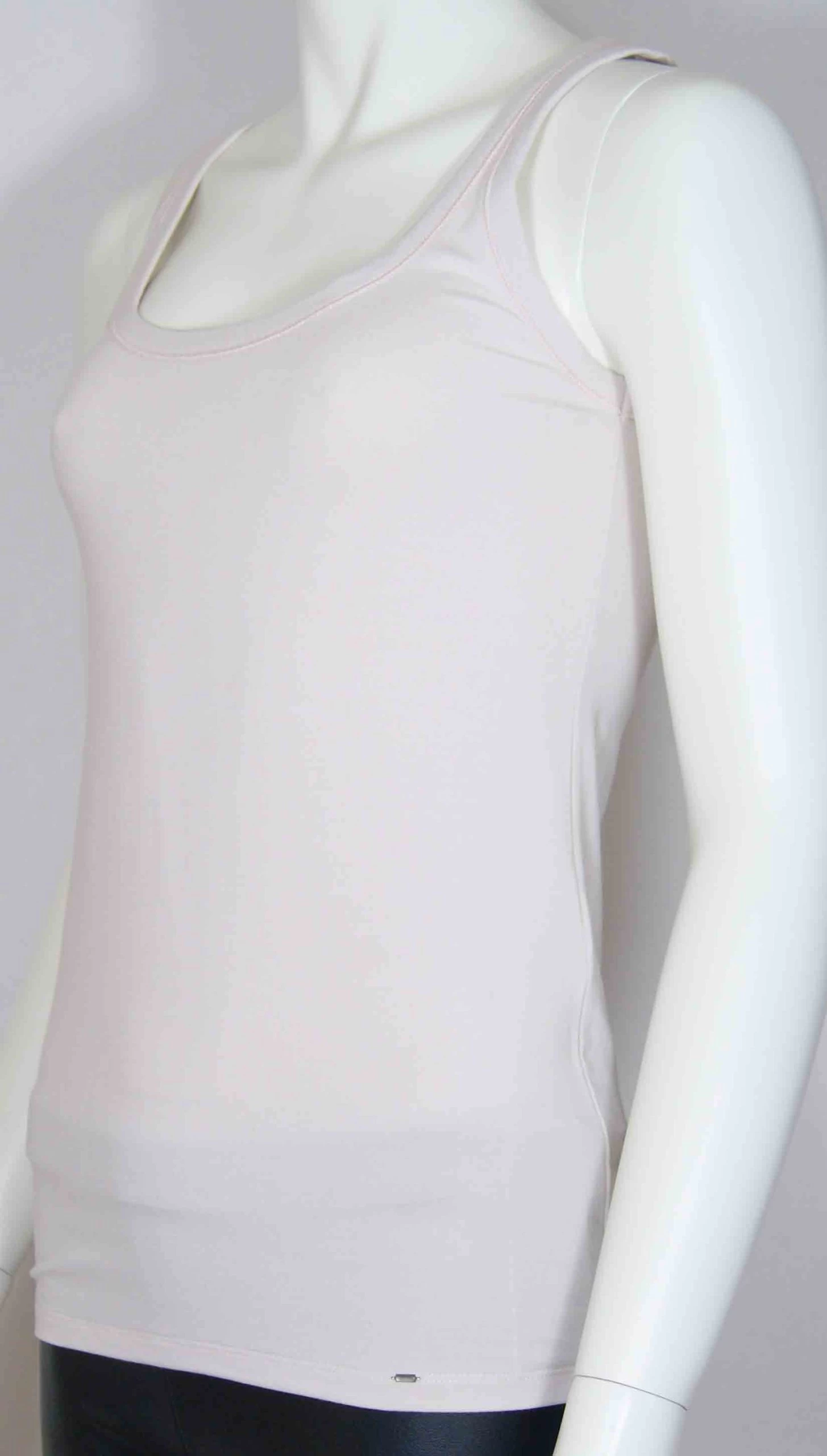 Een top van Marc Cain in de kleur poeder roze. De top heeft een ronde hals en een bies van 1.5 cm. De schouderbandjes zijn 3 cm breed.