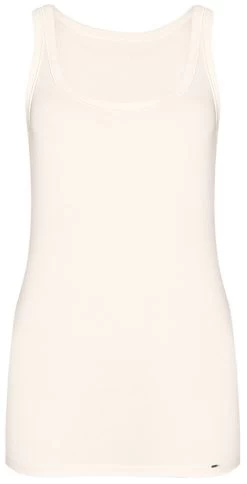Een basis top van het merk Marc Cain in de kleur écru. De viscose maakt dat de stof zeer zacht aanvoelt op de huid. De top heeft een ronde hals en is licht getailleerd. De schouderbandjes zijn 3 cm breed. Deze top mag op 30 graden worden gewassen.