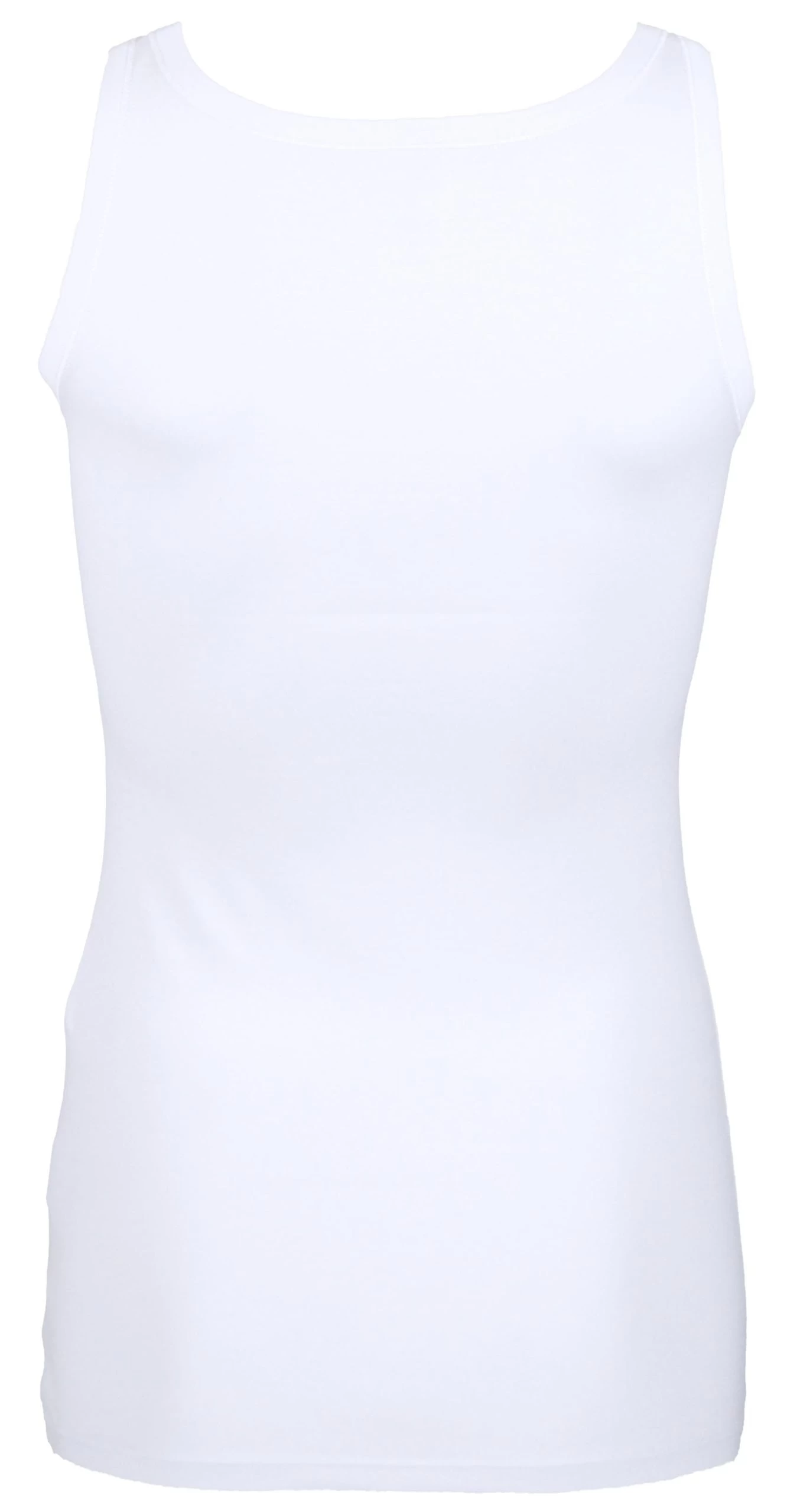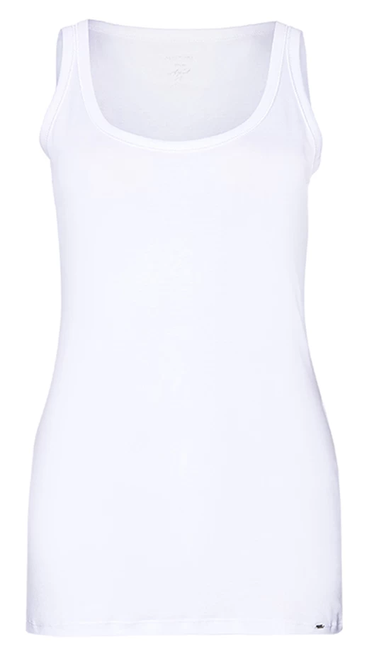 Een top van het merk Marc Cain uit de essentiels collectie in de kleur wit. De top heeft een ronde hals en een schouderband van 3 cm breed. Deze top mag op 30 graden worden gewassen.