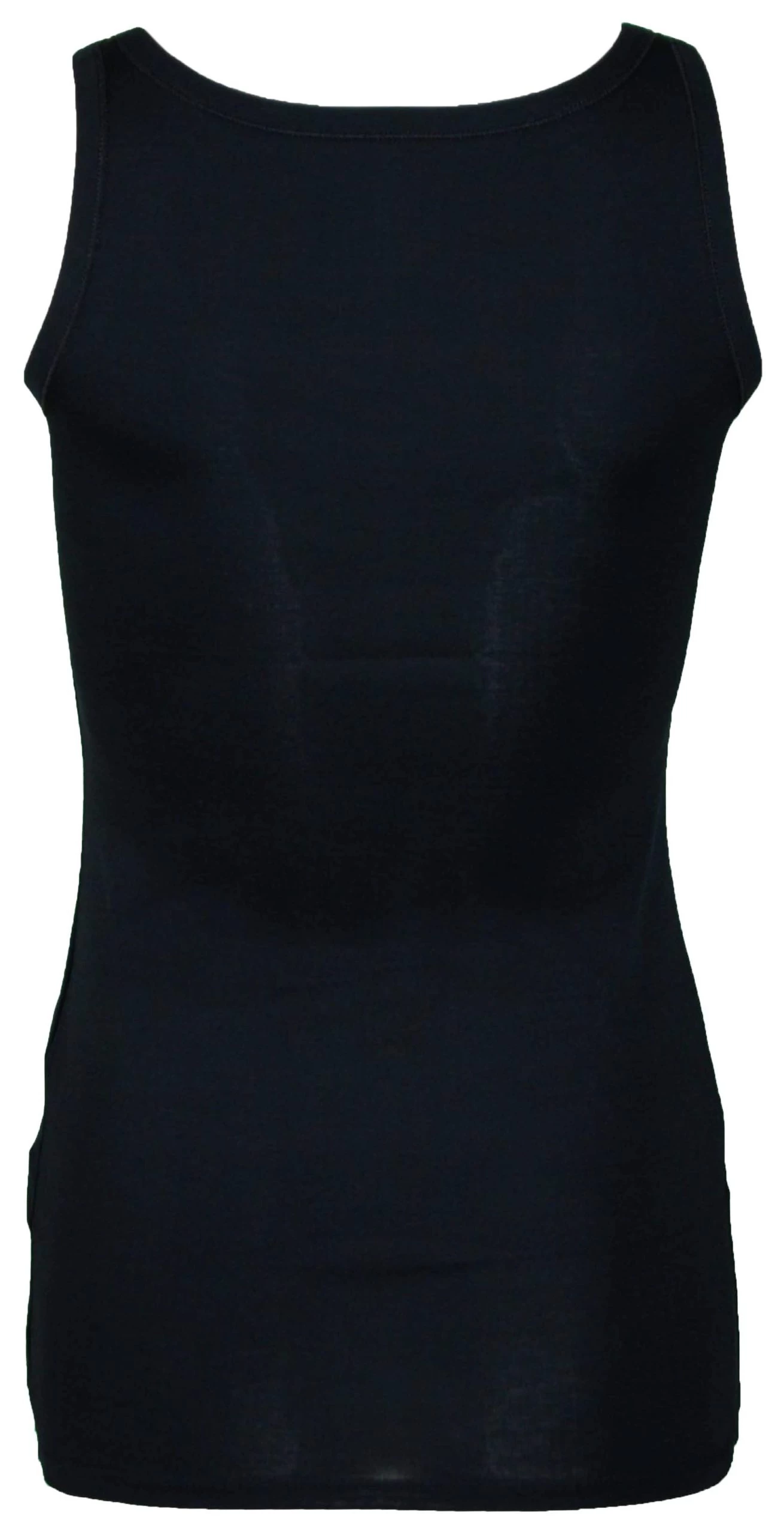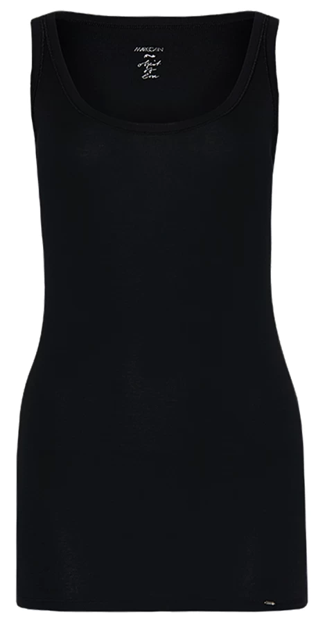 Een top van het merk Marc Cain uit de essentiels collectie in de kleur zwart. De top heeft een ronde hals en een schouderband van 3 cm breed. Deze top mag op 30 graden worden gewassen.