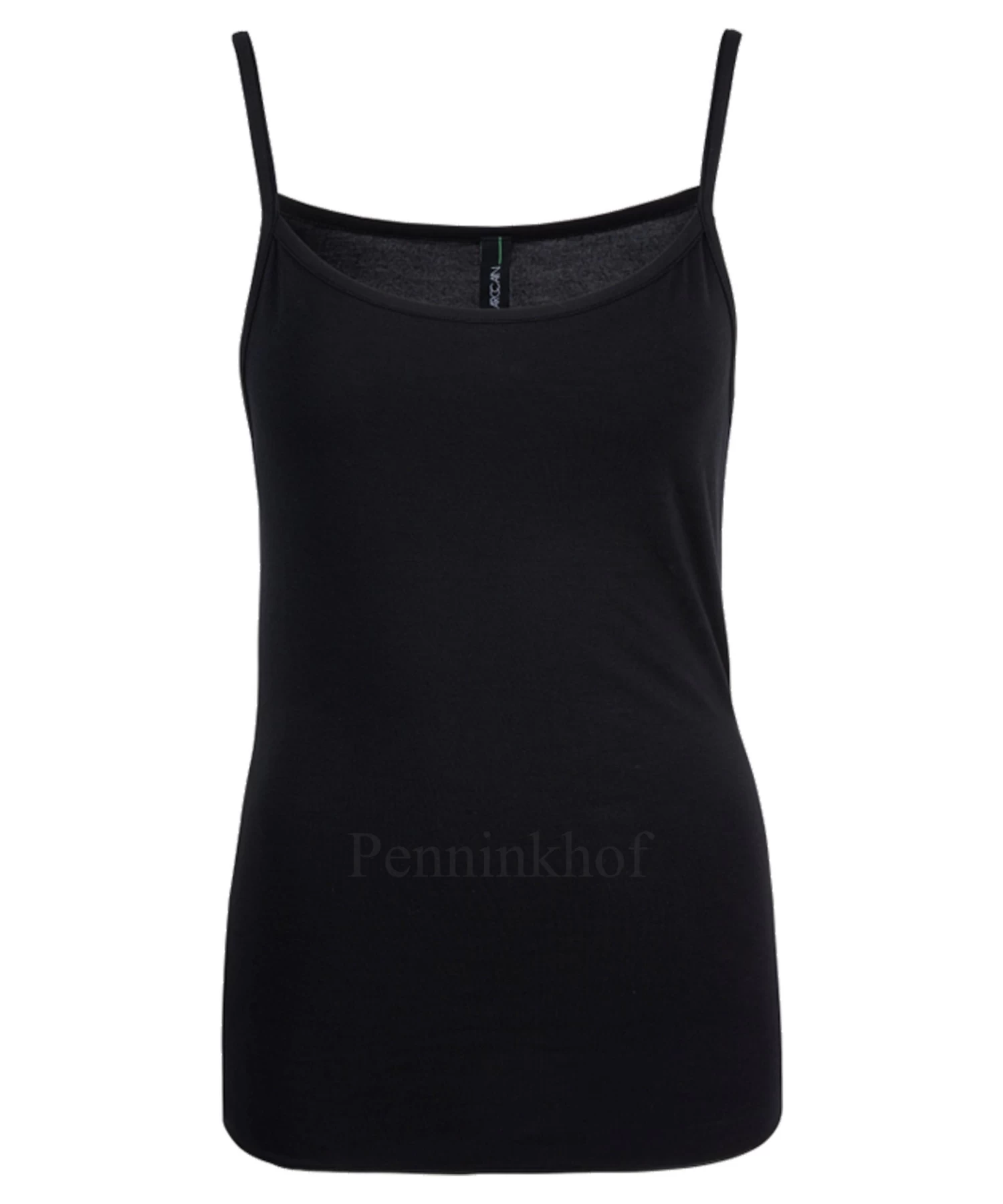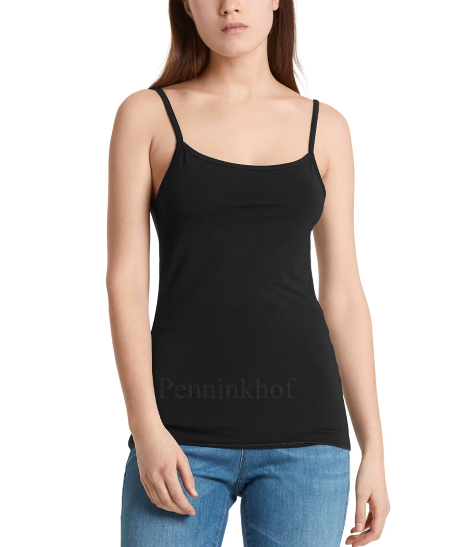 Een top van Marc Cain in de kleur zwart. De top heeft spaghettibandjes en mag op 30 graden worden gewassen.