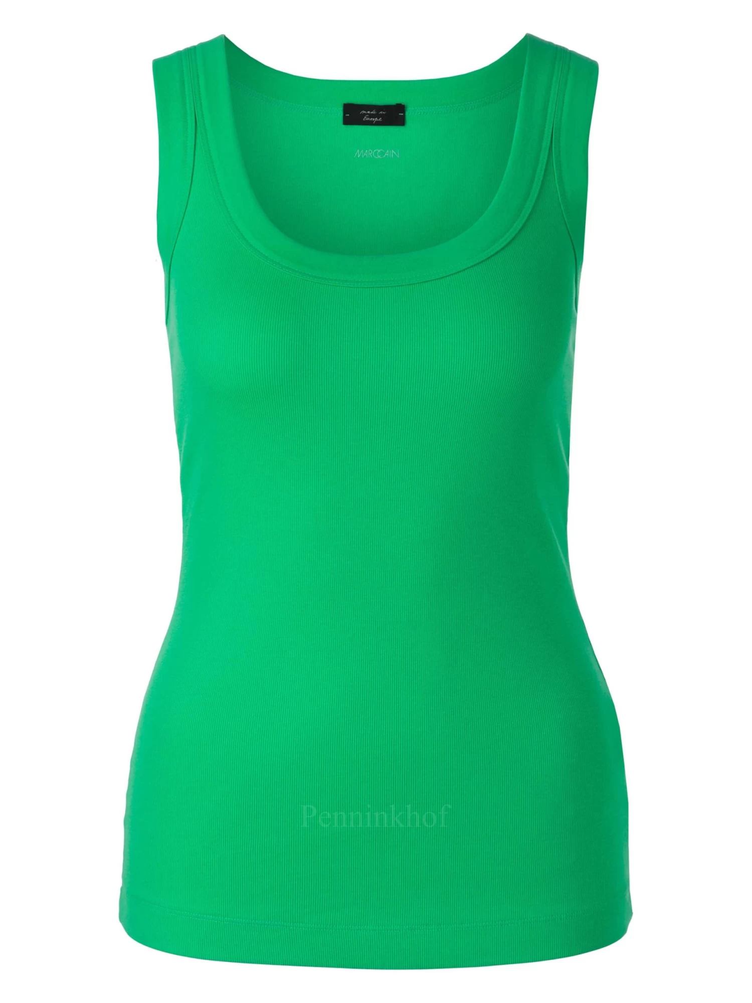 Een top van Marc Cain in een groene kleur. De top heeft een ronde hals en mag op 30 graden worden gewassen.