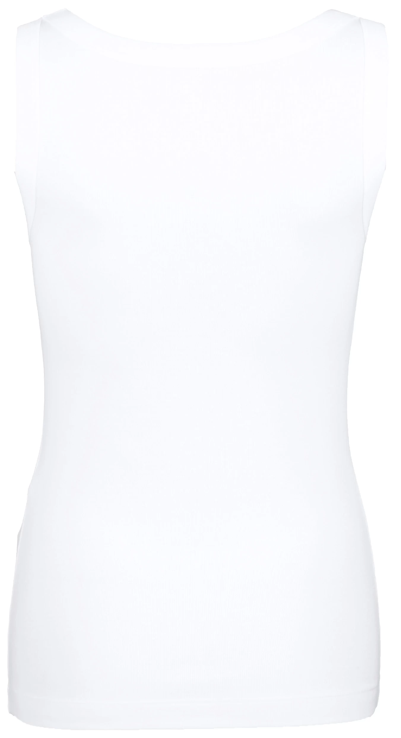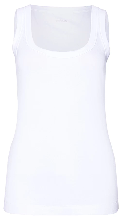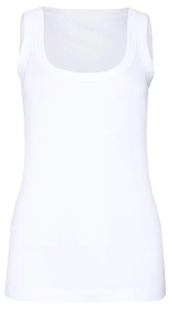 Een basis top van het merk Marc Cain essentiels in de kleur wit. De top heeft een ronde hals en is licht getailleerd. De schouderbandjes zijn 3 cm breed. Deze top mag op 30 graden worden gewassen.