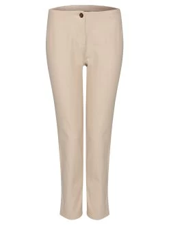 Een basis broek van het merk Marc Cain in de kleur zand. De broek heeft een verborgen ritssluiting met een knoop en de pijpen zijn los van het been. Deze broek mag op 30 graden worden gewassen.