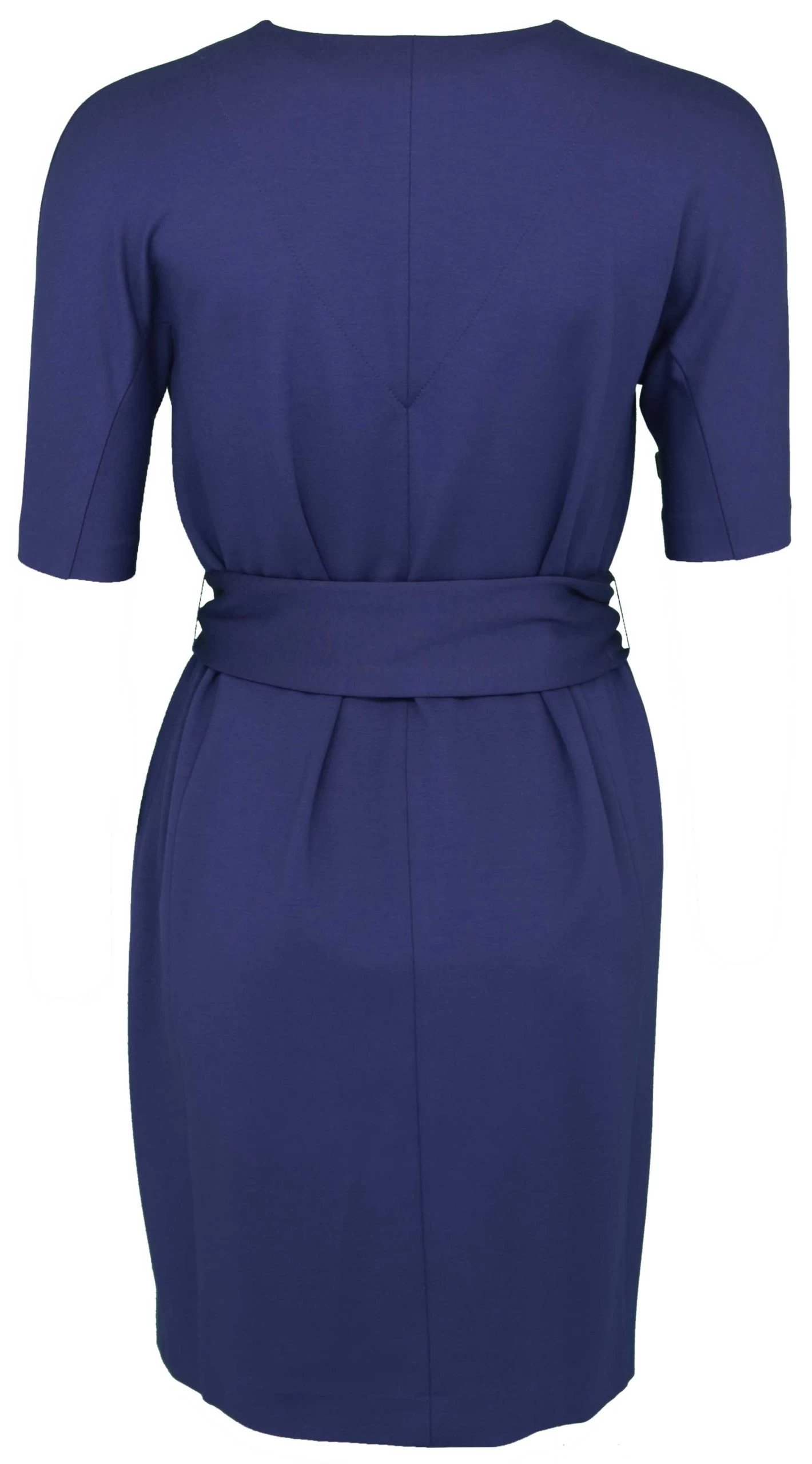 Een jurk van het merk Marc Cain in een indigo blauwe kleur. In de taille is vanuit de achterzijde een band naar voren welke met een knoop en 2 ronde messing ringen is bevestigd. De jurk heeft korte mouwen, een ronde hals en heeft een losse binnenvoering. Deze jurk mag op 30 graden worden gewassen.rn