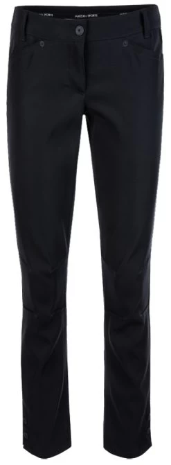 Een broek van het merk Marc Cain in de kleur marine blauw. De broek heeft steekzakken en vanaf de knie halve doorgestikte naden op 3 plaatsen. Aan de onderkant van de pijpen is een splitje met 2 knopen. Deze broek mag op 30 graden worden gewassen.