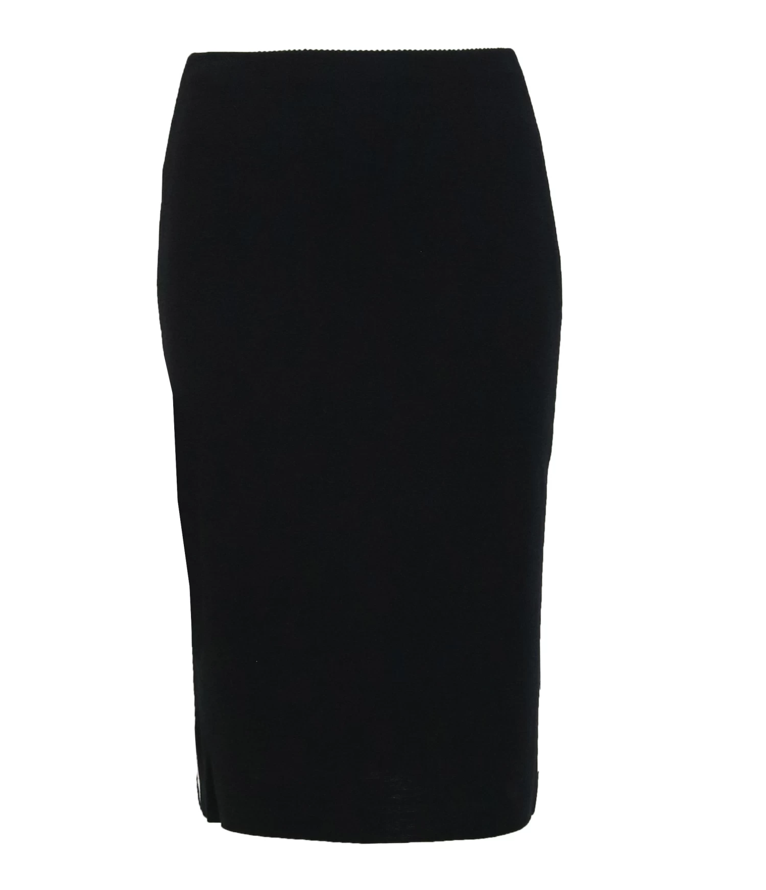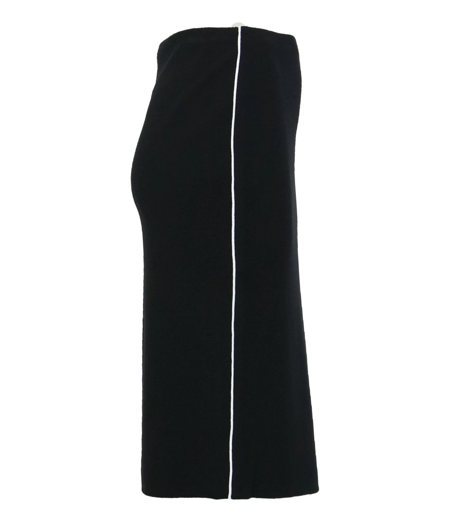 Een rok van Marc Cain in de kleur zwart. In de taille is een elastieken band. Langs de zijkanten is een witte bies. Deze rok mag op de hand worden gewassen.