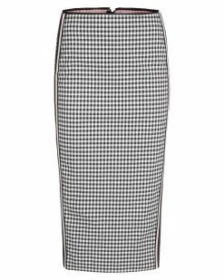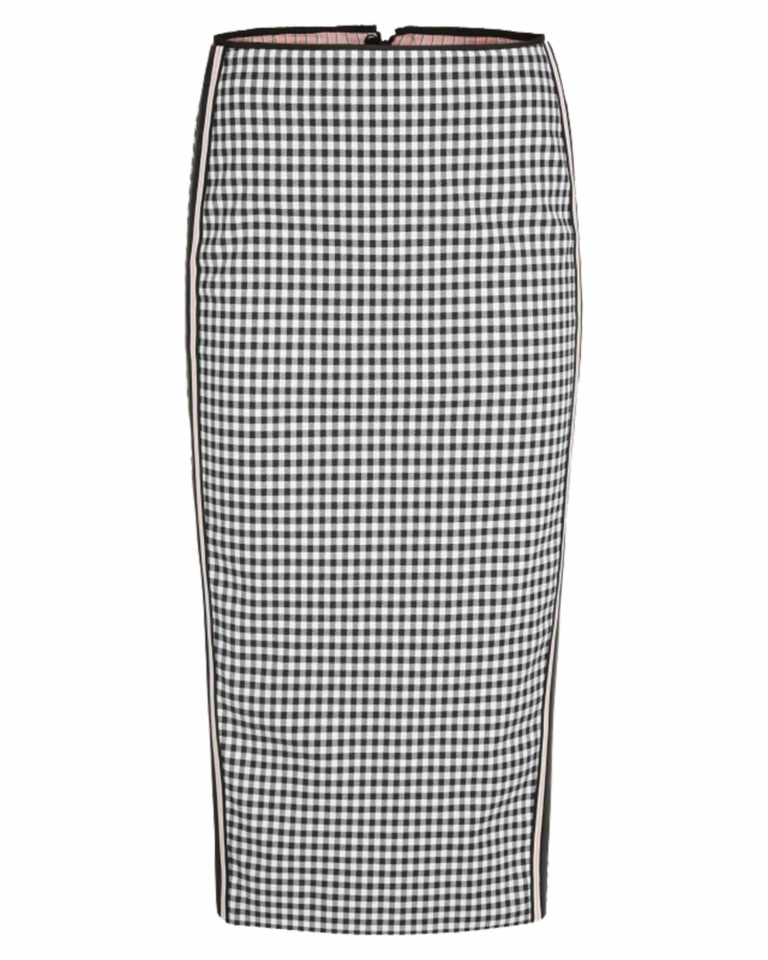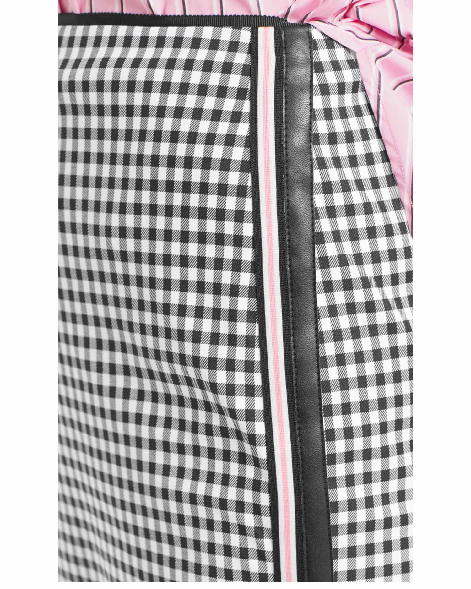 Een lange rok van Marc Cain in een ruitjes patroon met de kleuren zwart en wit. Aan beide zijden van de voorkant zijn biezen in zwart imitatieleder en een strepen patroon met de kleuren pastel roze en wit. Aan de achterzijde is in het midden een rits met een decoratieve bies in zwart imitatieleder. De rok is gevoerd met een voering in een strepen patroon met de kleuren pastel roze, zwart en wit. Deze rok mag op 30 graden worden gewassen.