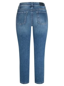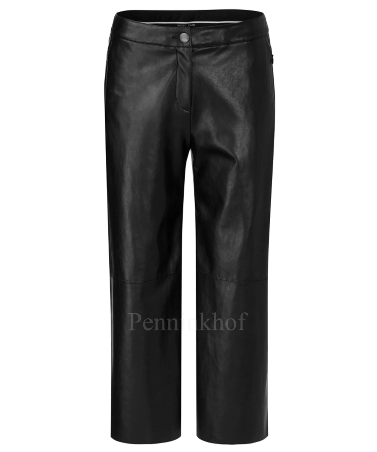 Een imitatie lederen broek van Marc Cain in de kleur zwart. De pijpen zijn recht gesneden. De steekzakken hebben een ritssluiting. Ter hoogte van de knie is een horizontale stiknaad. deze broek mag op 30 graden worden gewassen.