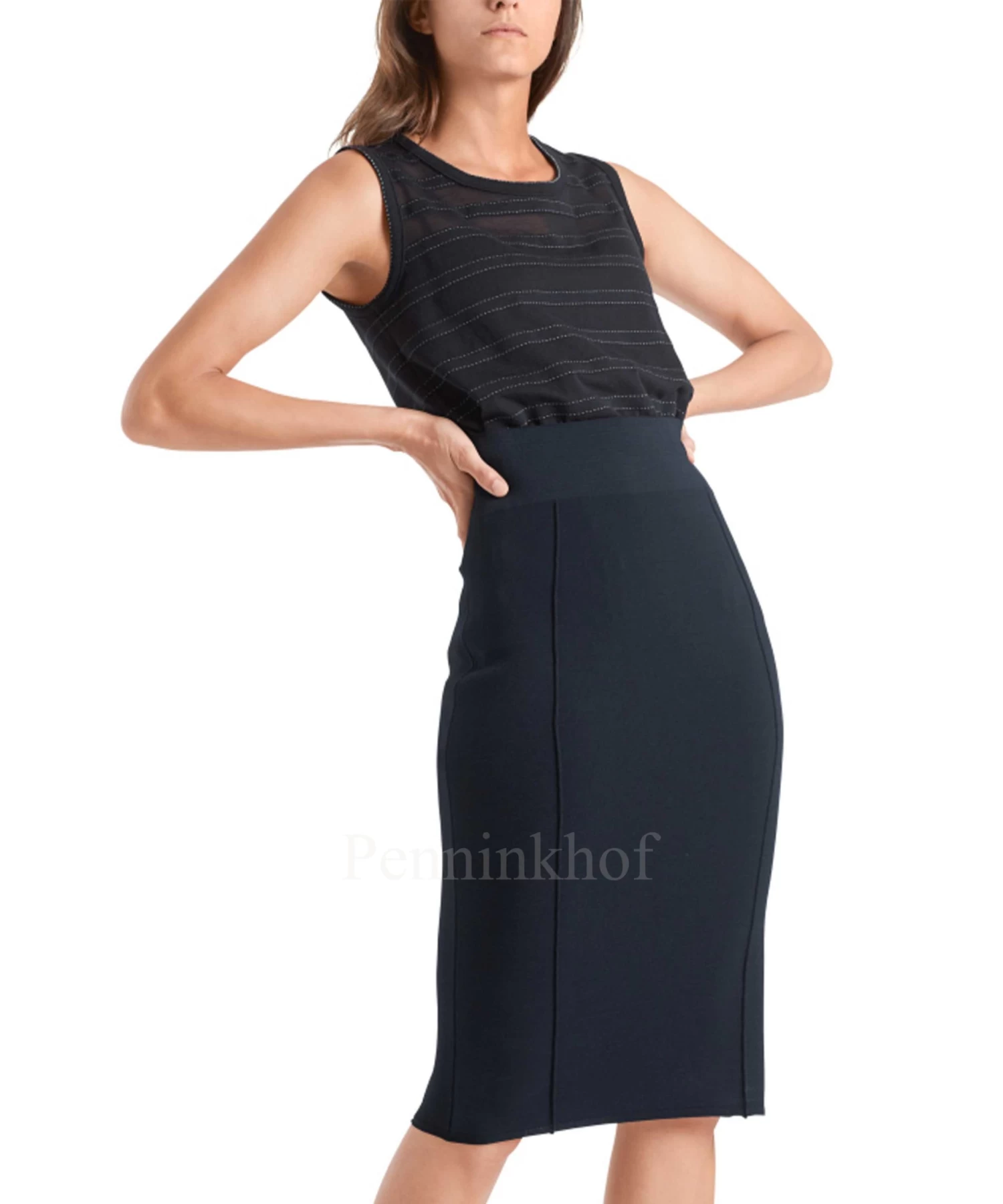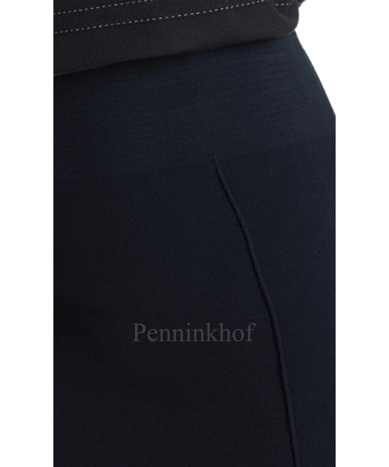 Een tricot rok van Marc Cain in de kleur marineblauw. De brede tricot tailleband is fijn geribbeld. De rok is ongevoerd en mag op 30 graden worden gewassen.