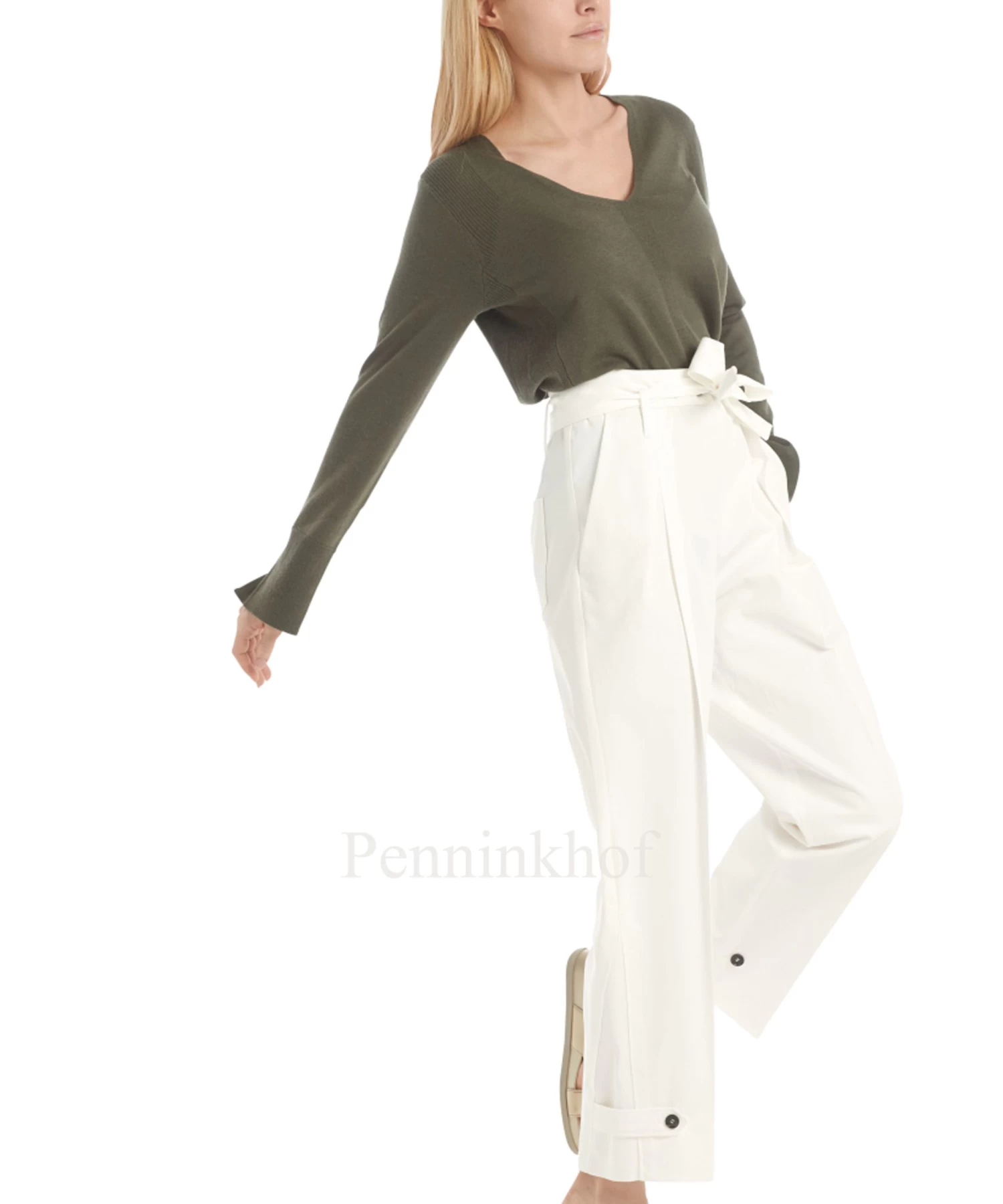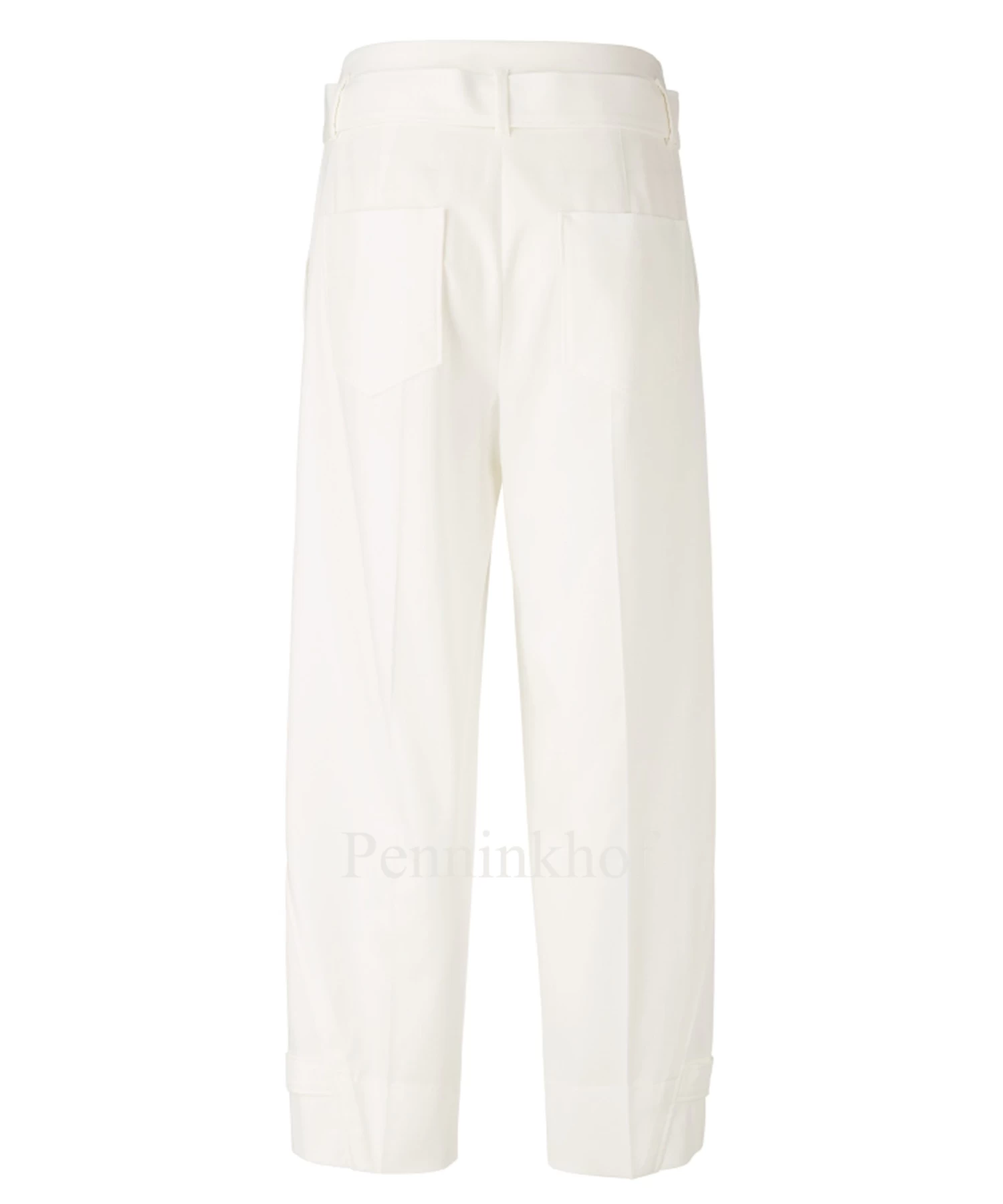 Een broek van Marc Cain in de kleur wit. In de taille is een ceintuur in dezelfde stof als de broek. Aan de onderkant van de pijpen is aan de zijkant een bandje met een verstelbare knoop. De broek heeft steekzakken en mag op 30 graden worden gewassen.