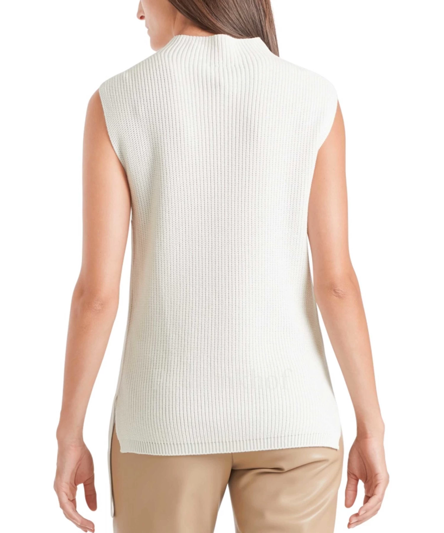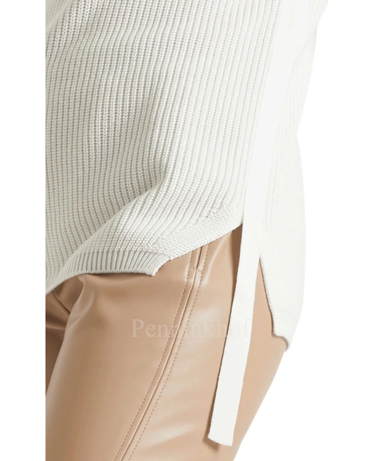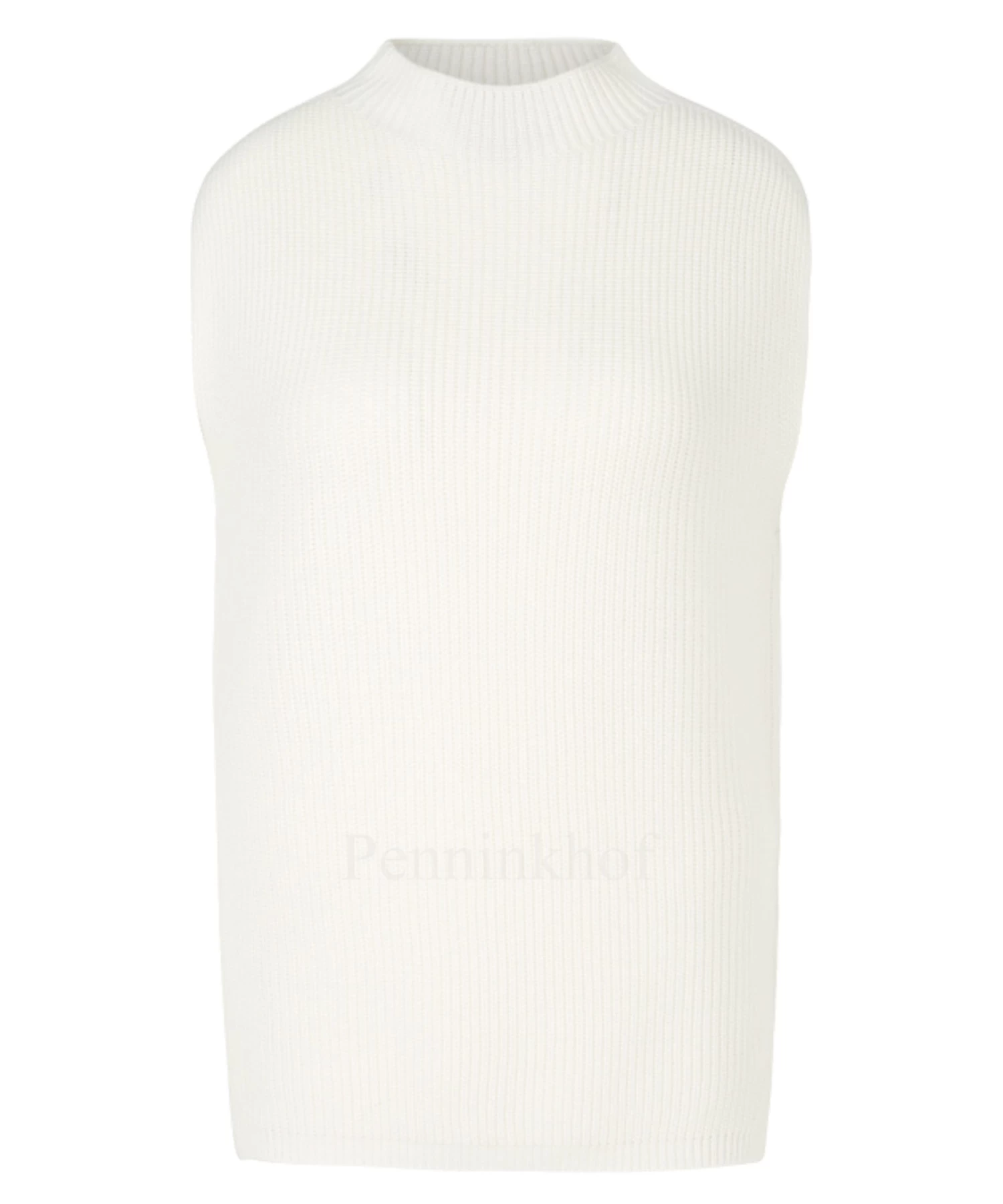 Een gebreide top van Marc Cain in de kleur roomwit. De top heeft een turtle hals en aan de onderkant zijn korte splitten aan de zijkanten. Aan de linker onderkant is een kort decoratief lint. Deze top mag op 30 graden worden gewassen.
