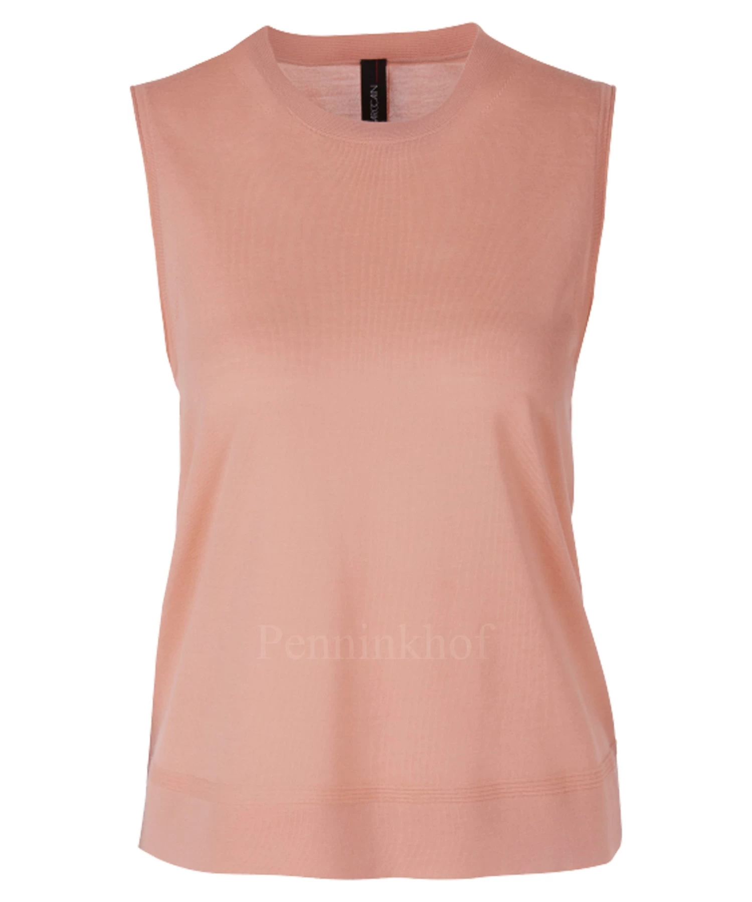 Een gebreide top van Marc Cain in een zalmkleur. Langs de ronde hals is een fijn geribbelde bies. Deze top mag op de hand worden gewassen.