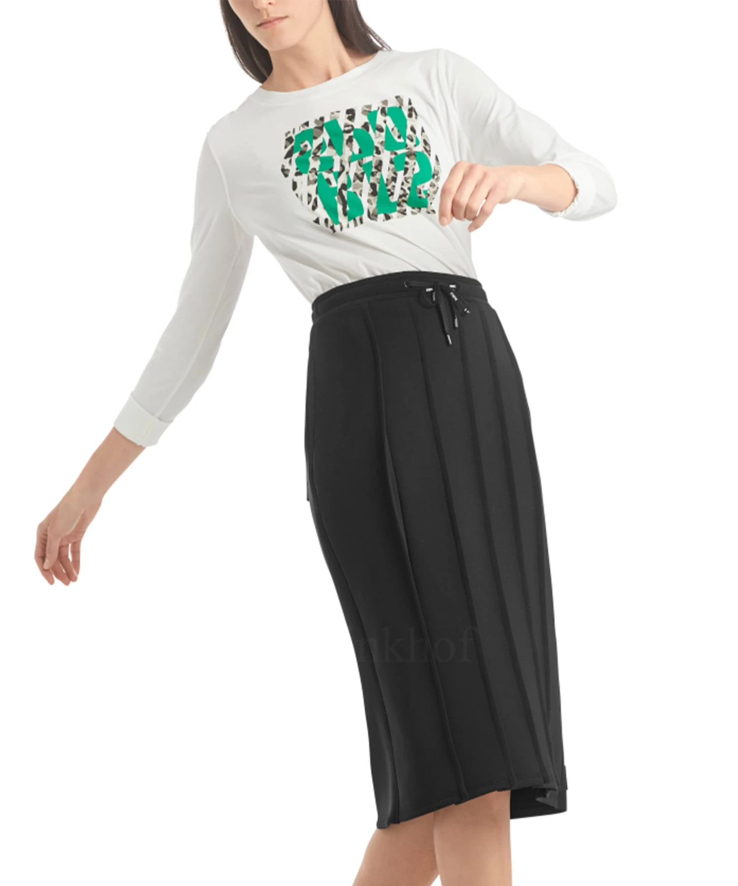 Een rok van Marc Cain in een plissé look in de kleur zwart. In de taille is een elastieken band met een koord verwerking. De rok heeft steekzakken en mag op 30 graden worden gewassen.