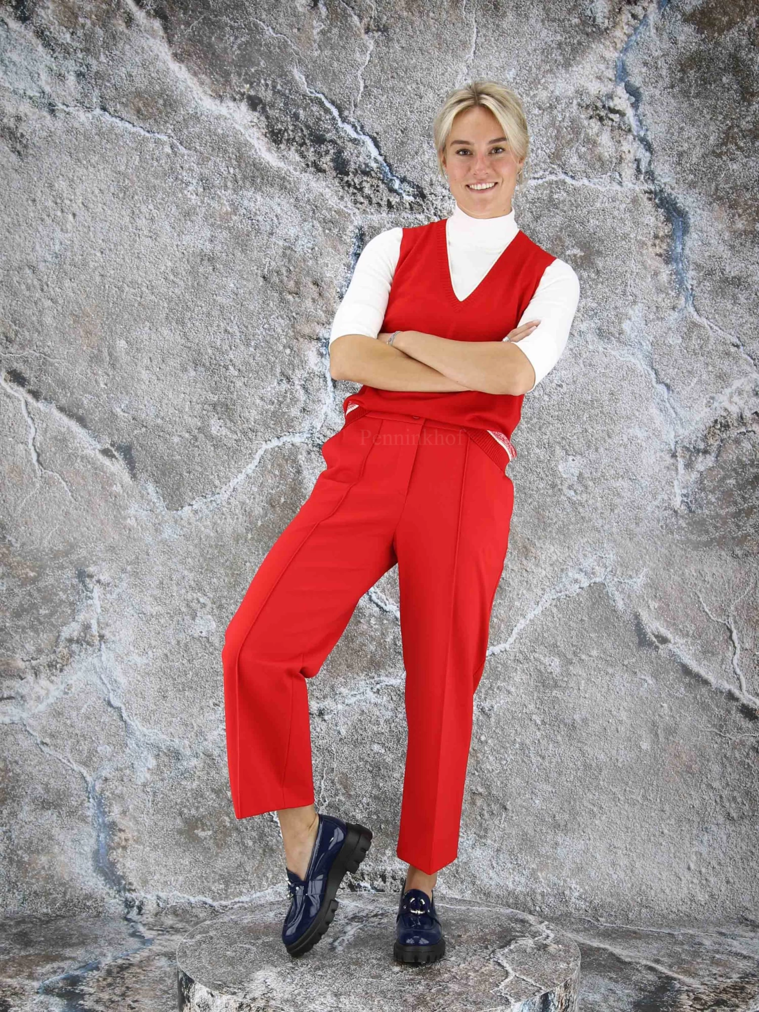 Een top van Marc Cain in de kleur rood. De top heeft een V – Hals. Langs rand van de halslijn is een geprinte witte bies. Aan de onderkant is een fijn geribbelde tricot bies met een strepen patroon in de kleur wit. Deze top mag op 30 graden worden gewassen.