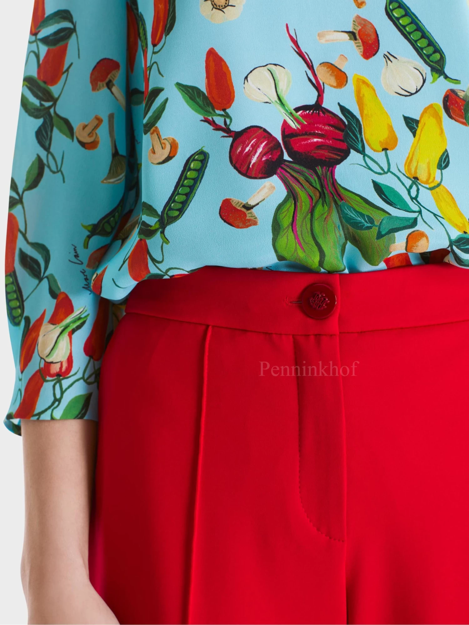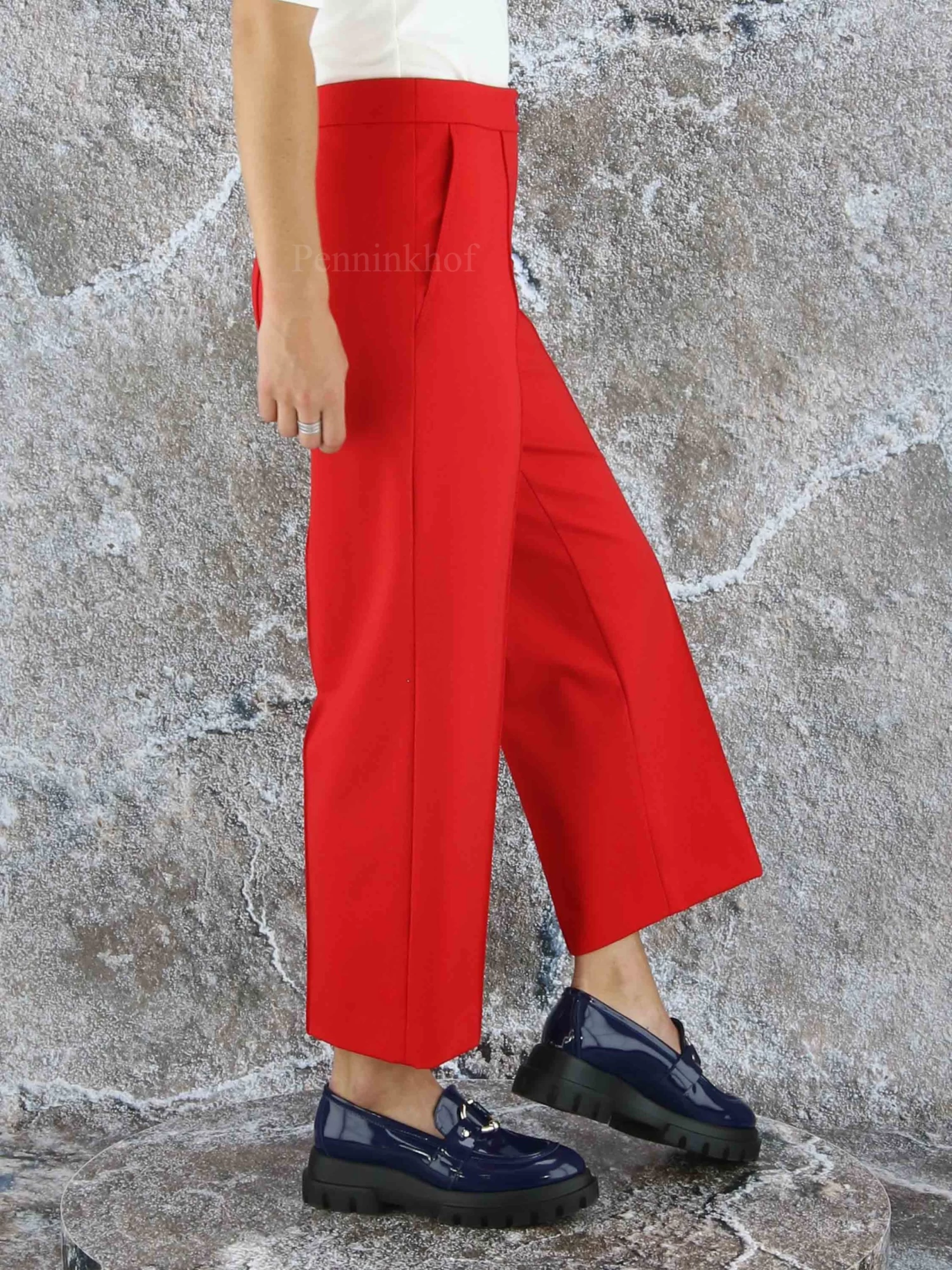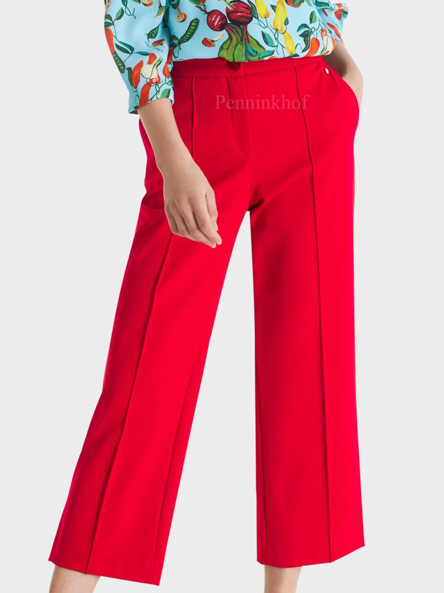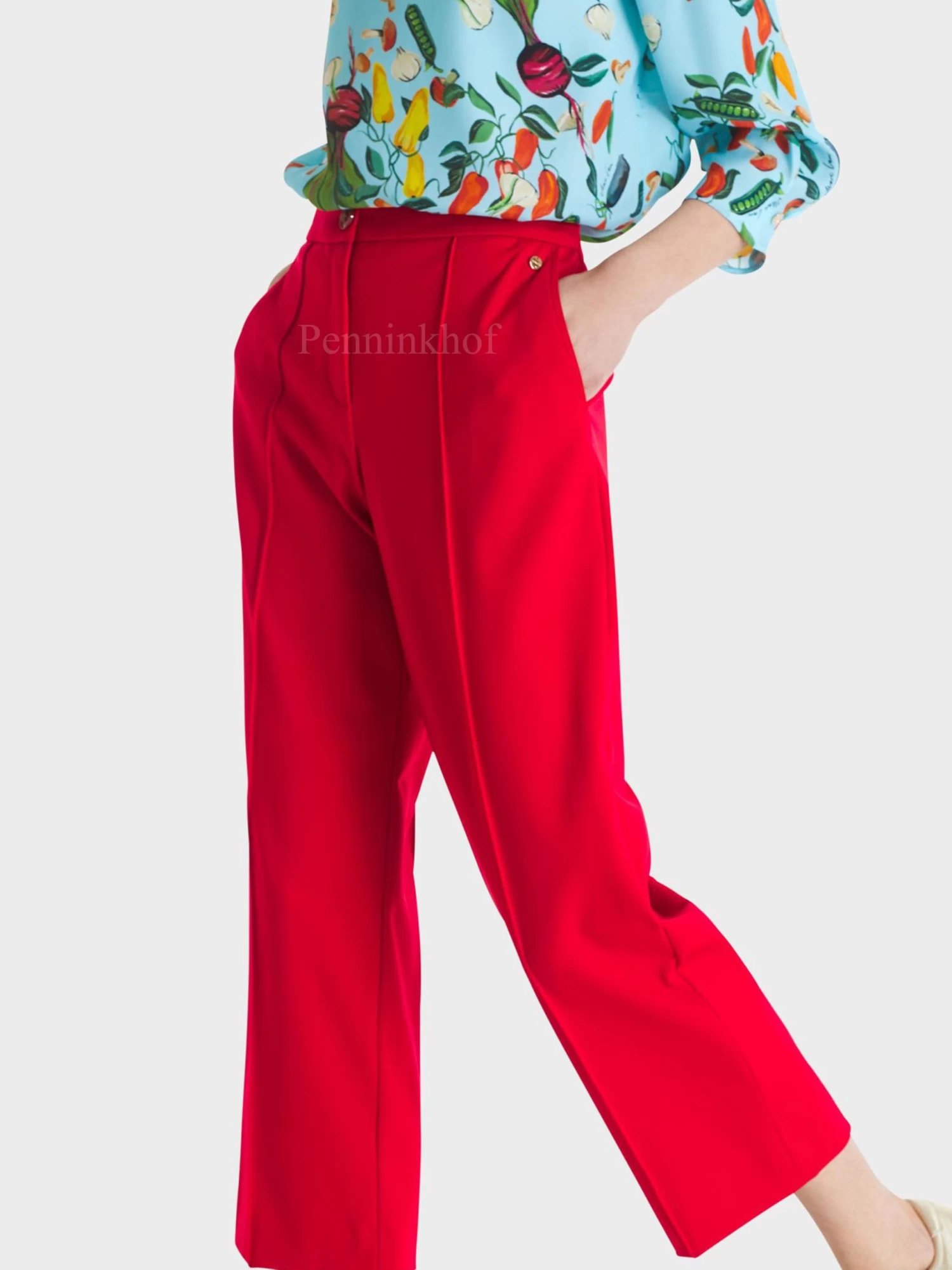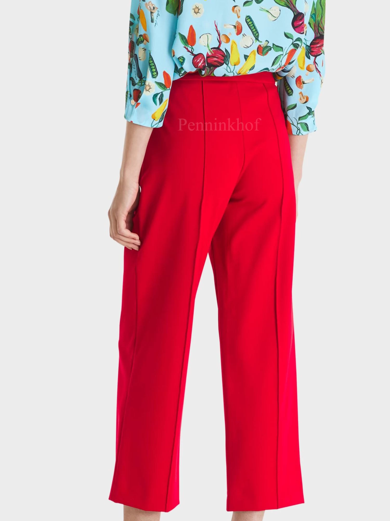 Een broek van Marc Cain in een rode kleur. De broek heeft steekzakken en in het midden van de pijpen is een doorgestikte naad. Deze broek mag op 30 graden worden gewassen.