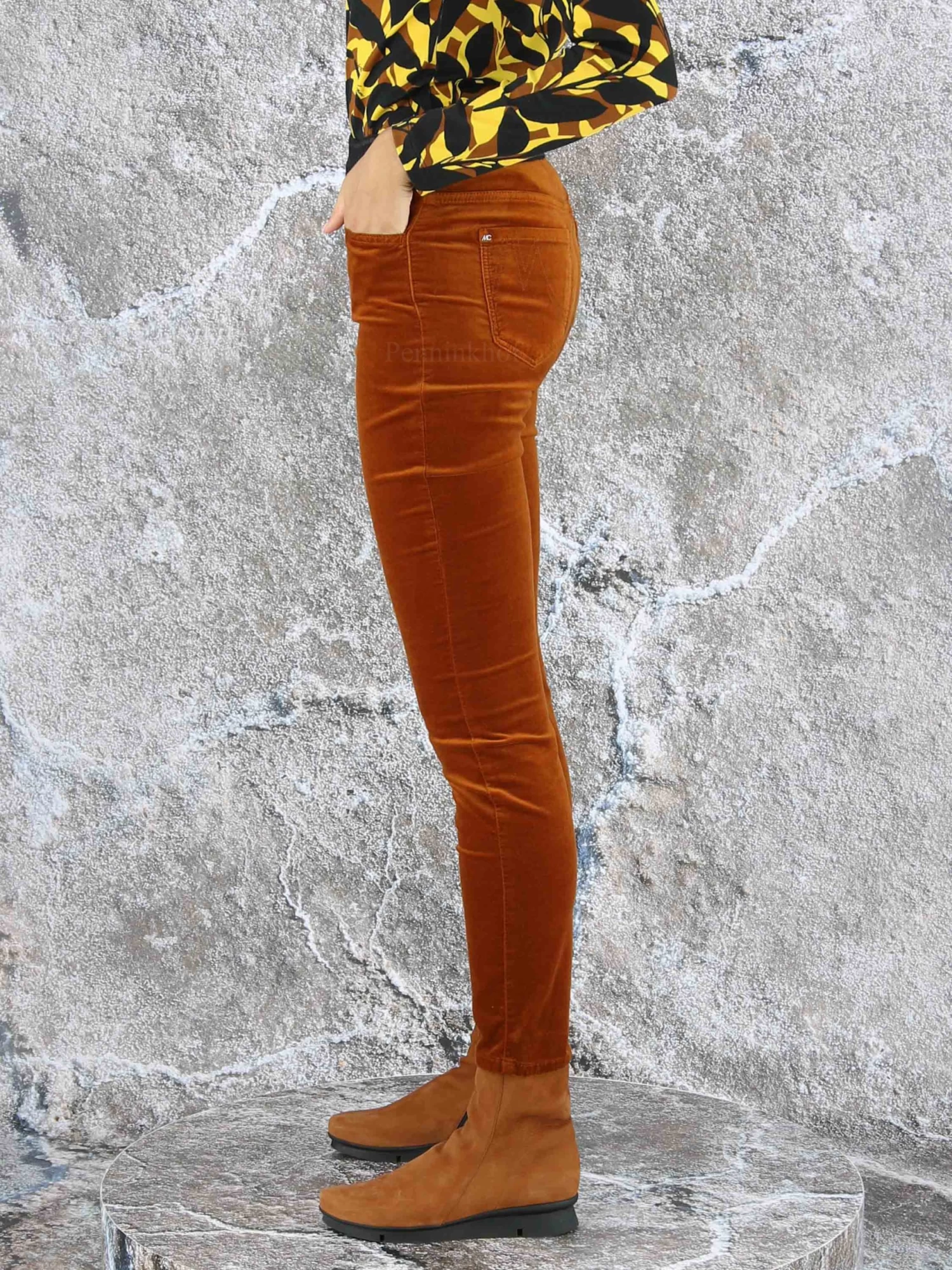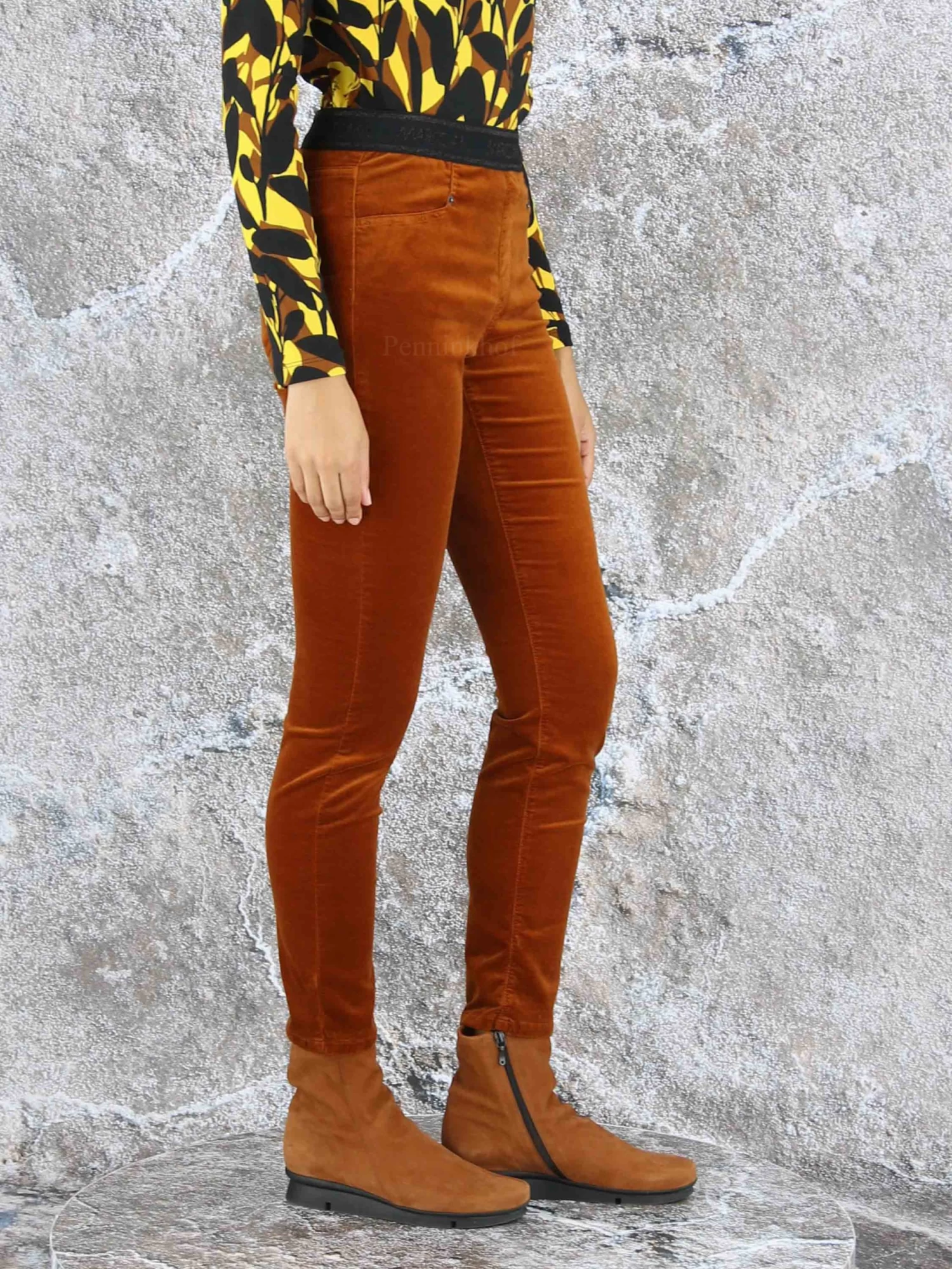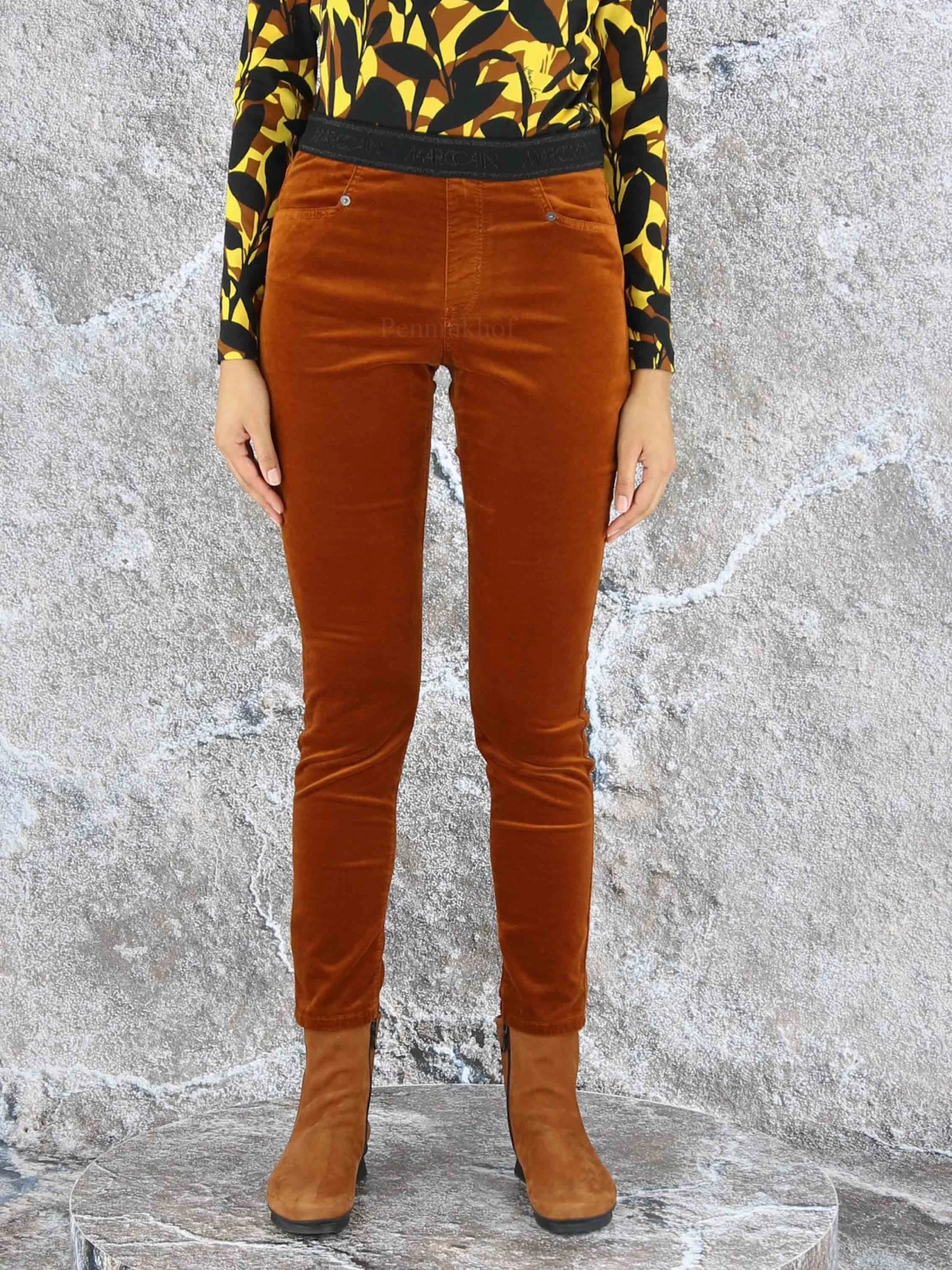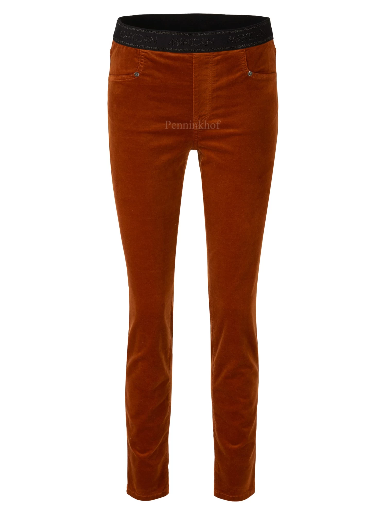 Een broek van Marc Cain in de kleur cognac. In de taille is een zwarte elastieken band met de tekst “Marc Cain” . Deze broek mag op 30 graden worden gewassen.