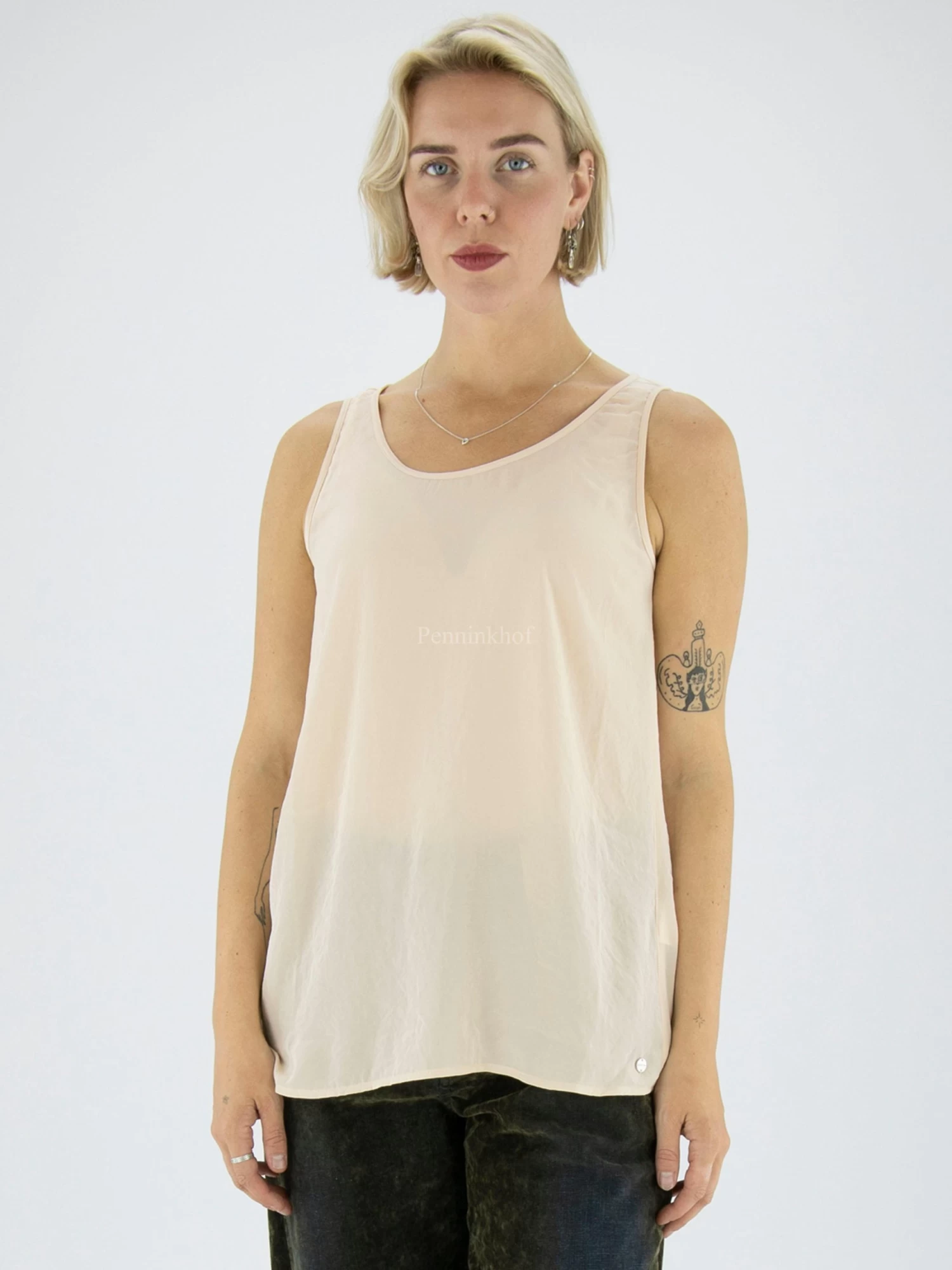 Een top van Marc Cain in een matte gladde stof in de kleur zand. De top heeft een ronde hals en mag op 30 graden worden gewassen.