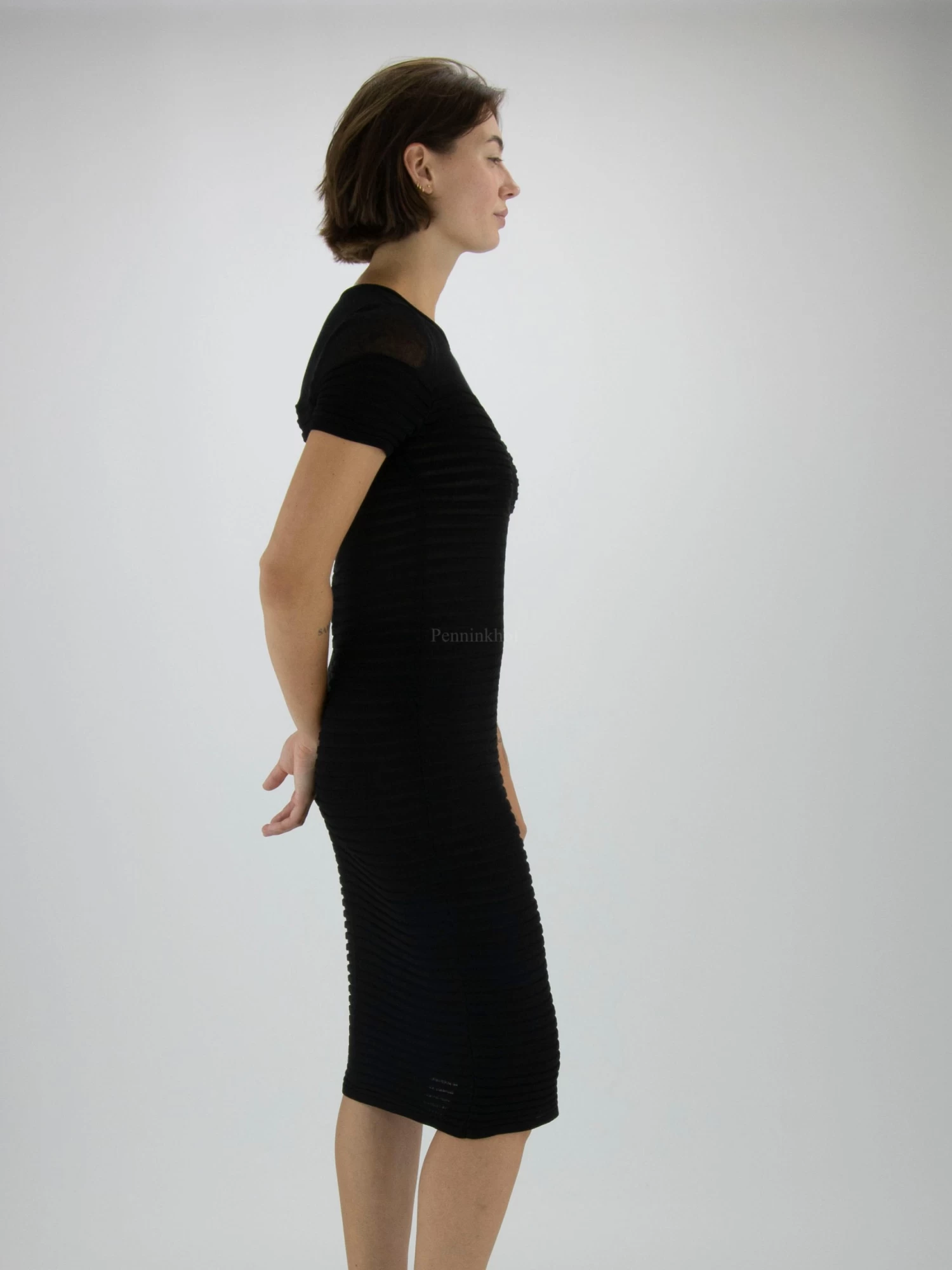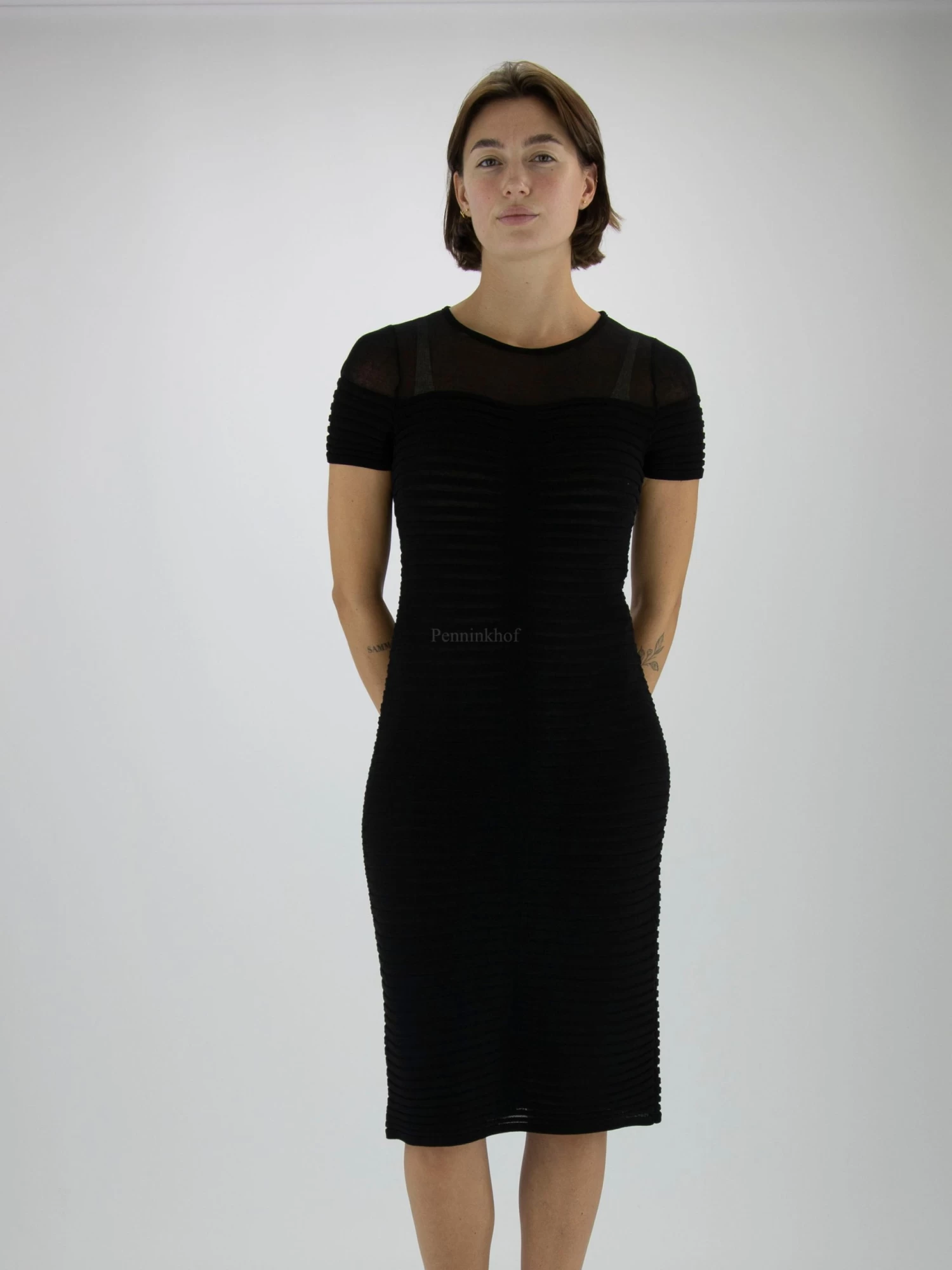 Een licht transparante jurk van Marc Cain in de kleur zwart. Boven de buste is de stof transparant en vanaf de buste is de stof in een strepen structuur die deels licht transparant is. Deze jurk mag op 30 graden worden gewassen.